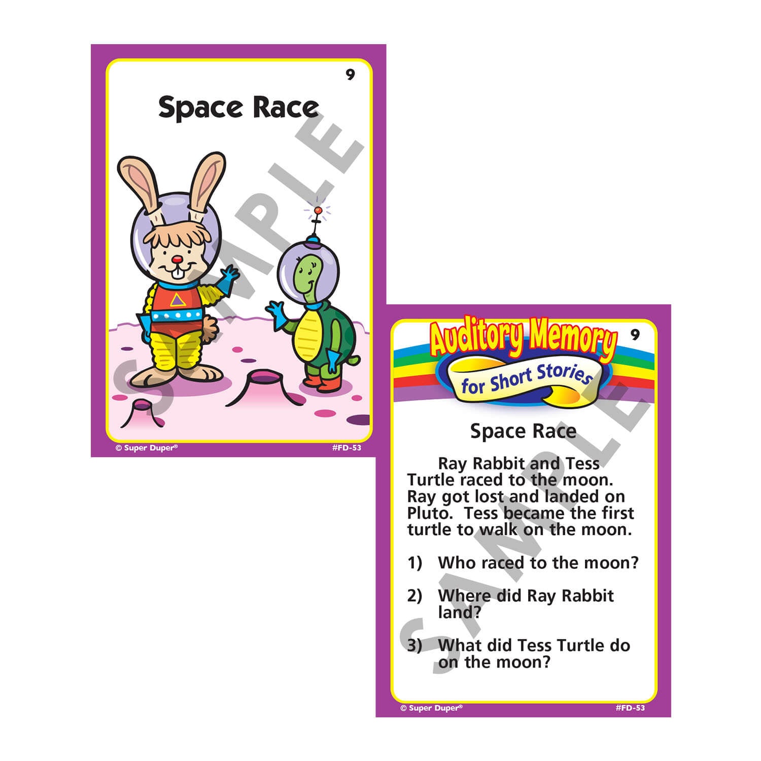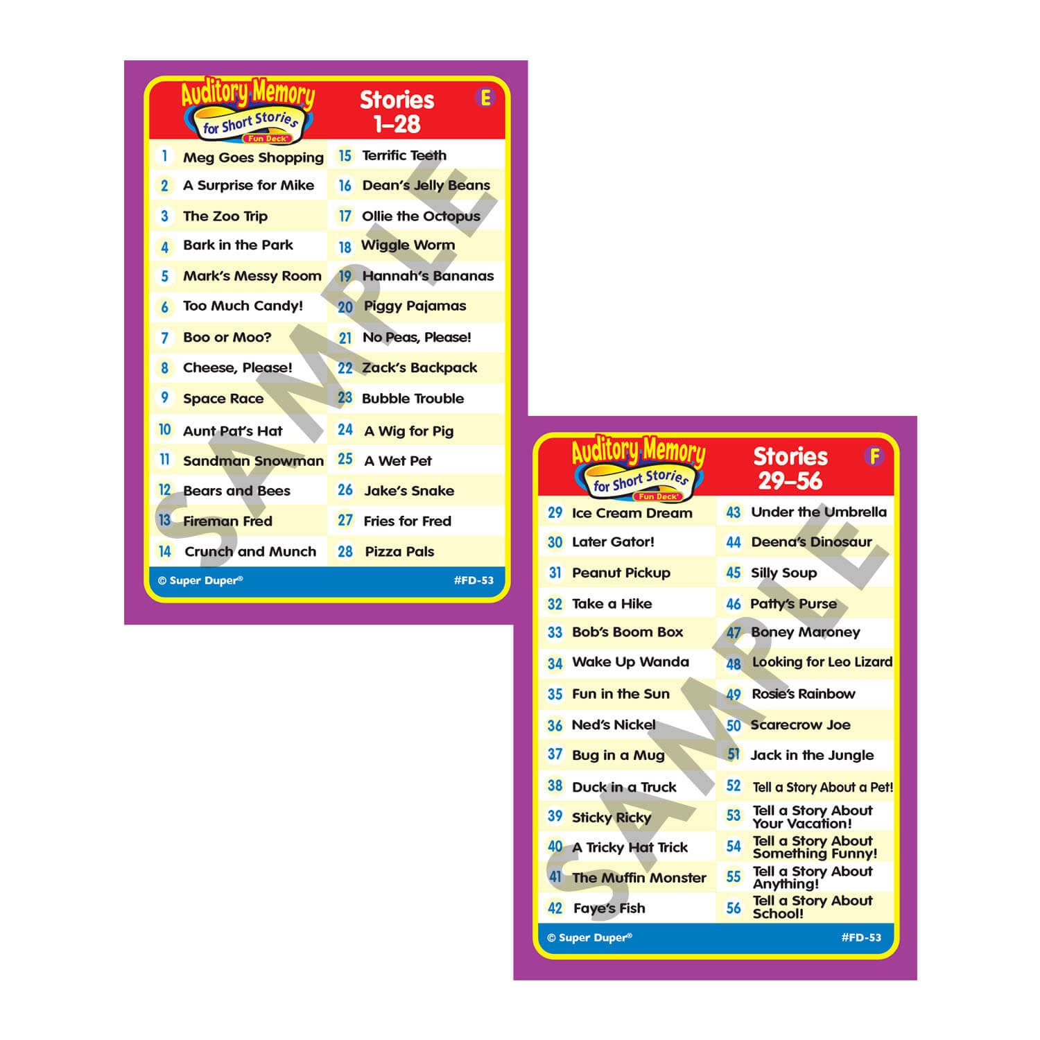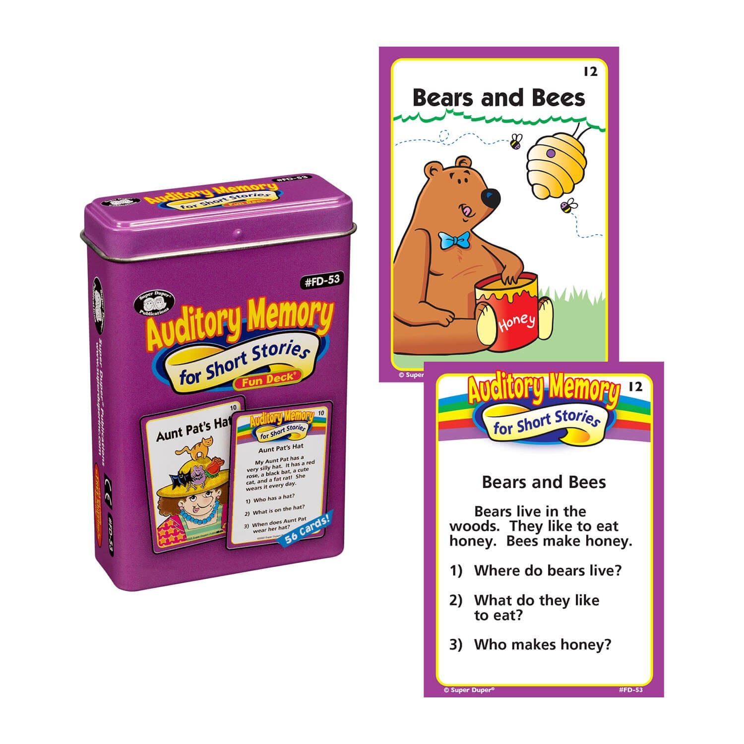 Listen to short, silly stories like "Aunt Pat's Hat," "Hannah's Bananas," or "Ollie the Octopus"—and then answer questions about each story. One side shows the picture and story title, and the other side has the story and three questions for children to answer. These 51 illustrated cards provide a novel approach to improving your students' auditory memory skills. As a special bonus, the deck has game ideas and five open-ended "Wh" topic picture cards to help children make up their own stories and questions.