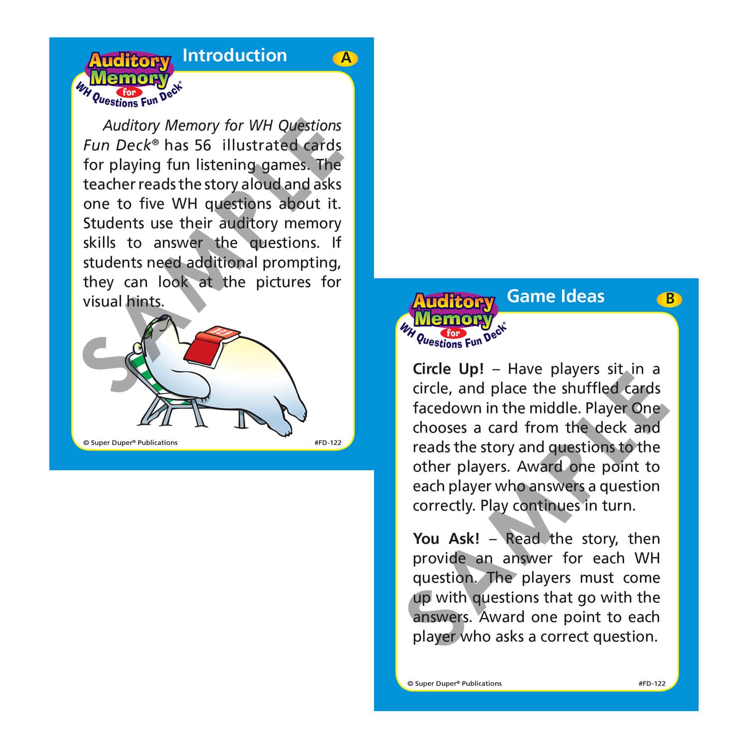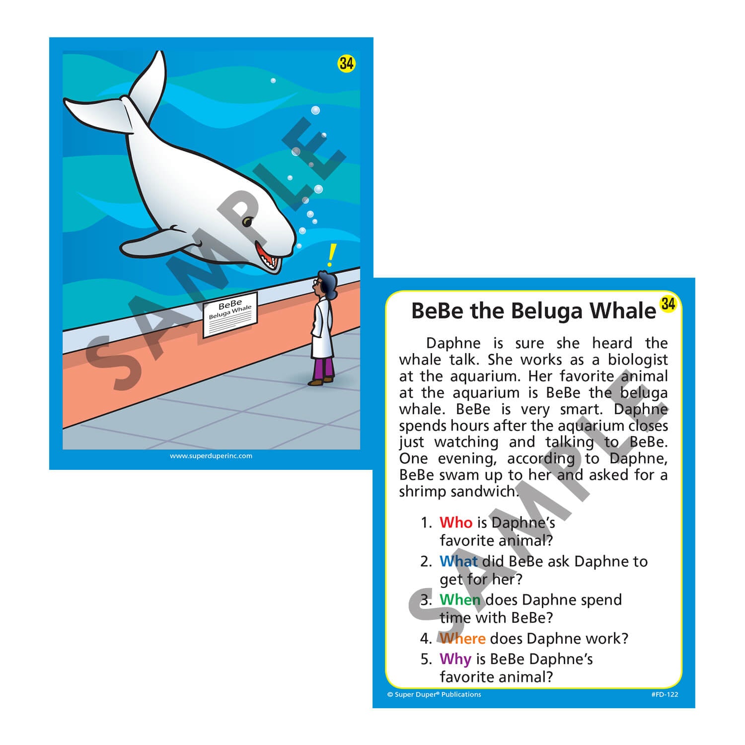Your students will love listening to fun, short stories like "Spooky School" and "Pirate's Houseboat," and then answering WH questions about them! These 56 imaginative, illustrated cards have a short story and five WH questions - who, what, when, where, and why. Students use their auditory memory skills to answer questions like, "Who found gold in Gold Mountain?" and "Why did Principal Ghostly nearly faint?" You must listen to find out!