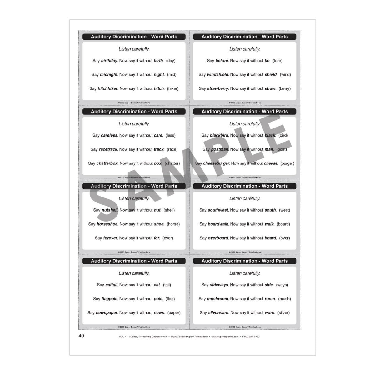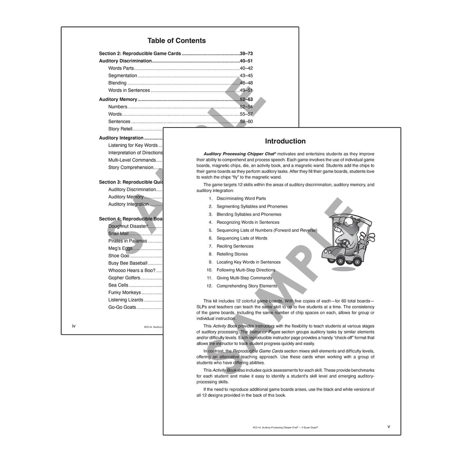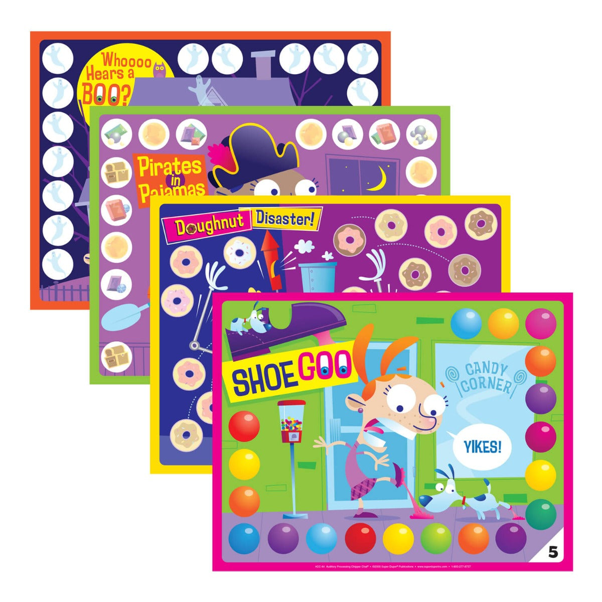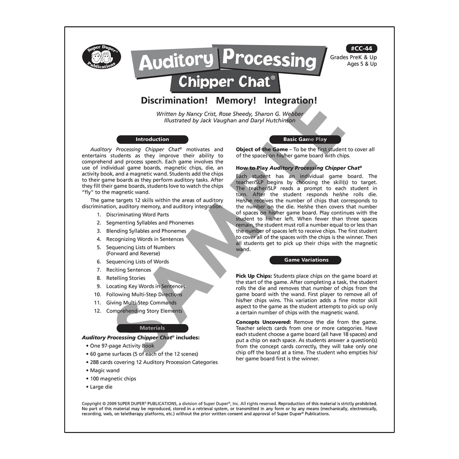 Auditory Processing Chipper Chat includes 12 colorful, laminated game board scenes (60 total boards) and 288 cards covering 12 Auditory Processing Categories. The 97-page activity book gives you the flexibility to engage students at various stages of auditory processing and includes reproducible black-and-white versions of the game cards and board designs.