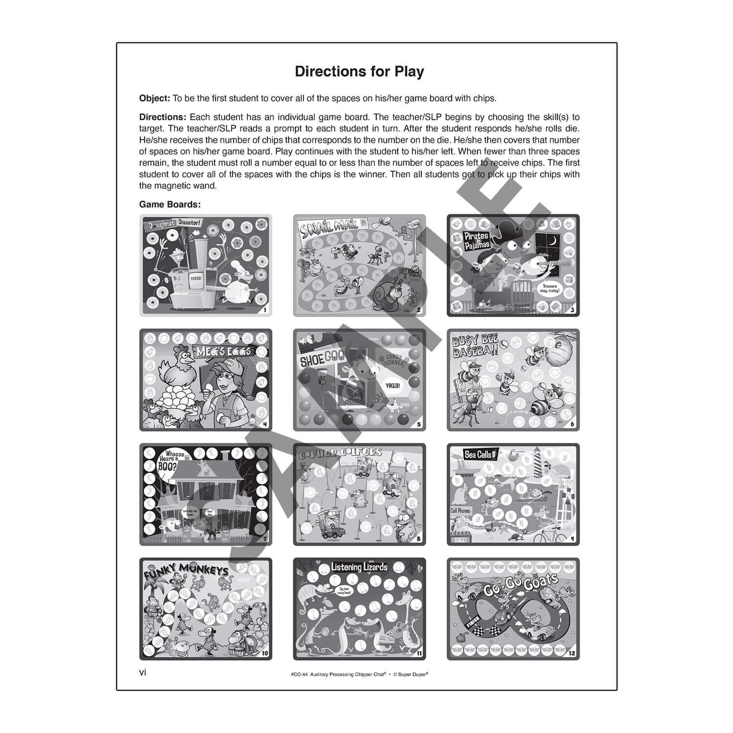 The activity book also provides quick assessments for each skill—making it easy to identify emerging auditory processing skills. Use the duplicate black and white versions of all 12 game board designs at the back of the book for additional players or home practice.