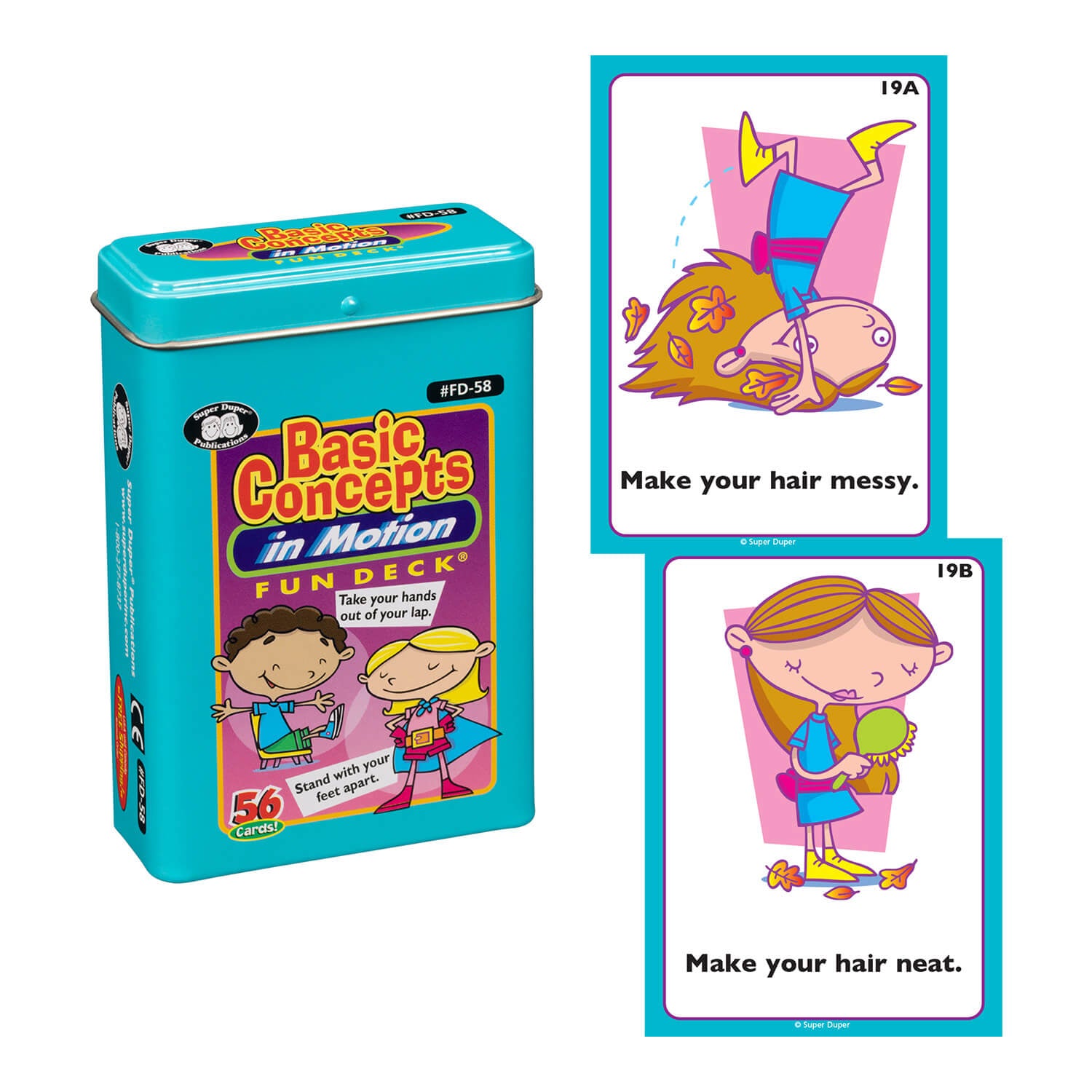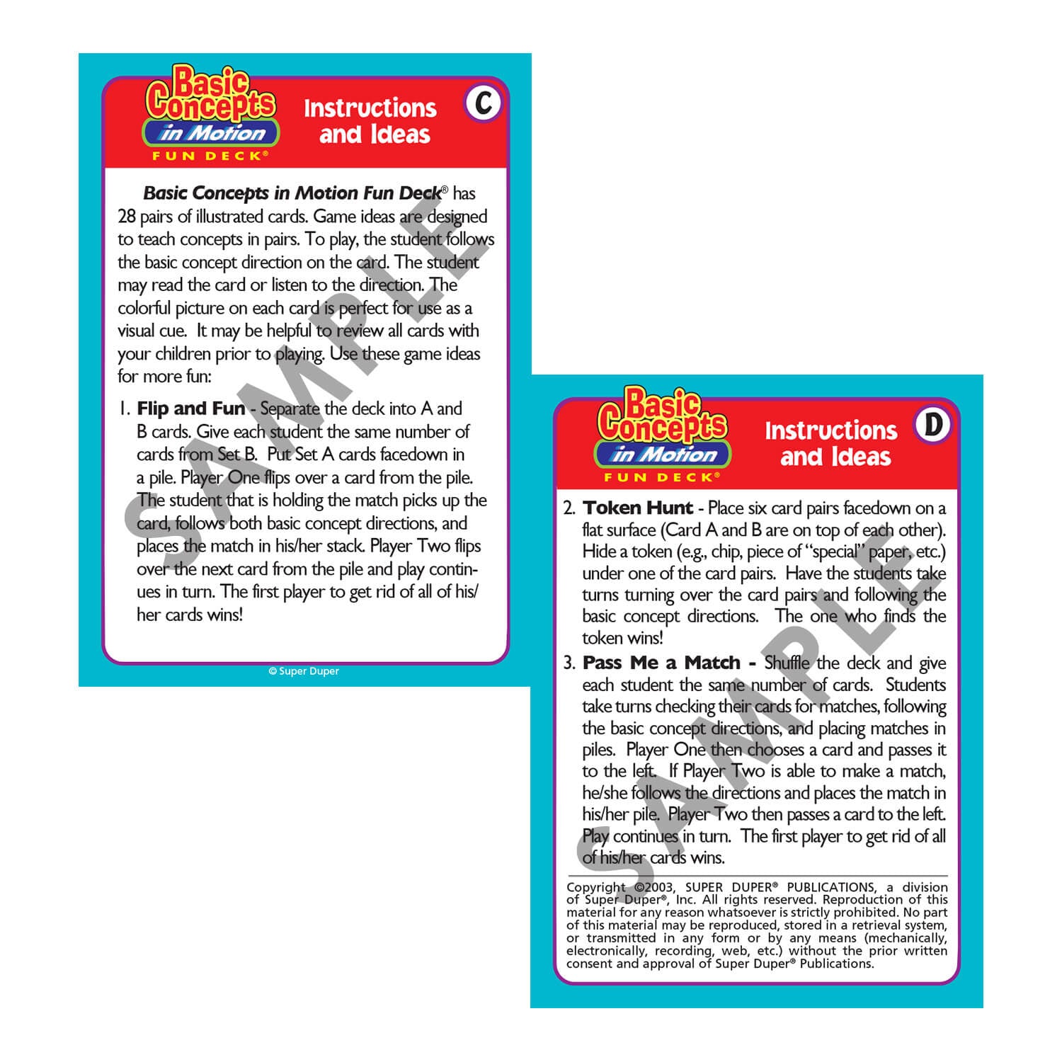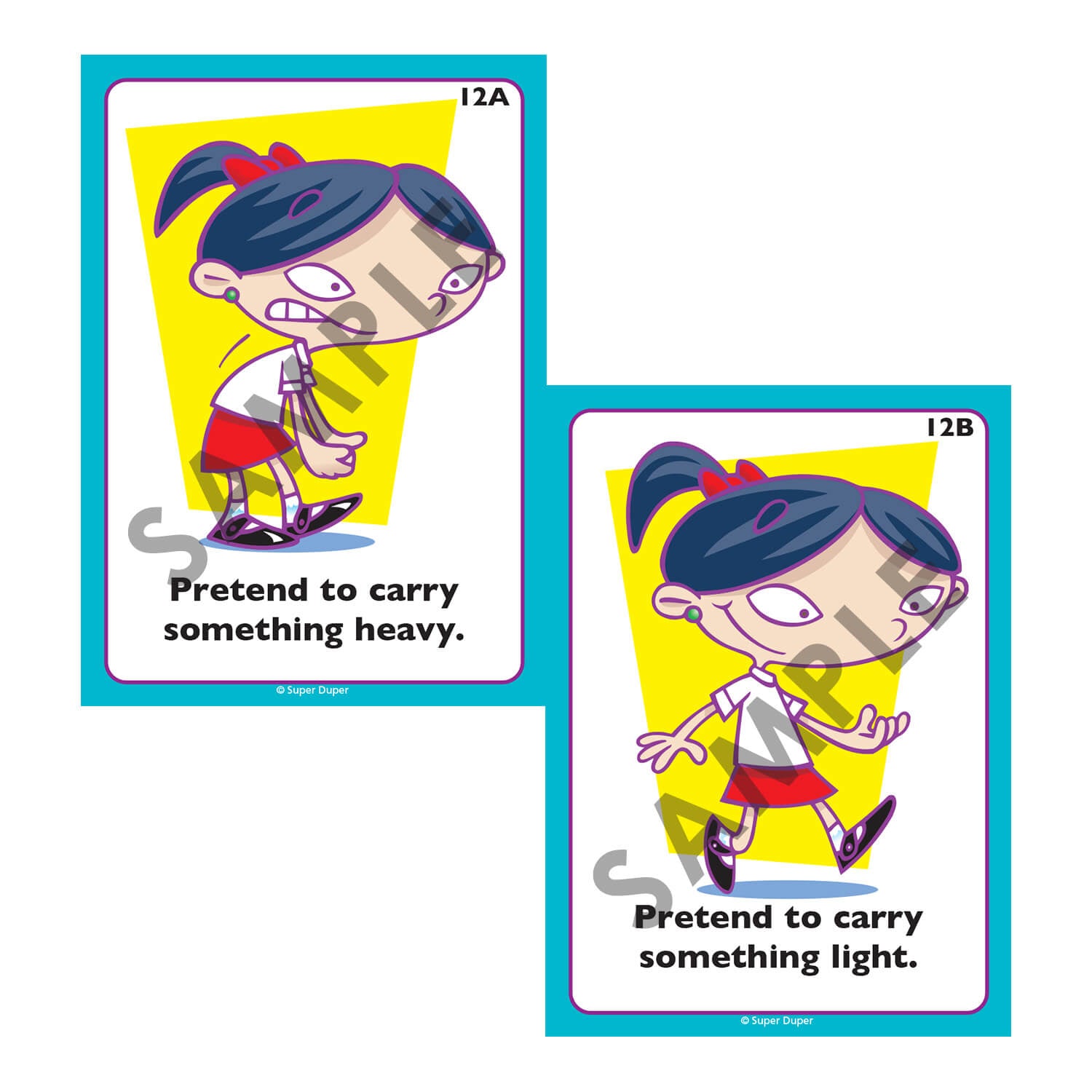 "Take two big steps." "Take two little steps." Get your students movin' and groovin' while learning to understand basic concepts and follow directions. This deck contains 28 fun-filled concept pairs to teach these important skills. Use the colorful cards to play many unique and exciting games!