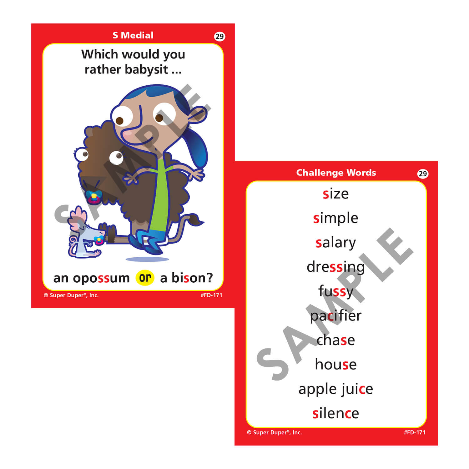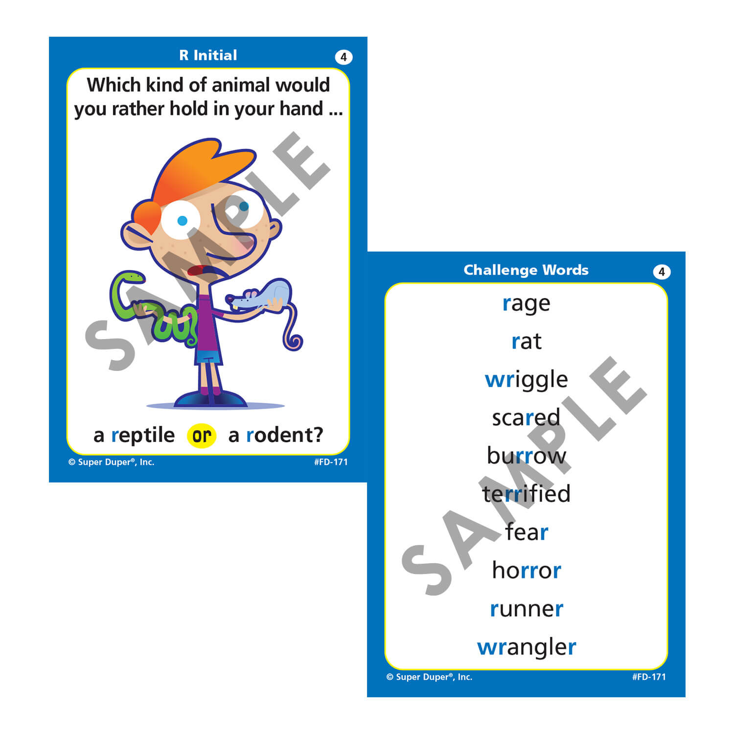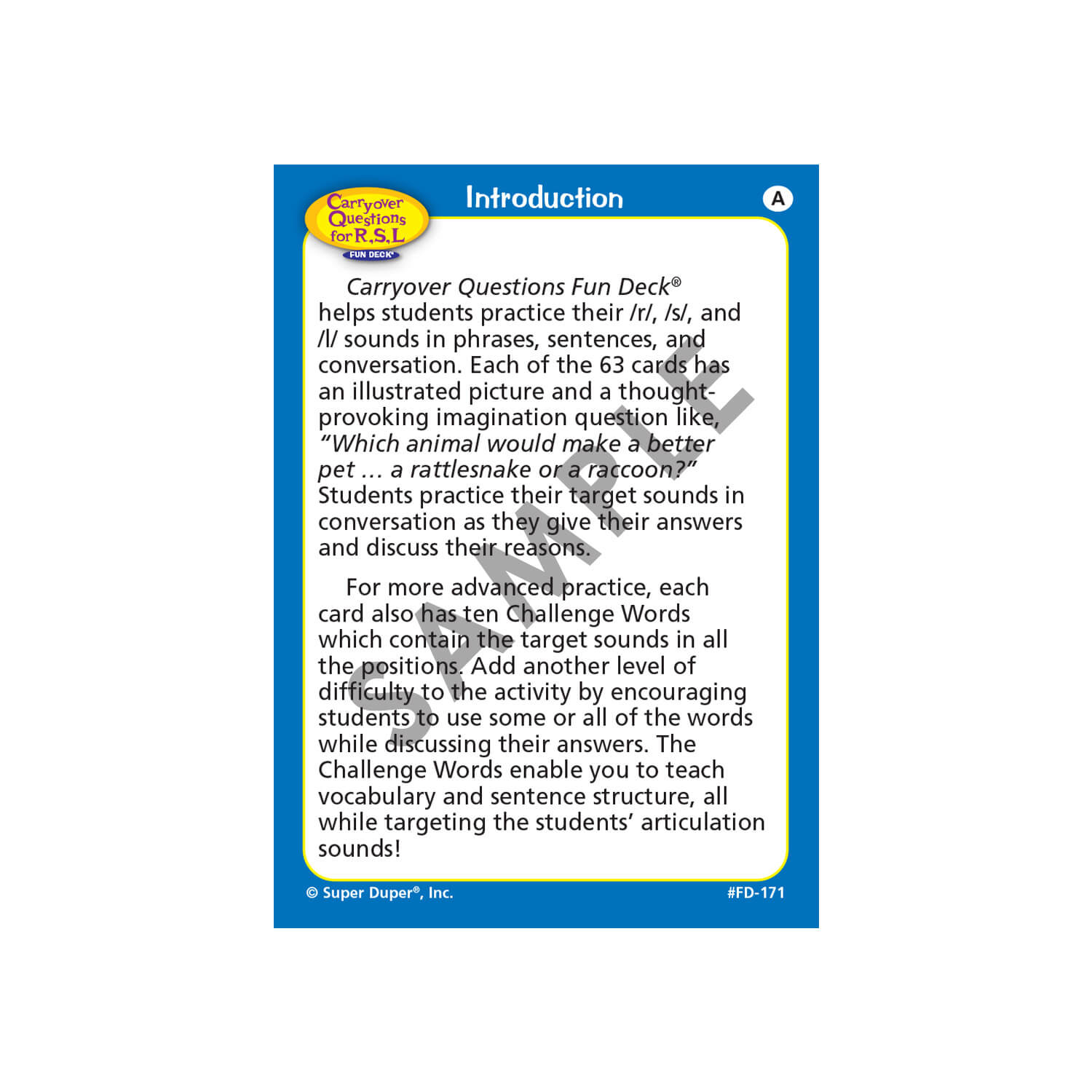 Carryover Questions Fun Deck helps students practice their R, S, and L sounds in phrases, sentences, and conversation. Each of the 63 cards has an illustrated picture and a thought-provoking imagination question like, "Which would you rather eat for supper... cereal or salad?" Have your students add the Challenge Words on the back of the card to their answers for extra practice.