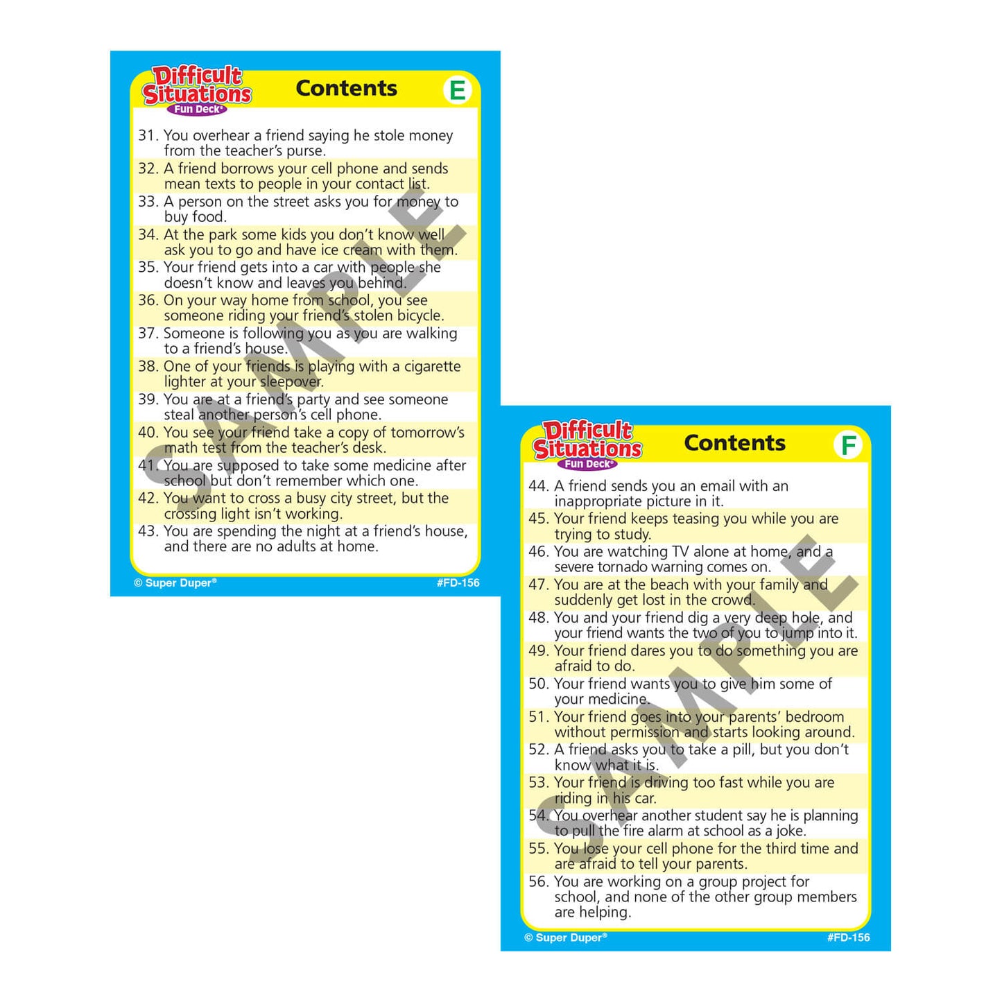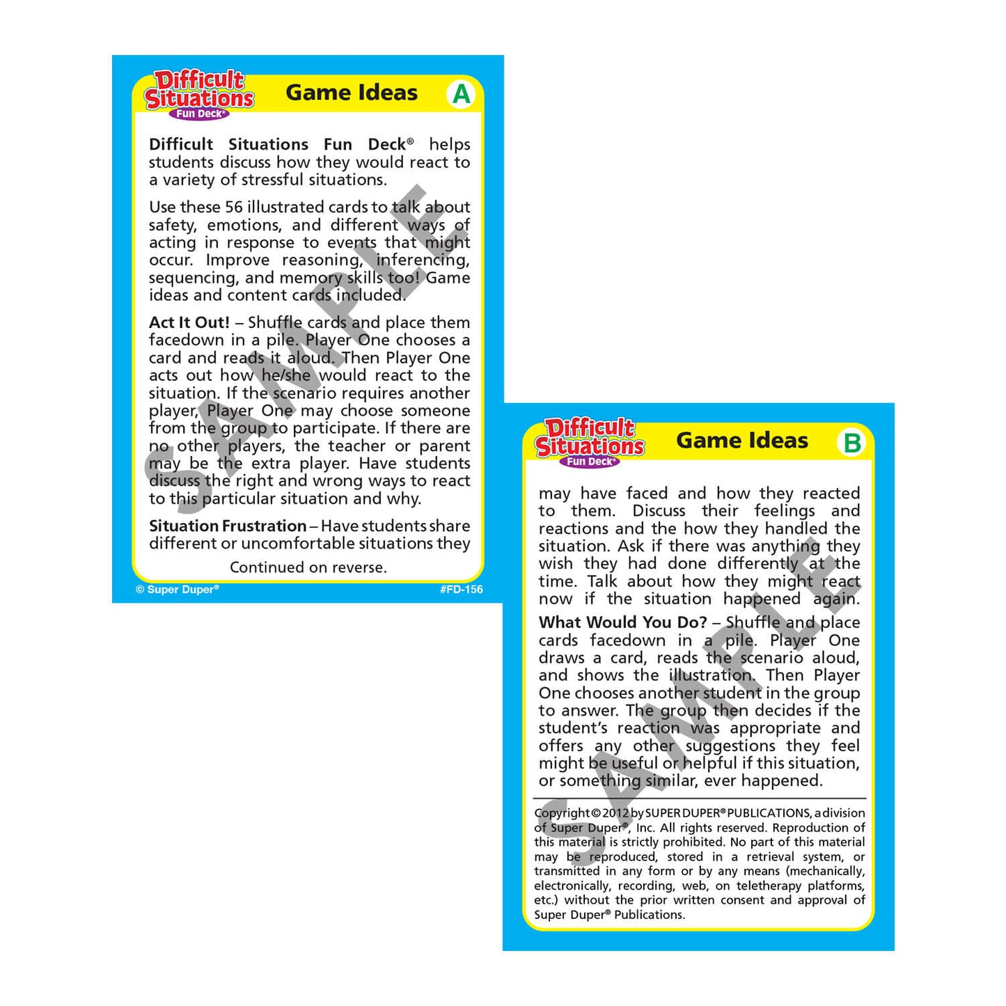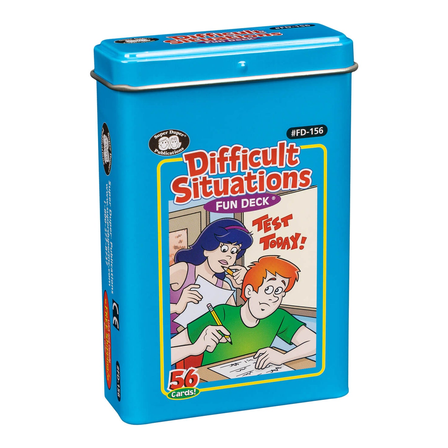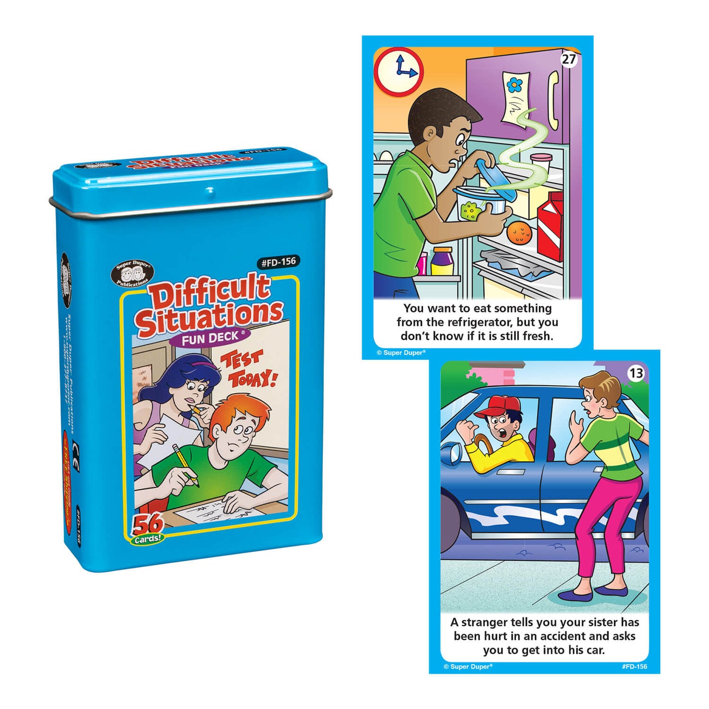 Difficult Situations Fun Deck helps students discuss how they would react to a variety of stressful situations. For example, "Another student keeps looking at your answers during a test." What would you do? Use these 56 illustrated cards to talk about safety, emotions, and different ways of acting in response to events that might occur. Improve reasoning, inferencing, sequencing, and memory skills too!