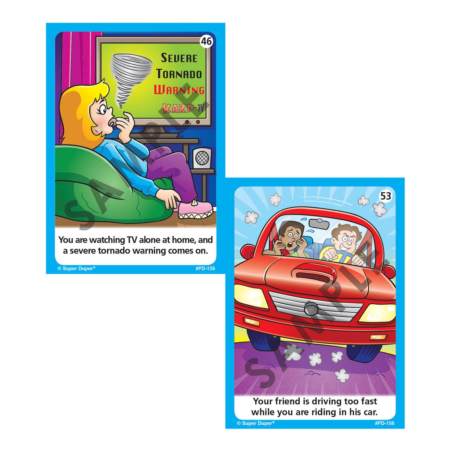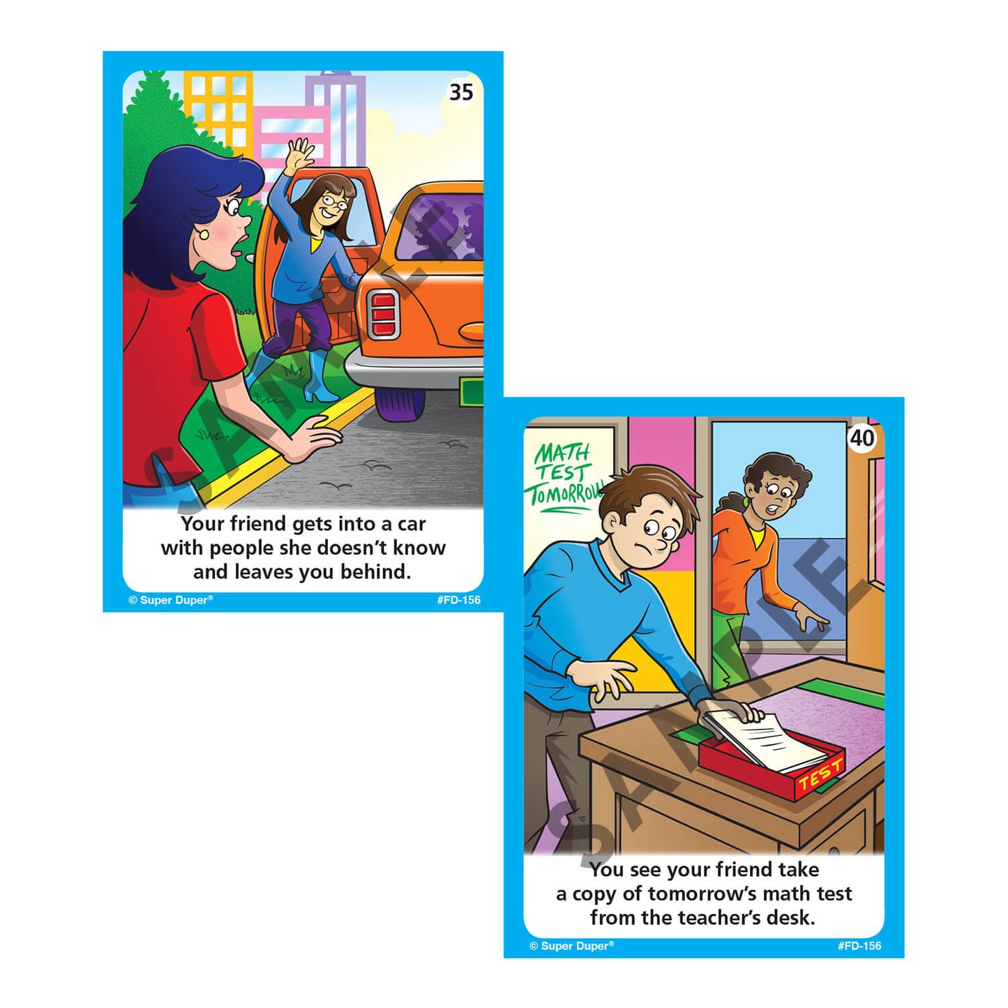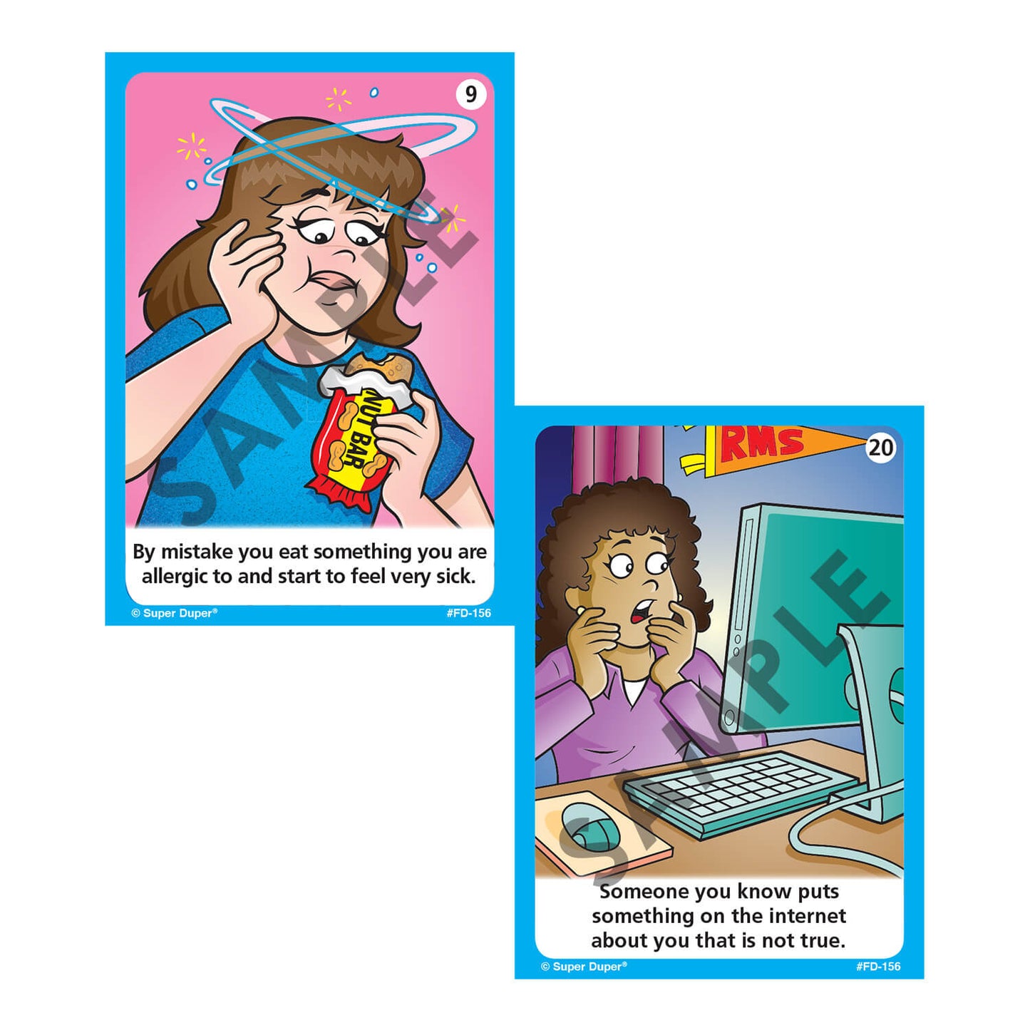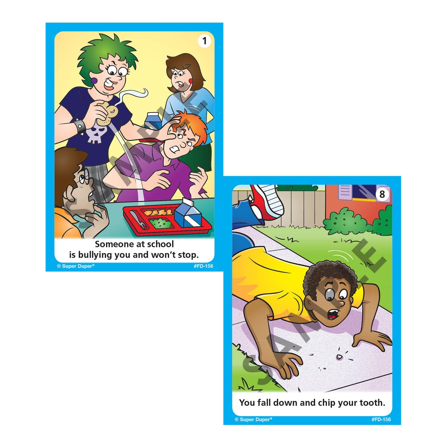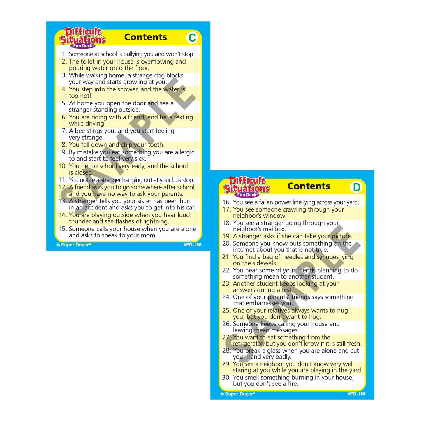 Difficult Situations Fun Deck helps students discuss how they would react to a variety of stressful situations. For example, "Another student keeps looking at your answers during a test." What would you do? Use these 56 illustrated cards to talk about safety, emotions, and different ways of acting in response to events that might occur. Improve reasoning, inferencing, sequencing, and memory skills too!