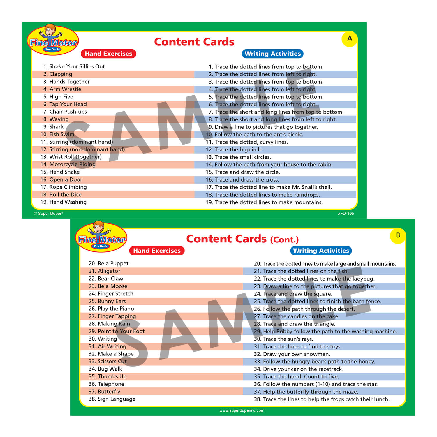Fine Motor Fun Deck has 52 double-sided cards and four connector cards (and, or, before, and after) with exercises and writing tasks that challenge overall hand use and coordination skills. The front side of the card has kid-friendly hand activities for strengthening and dexterity, and the card backs have wipe-off prewriting activities for reinforcing fine motor and visual motor skills.