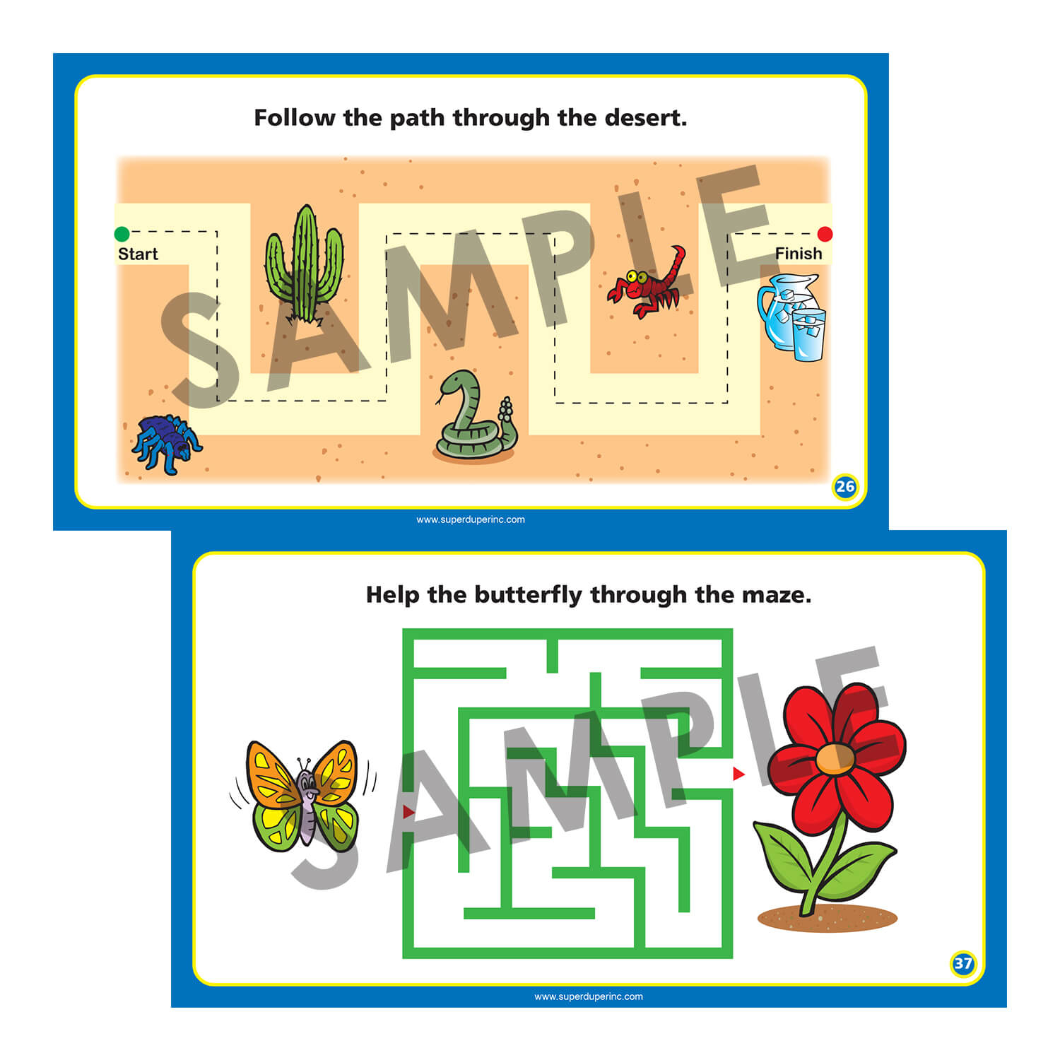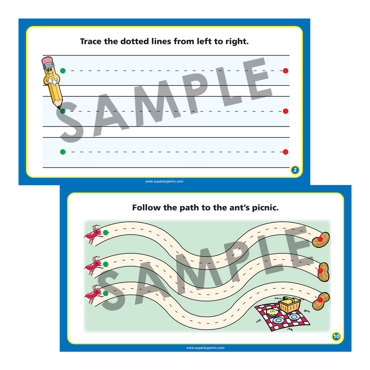 Activities include tracing and drawing simple lines and shapes, connect-the-dots, mazes, name writing, and finish-the-pictures. There are four additional cards that provide directions, game ideas, and exercises for hand skill development that require the use of simple classroom or home supplies.