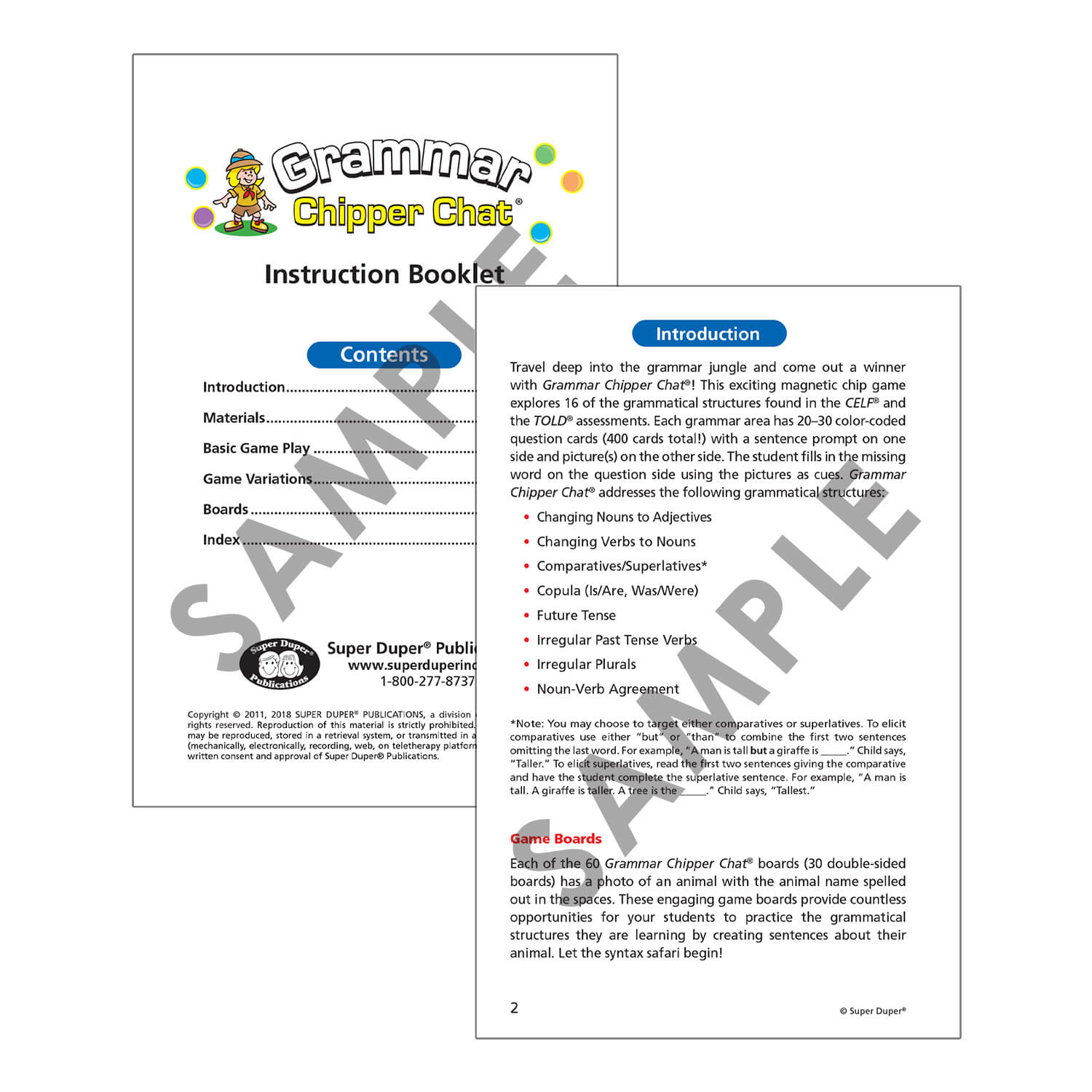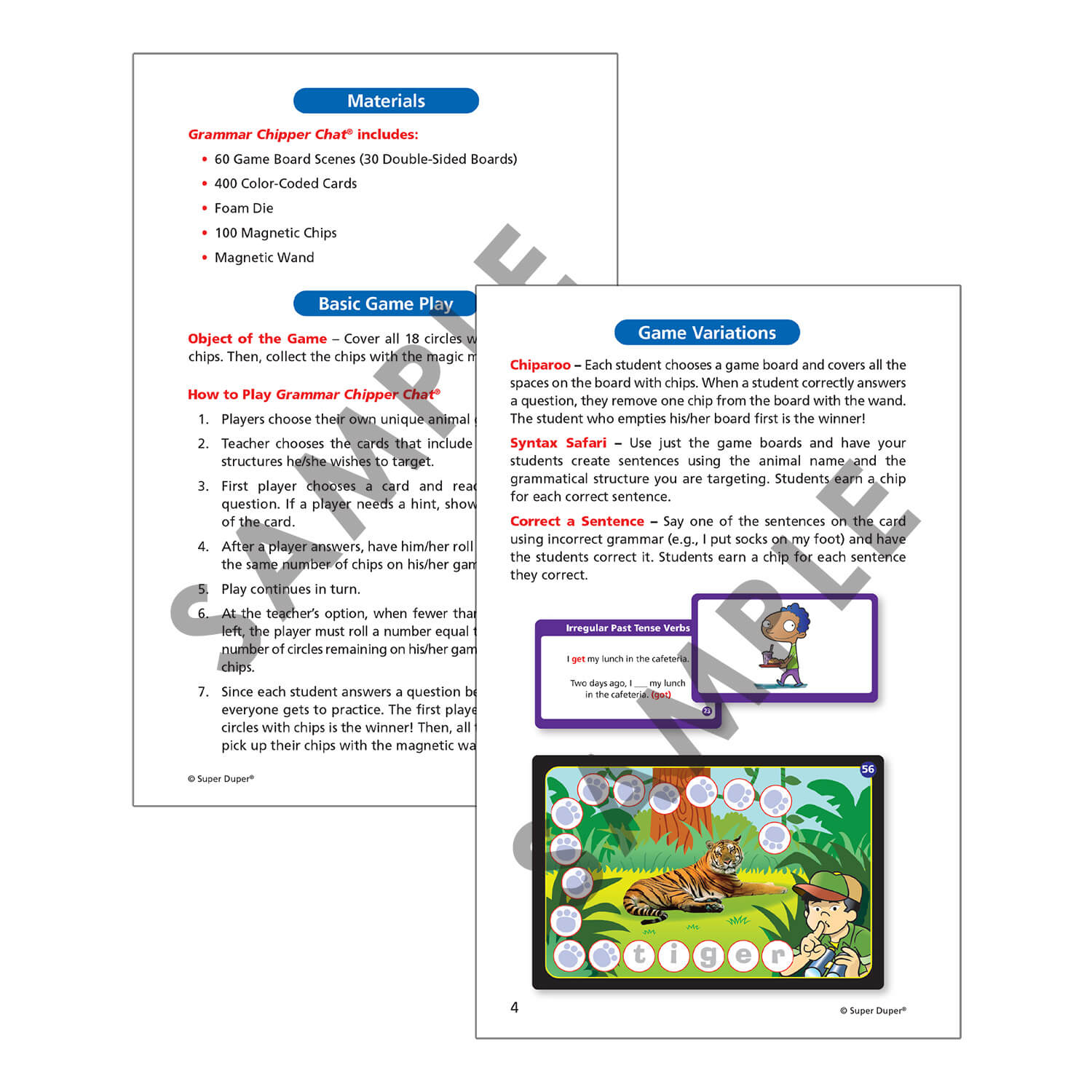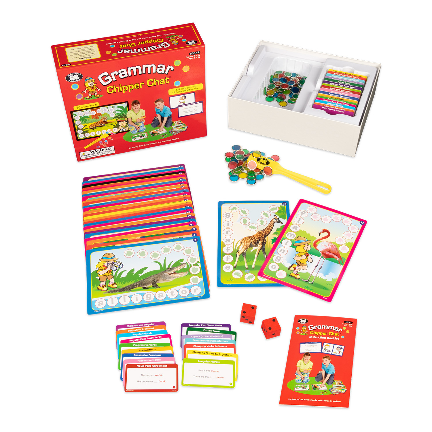 Travel deep into the grammar jungle and come out a winner with Grammar Chipper Chat! This exciting magnetic chip game explores 16 of the grammatical structures found on most language assessments, including the CELF and the TOLD. Each grammar area has 20 or 30 color-coded question cards (400 cards total!) with a sentence prompt on one side and picture(s) on the other side. The student fills in the missing word on the question side using the pictures as cues.