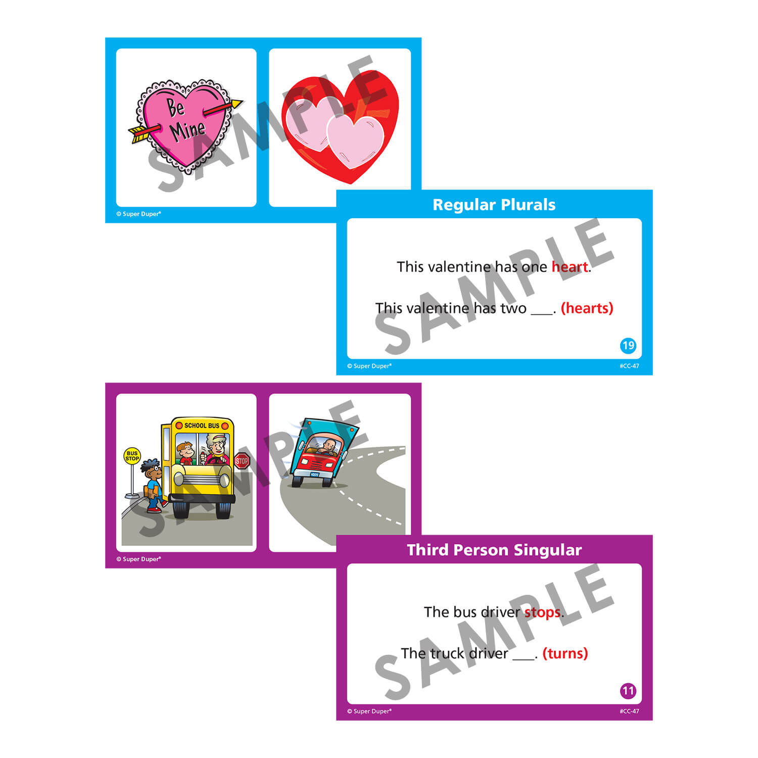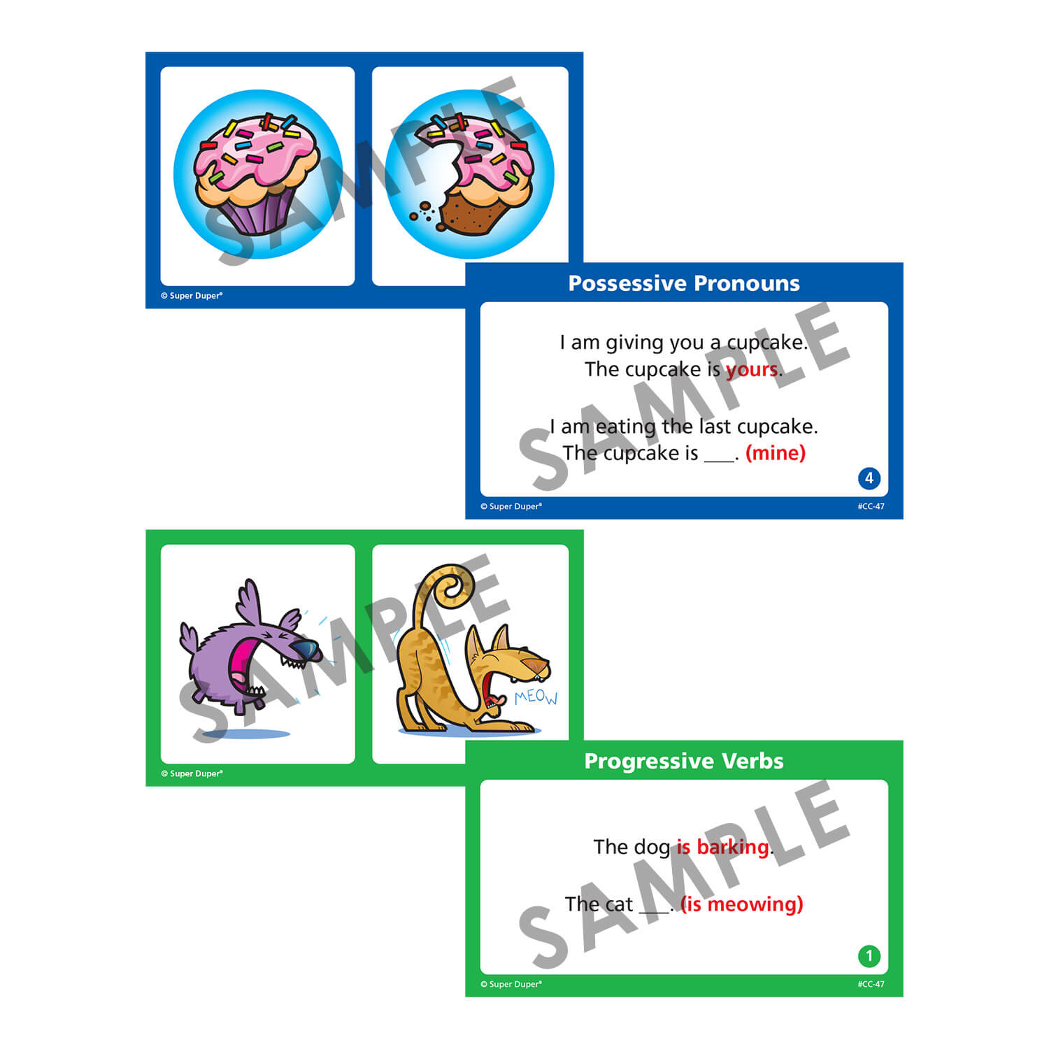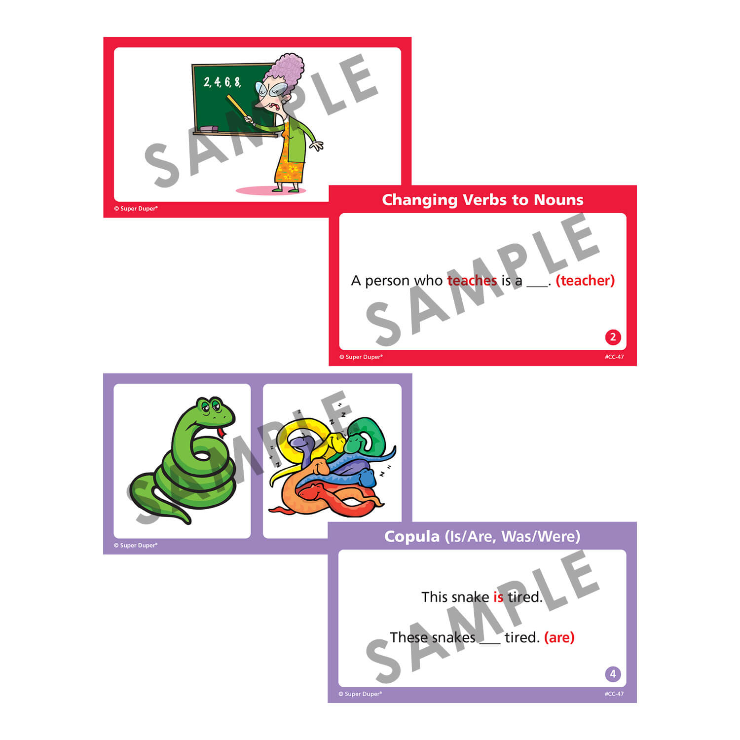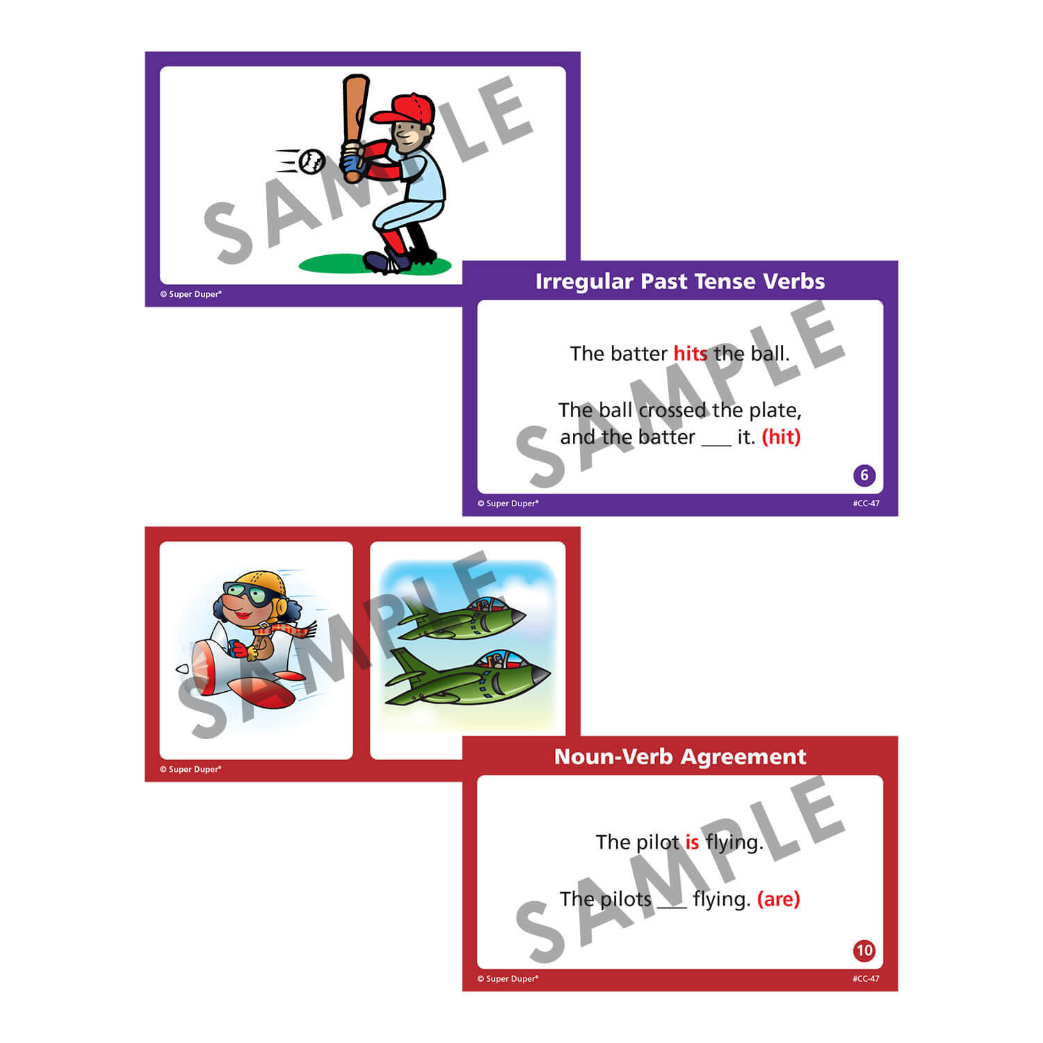 Travel deep into the grammar jungle and come out a winner with Grammar Chipper Chat! This exciting magnetic chip game explores 16 of the grammatical structures found on most language assessments, including the CELF and the TOLD. Each grammar area has 20 or 30 color-coded question cards (400 cards total!) with a sentence prompt on one side and picture(s) on the other side. The student fills in the missing word on the question side using the pictures as cues.