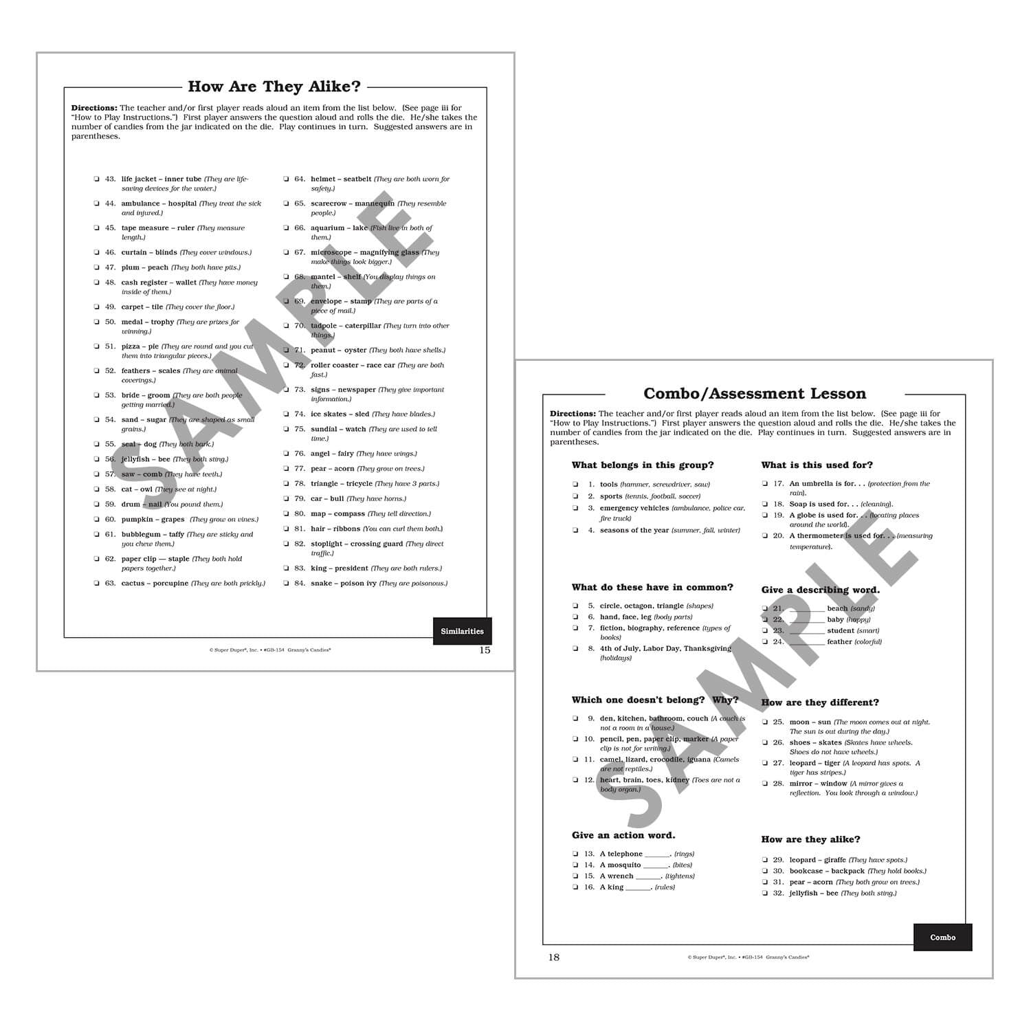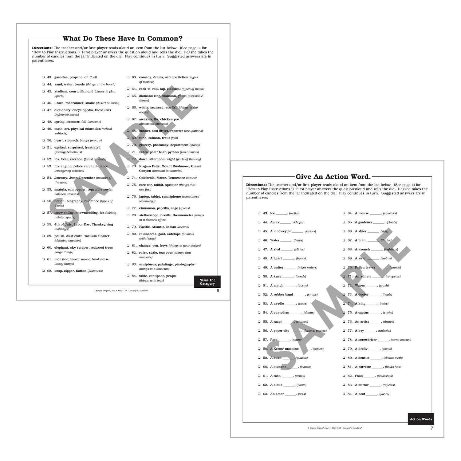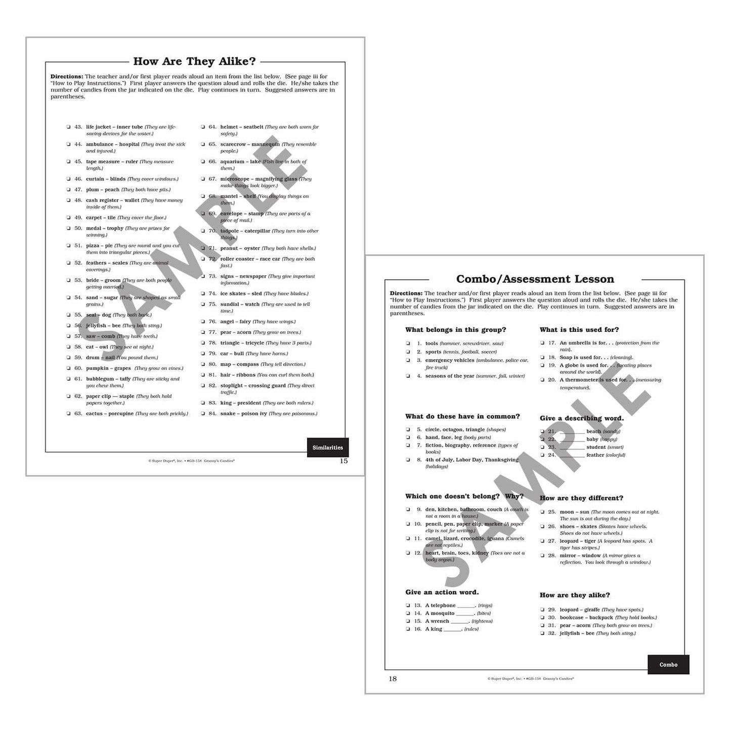 Let Granny treat your students to some old-fashioned fun! Combine the excitement of picking colorful "candy" tokens from Granny's candy jars with hundreds of opportunities to expand vocabulary skills. First, you fill up the "candy jars" with "candy" (soft, foamy, and colorful tokens). Then, players choose question cards from one of eight semantic areas (or mix and match cards). Students answer the questions, roll the die, and pick "candy" from the jars. The player with the most "candy" at the end of the game wins. Sounds yummy! You receive 672 word-meaning cards (84 for each area below):