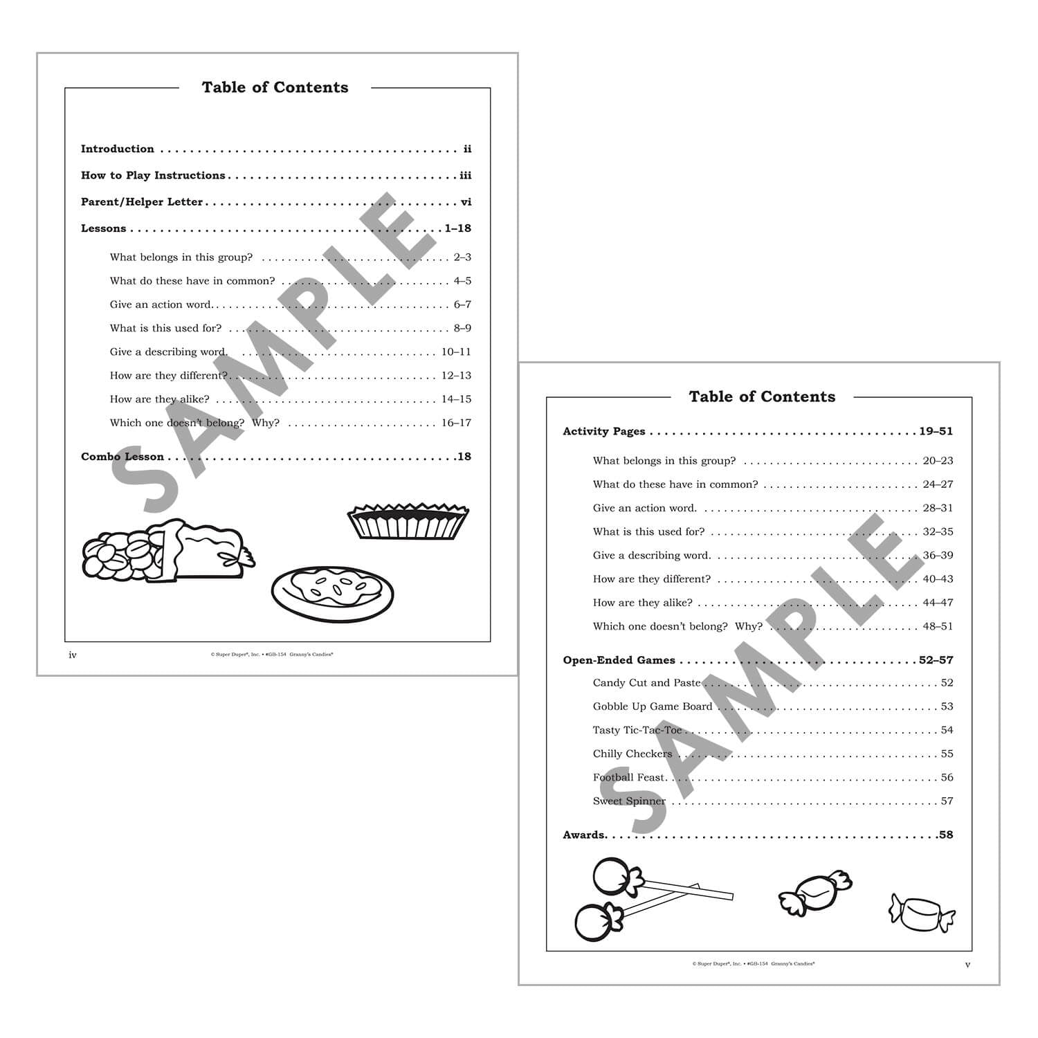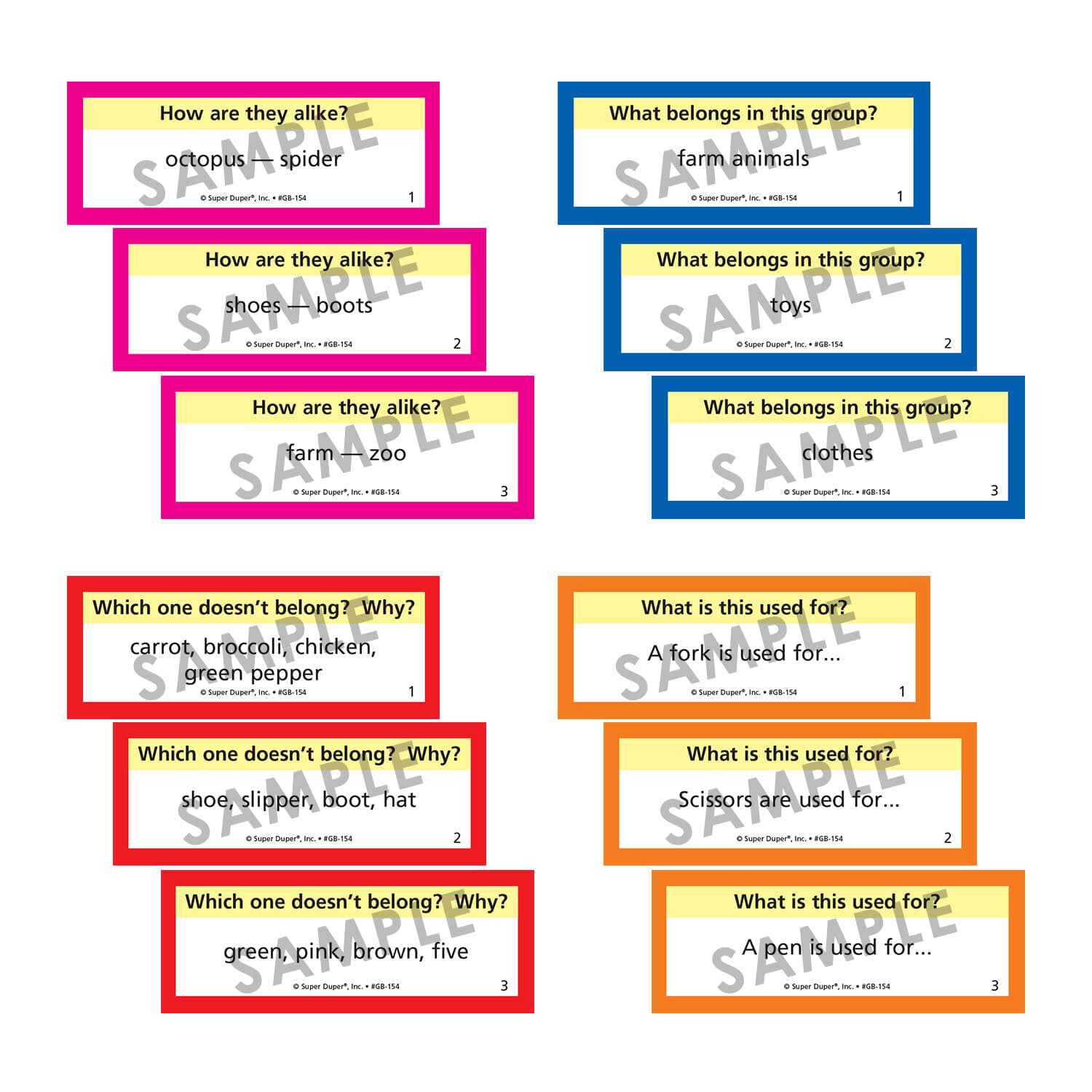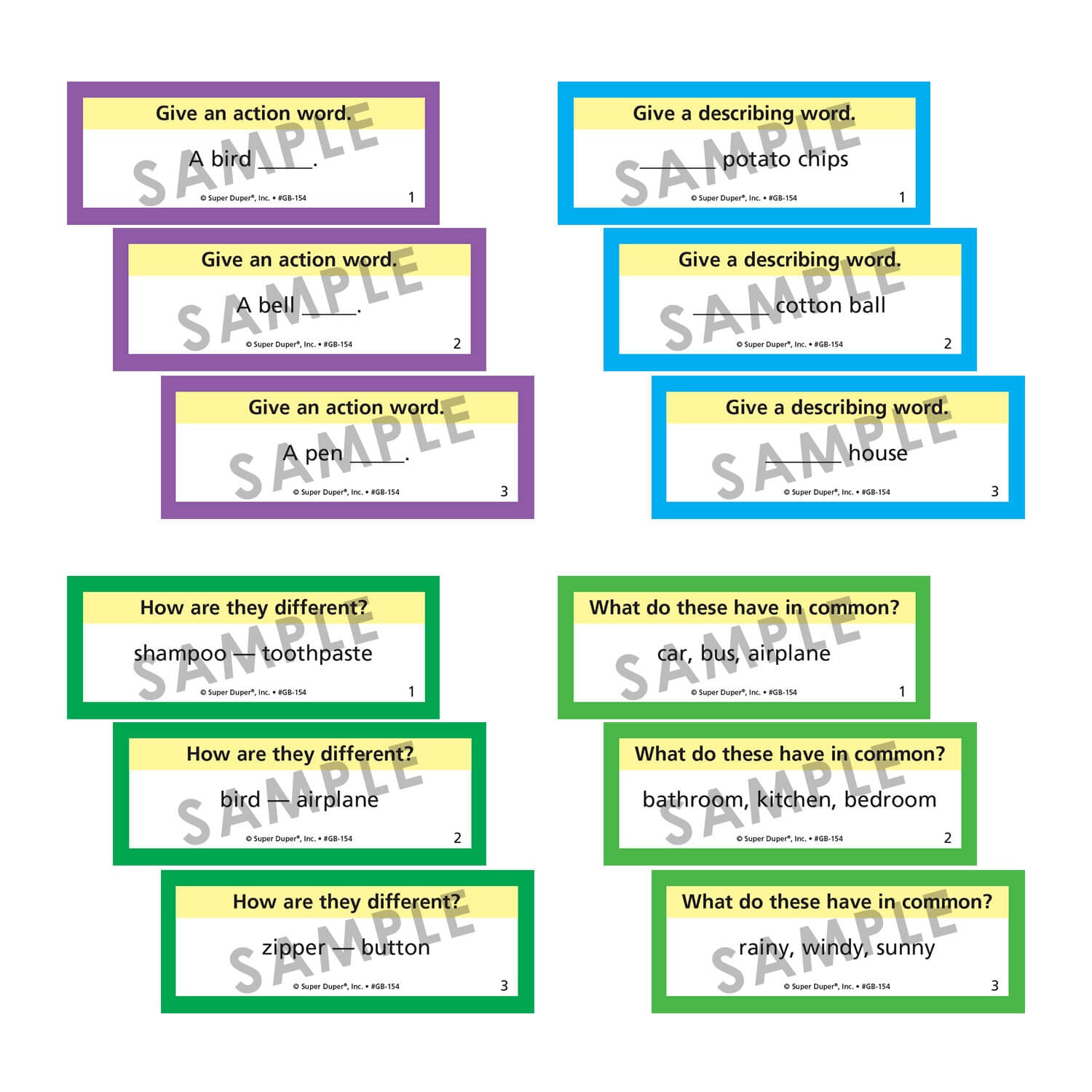 Let Granny treat your students to some old-fashioned fun! Combine the excitement of picking colorful "candy" tokens from Granny's candy jars with hundreds of opportunities to expand vocabulary skills. First, you fill up the "candy jars" with "candy" (soft, foamy, and colorful tokens). Then, players choose question cards from one of eight semantic areas (or mix and match cards). Students answer the questions, roll the die, and pick "candy" from the jars. The player with the most "candy" at the end of the game wins. Sounds yummy! You receive 672 word-meaning cards (84 for each area below):