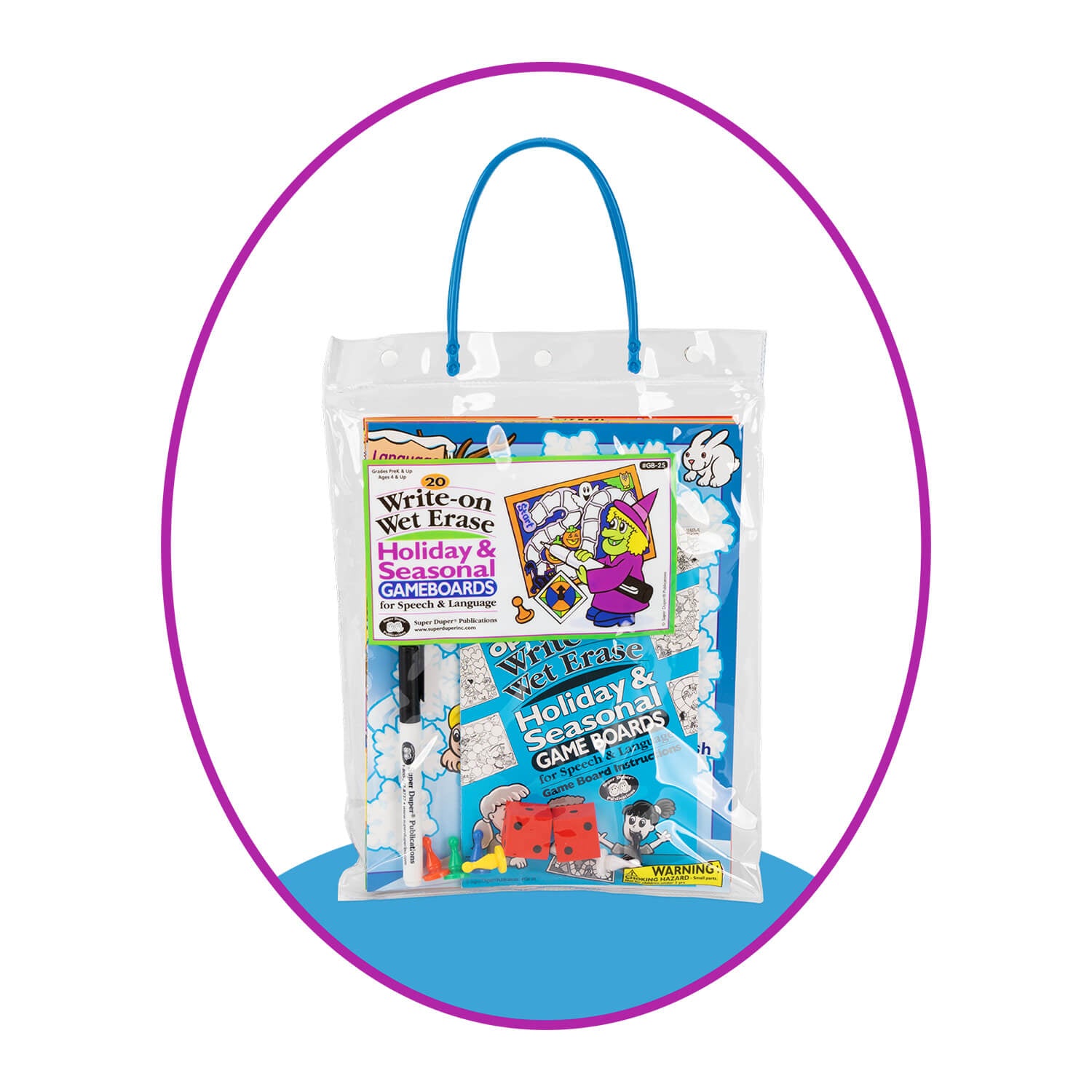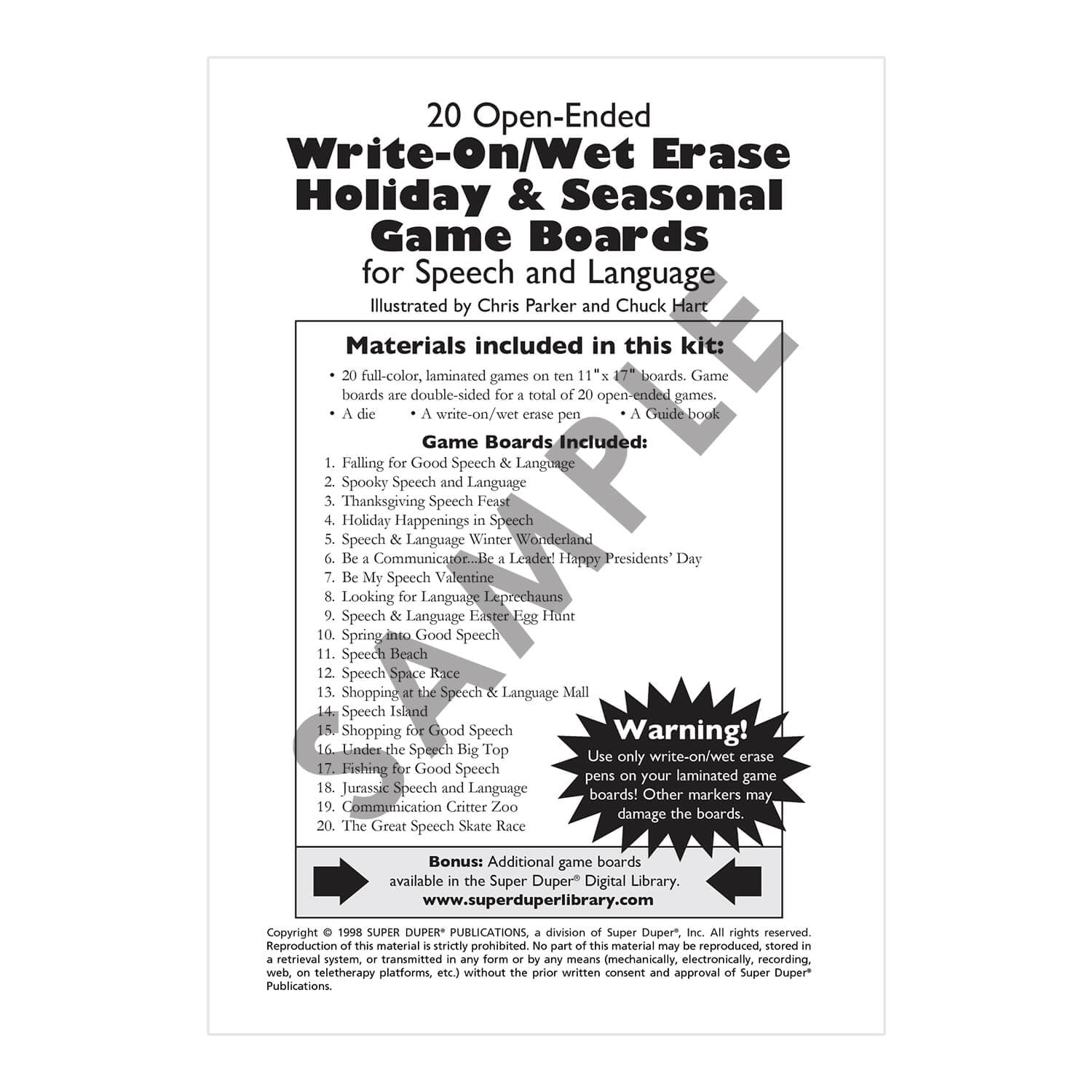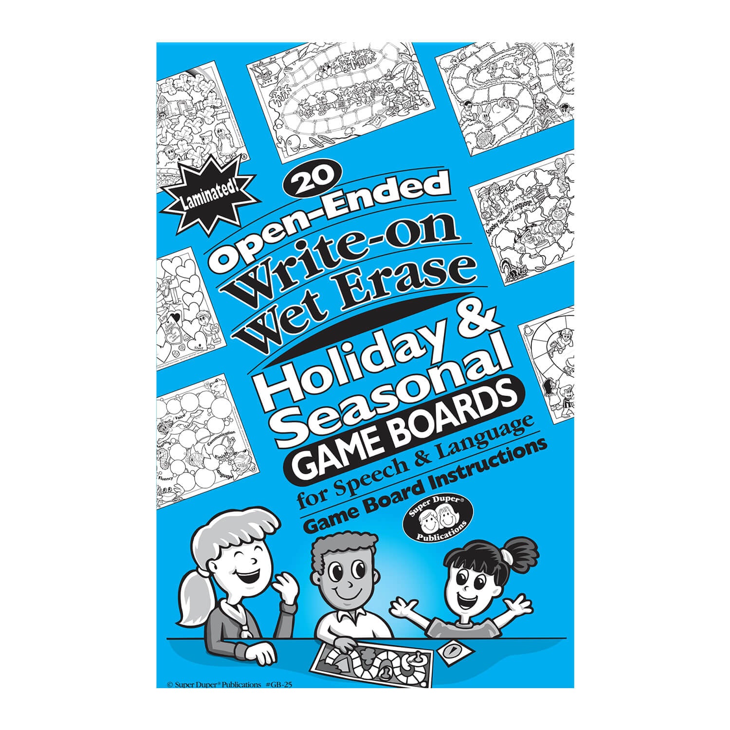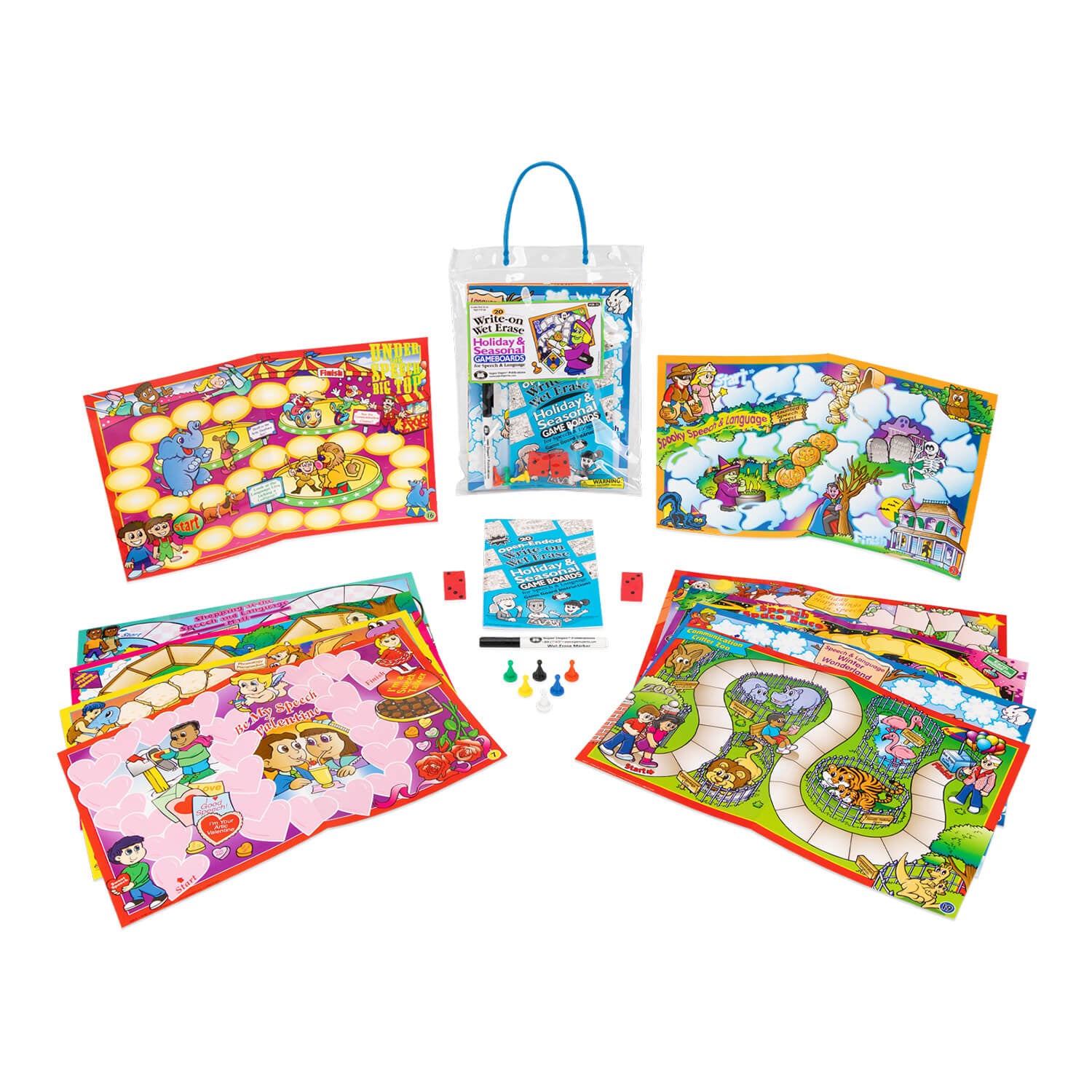 These colorful, fully laminated, open-ended game boards are the best in the entire universe! Imagine 20 beautiful scenes for year-round speech and language fun. The laminated boards make it easy for you to write-on/wet erase any words or customize instructions. When you're ready to use the boards again, just erase with a damp cloth. It's that easy!