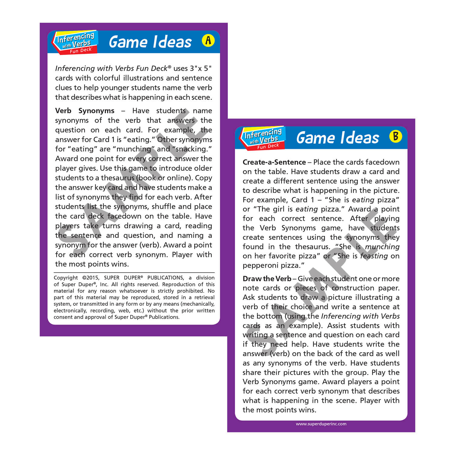 Inferencing with Verbs Fun Deck uses colorful illustrations and sentence clues to help younger students name the verb that describes what is happening in each scene. Extra game ideas and extension activities in this deck give older students practice finding and using synonyms of the 56 verbs.