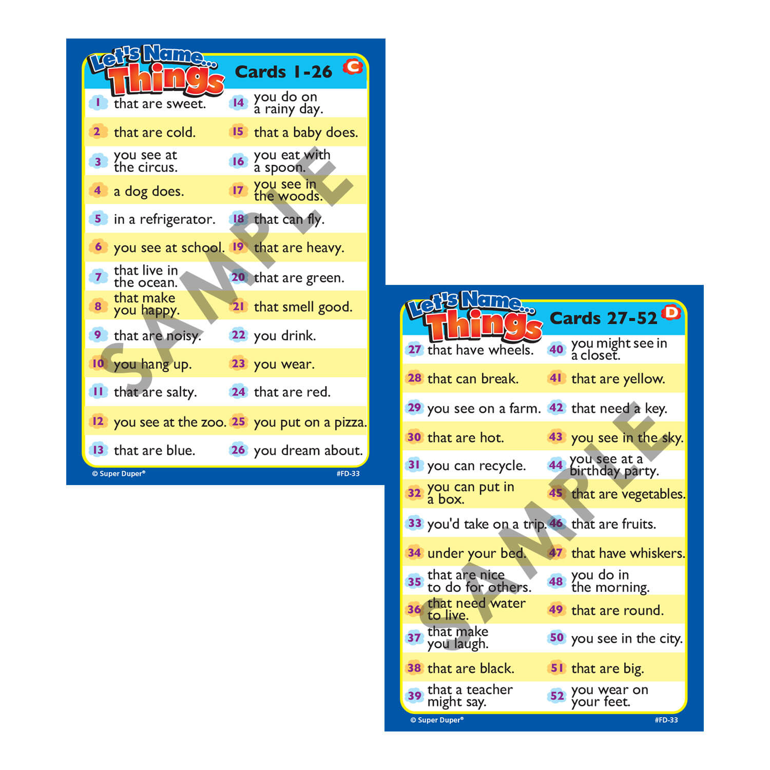 Let's name things you see at the zoo…elephant, zebra, gorilla, seal, etc. How many can you name? This festive deck will challenge students to name items that belong to a specific category based on attributes and functions. It's guaranteed to provide enjoyment for everyone.