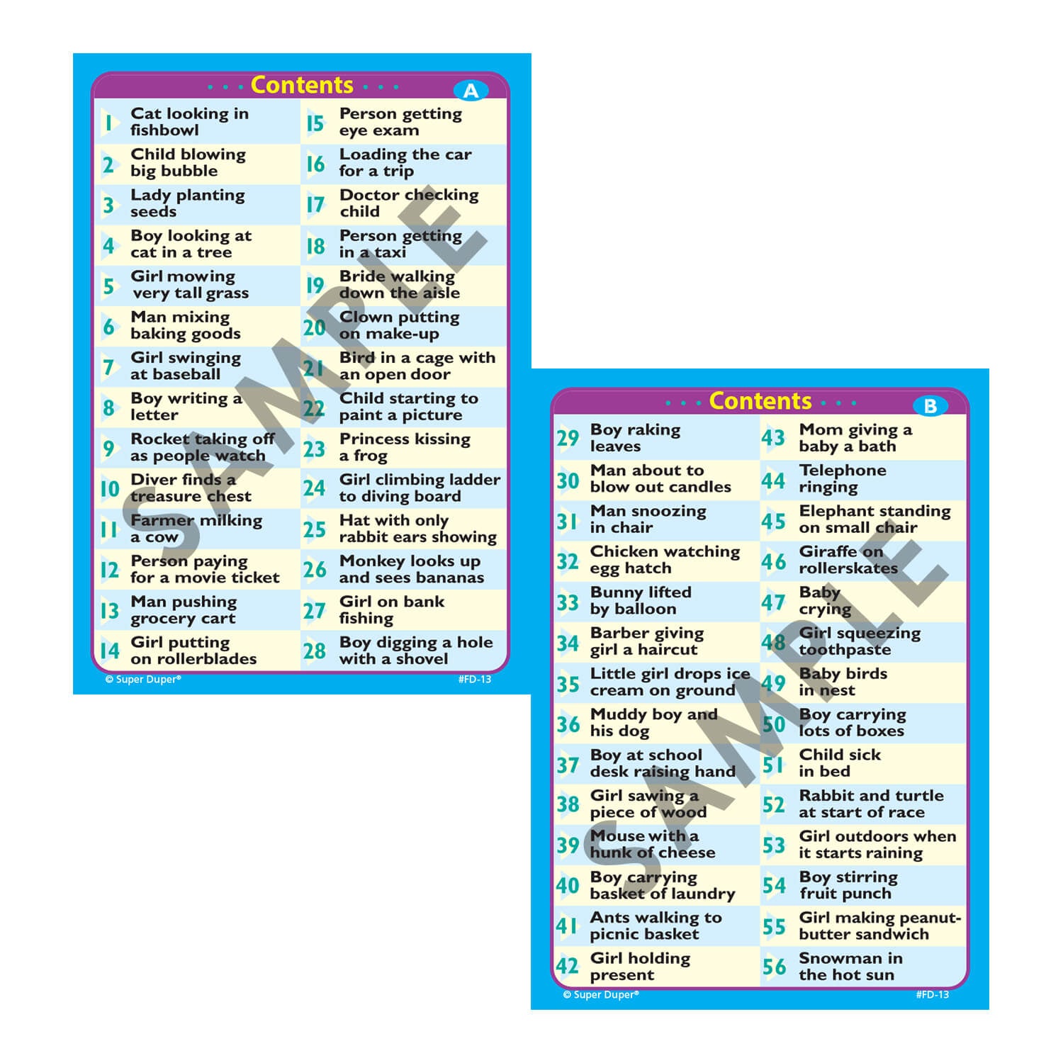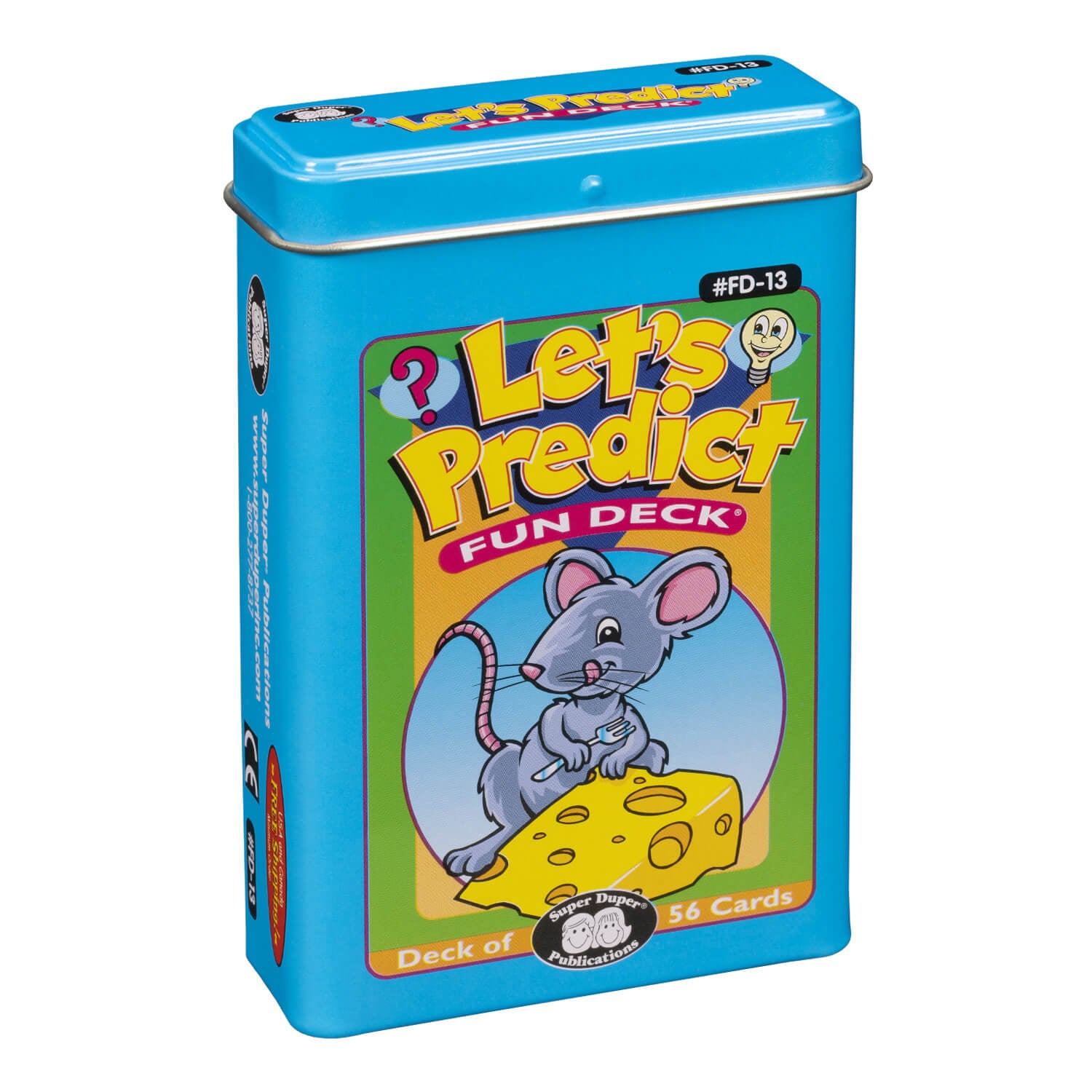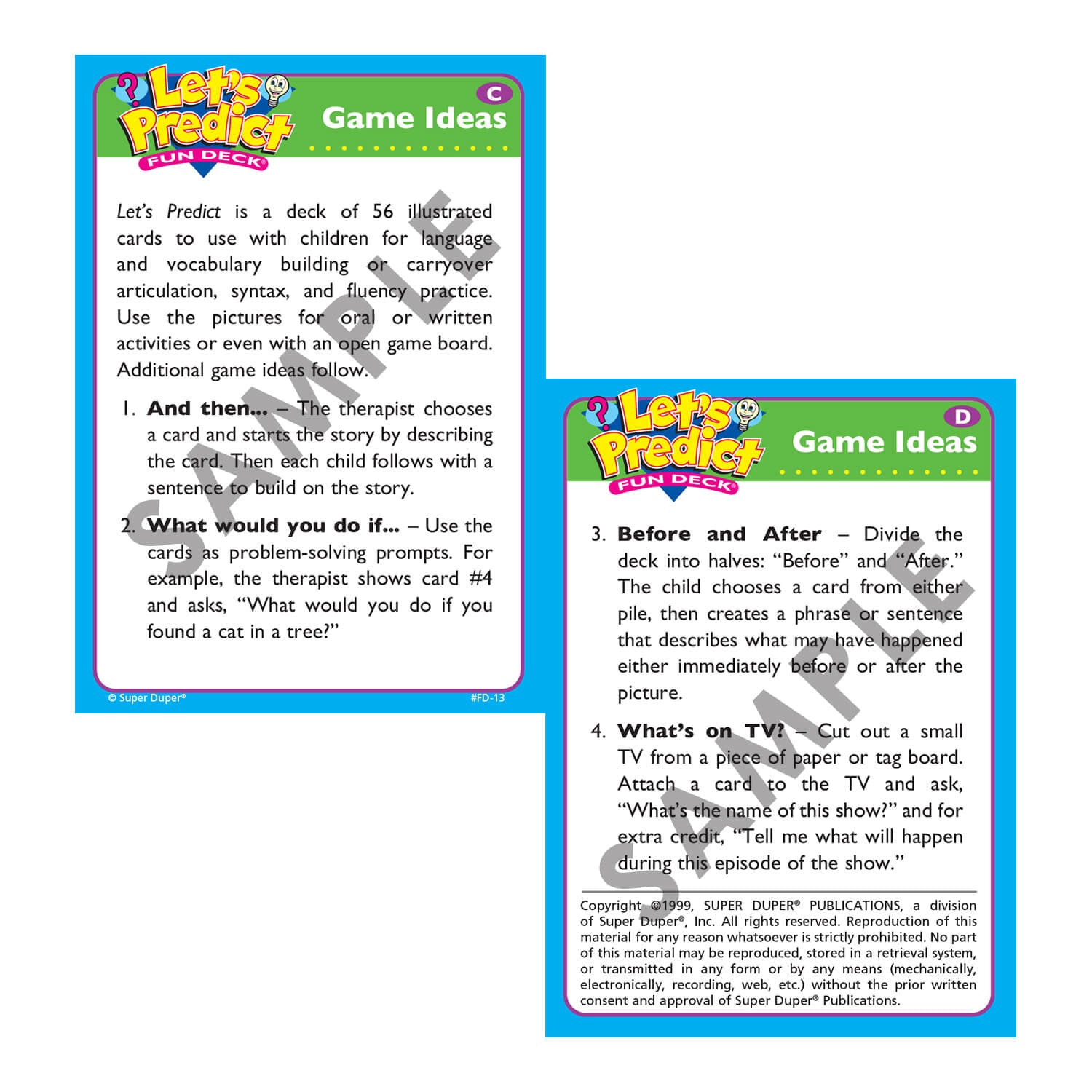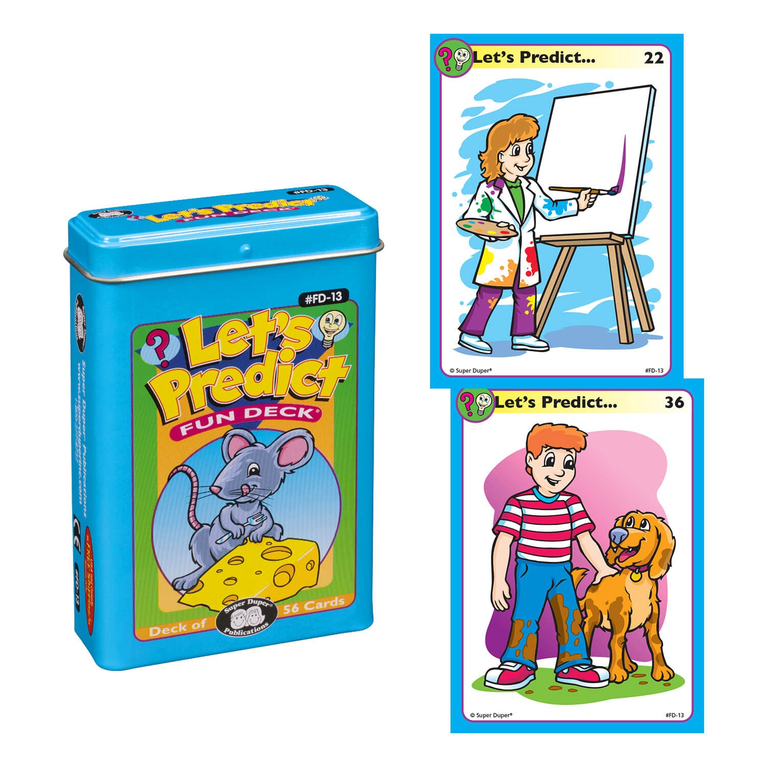 It's time to look into the future and talk about what will happen… after the little girl swings at the baseball… when the little boy digs a hole… once the elephant stands on the small stool. These are samples of the 56 different scenes you'll find in this enjoyable Let's Predict Fun Deck. The many language possibilities are endless because you receive 56 open-ended scenes!