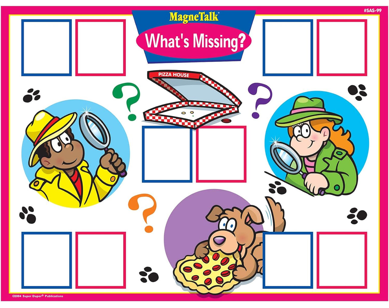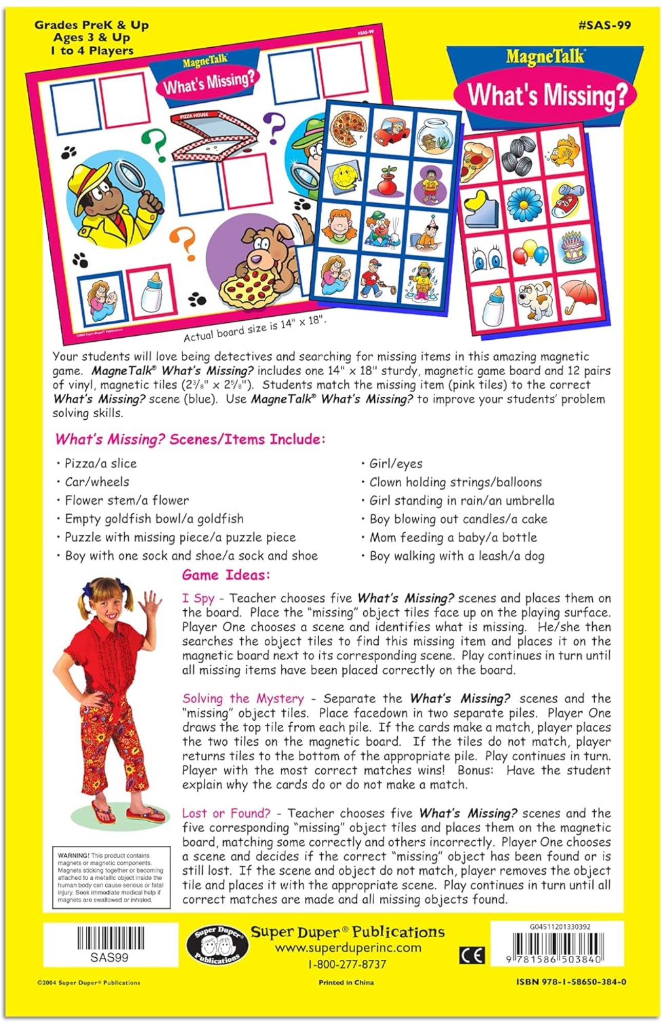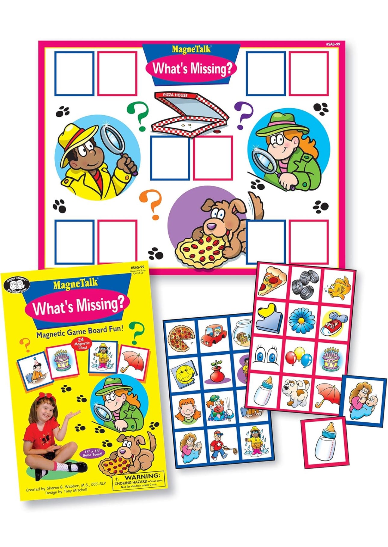 Help the detectives search for missing items in this amazing magnetic game. Use MagneTalk What's Missing? to improve problem solving skills. Match 12 picture tiles with 12 adorable What's Missing? scene tiles.