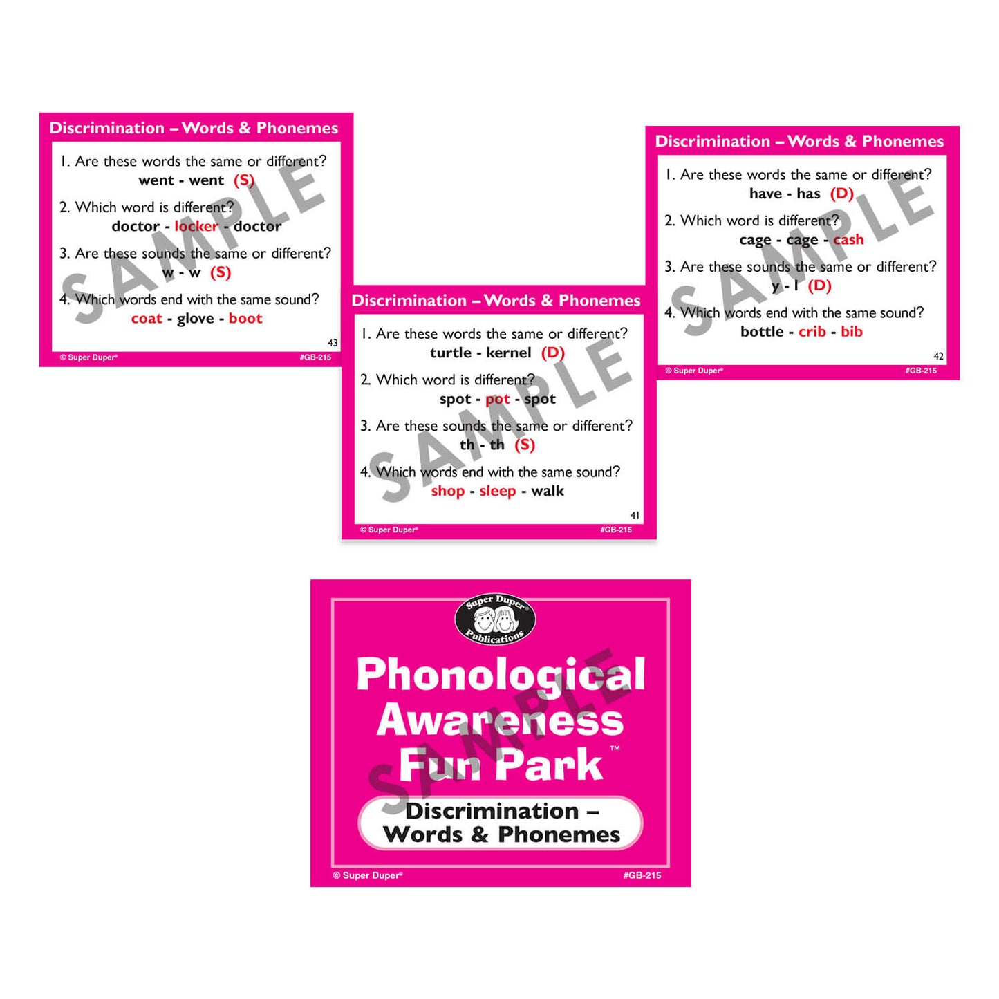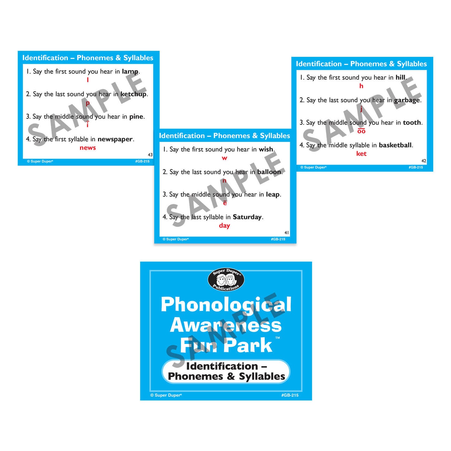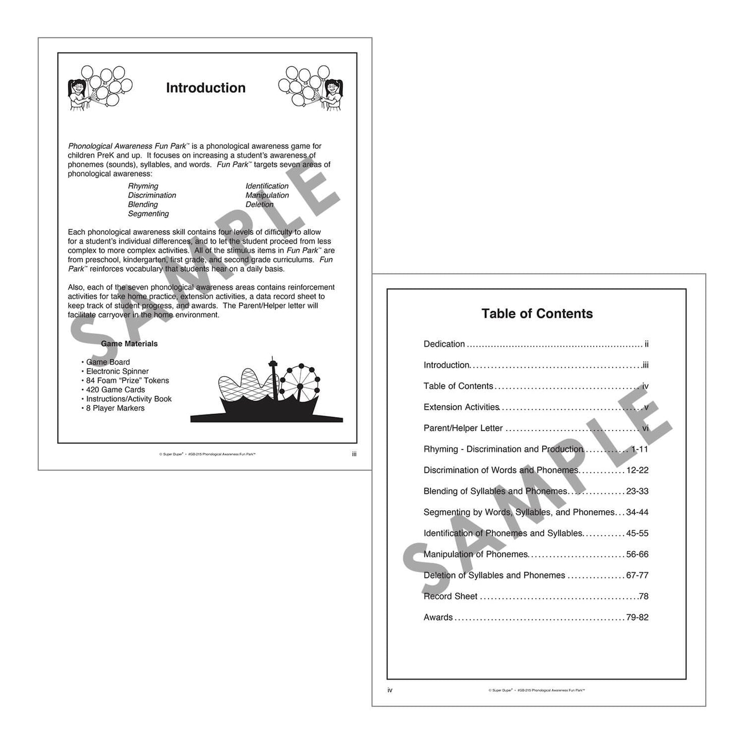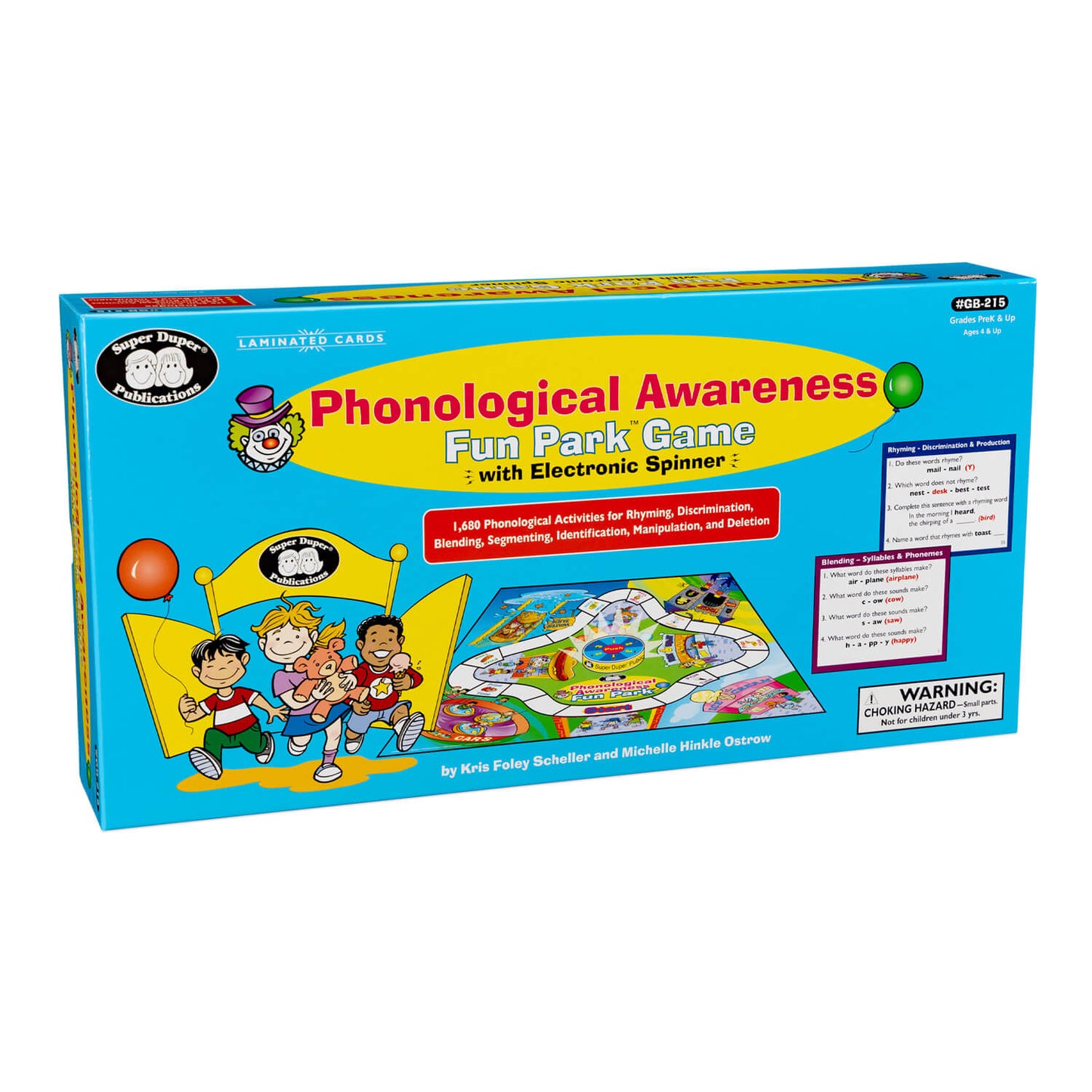 Here's one of Super Duper's coolest creations — Phonological Awareness Fun Park. Increase your students' awareness of phonemes (sounds), syllables, and words as they travel around the park, pressing the electronic spinner to determine the number of spaces to move, and collecting colorful foam prizes at each entertaining booth. Fun Park targets seven areas of phonological awareness: