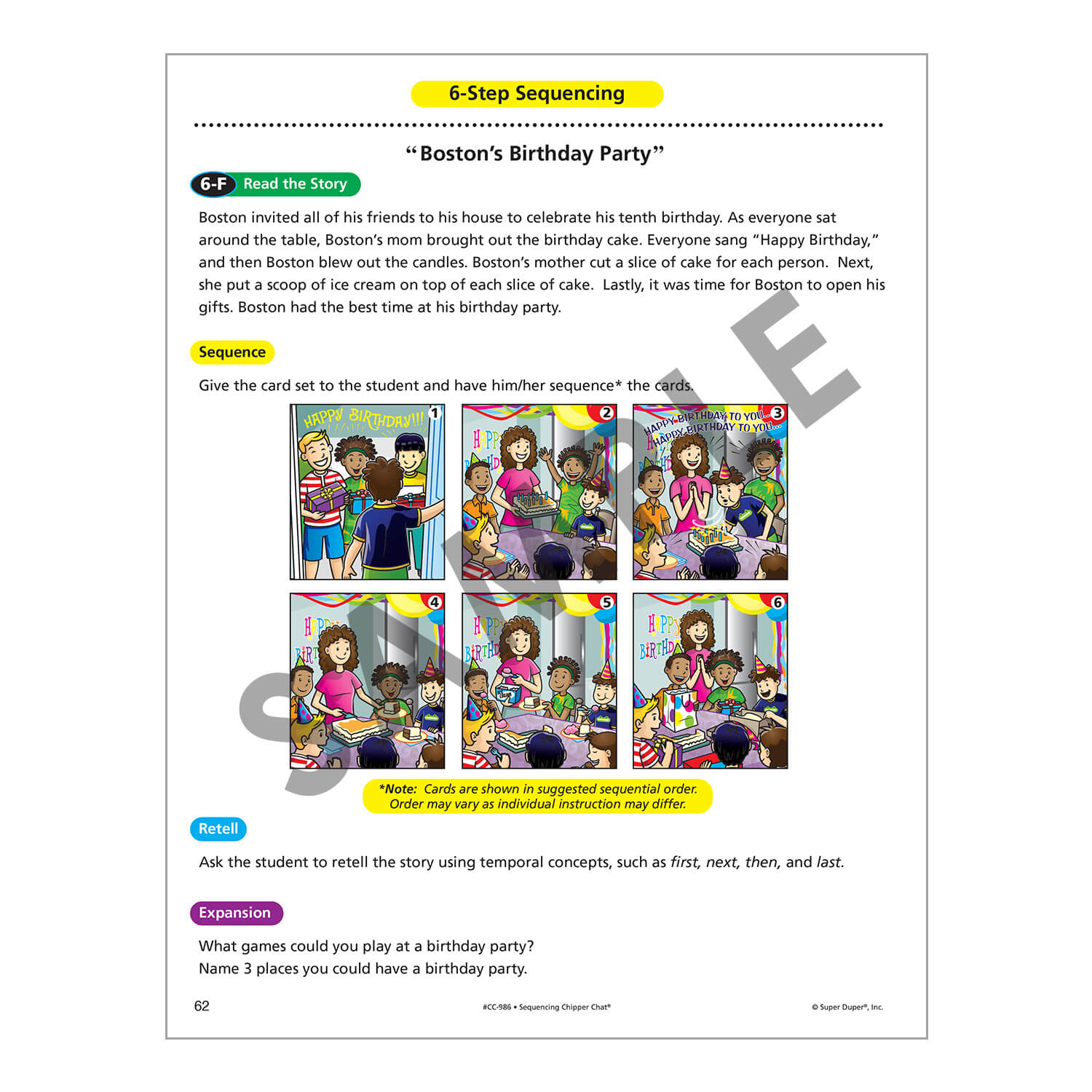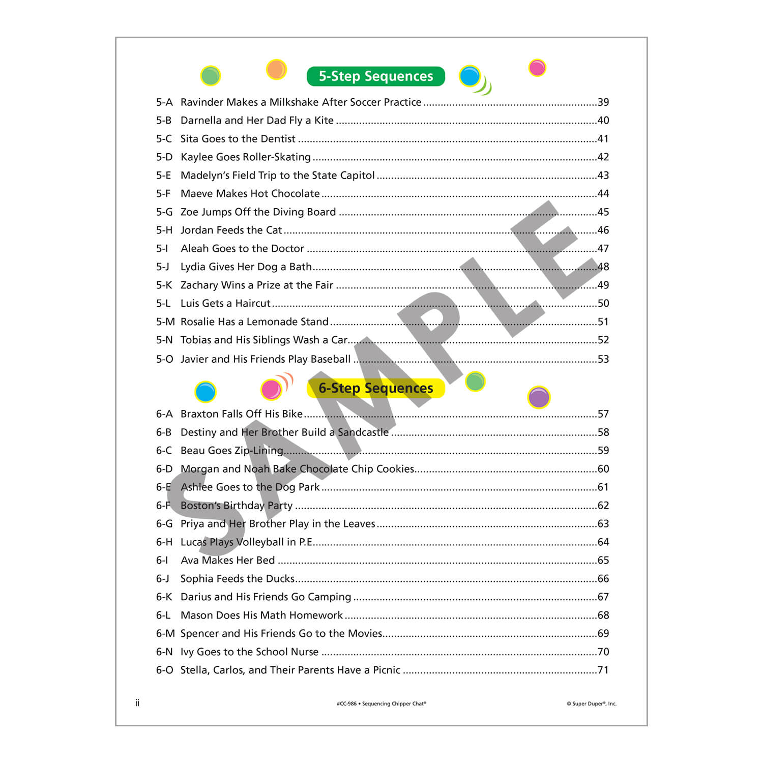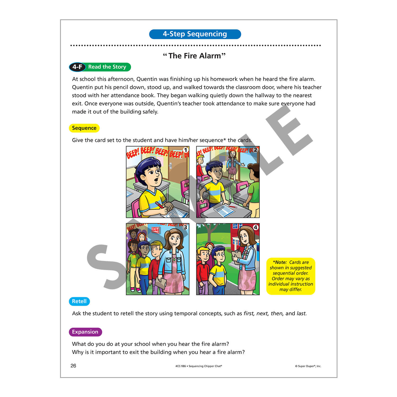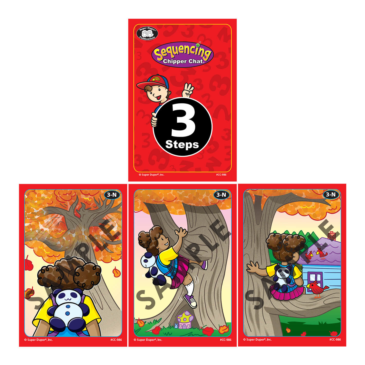 - 270 sequencing cards (15 stories each for 3-, 4-, 5-, and 6-step stories, 2.5” x 3.75”)