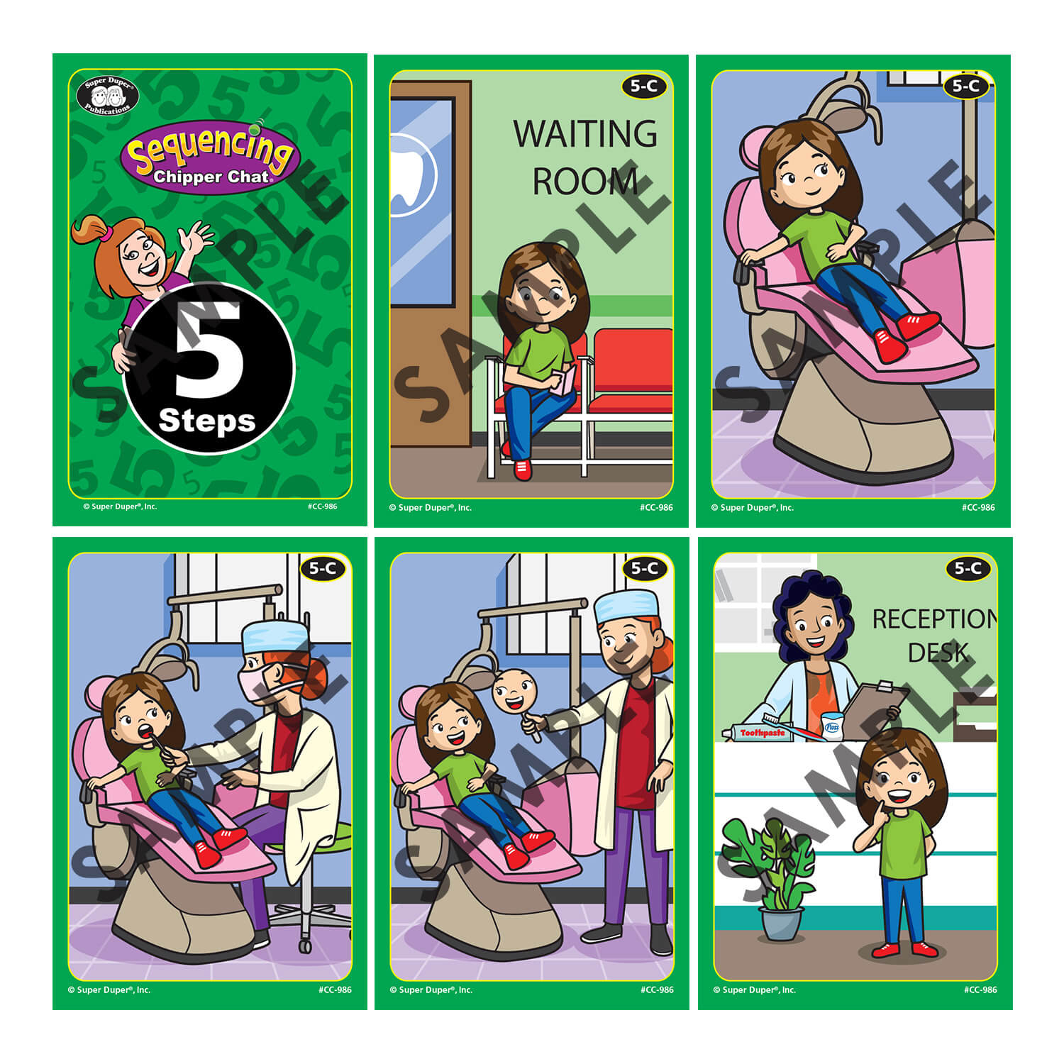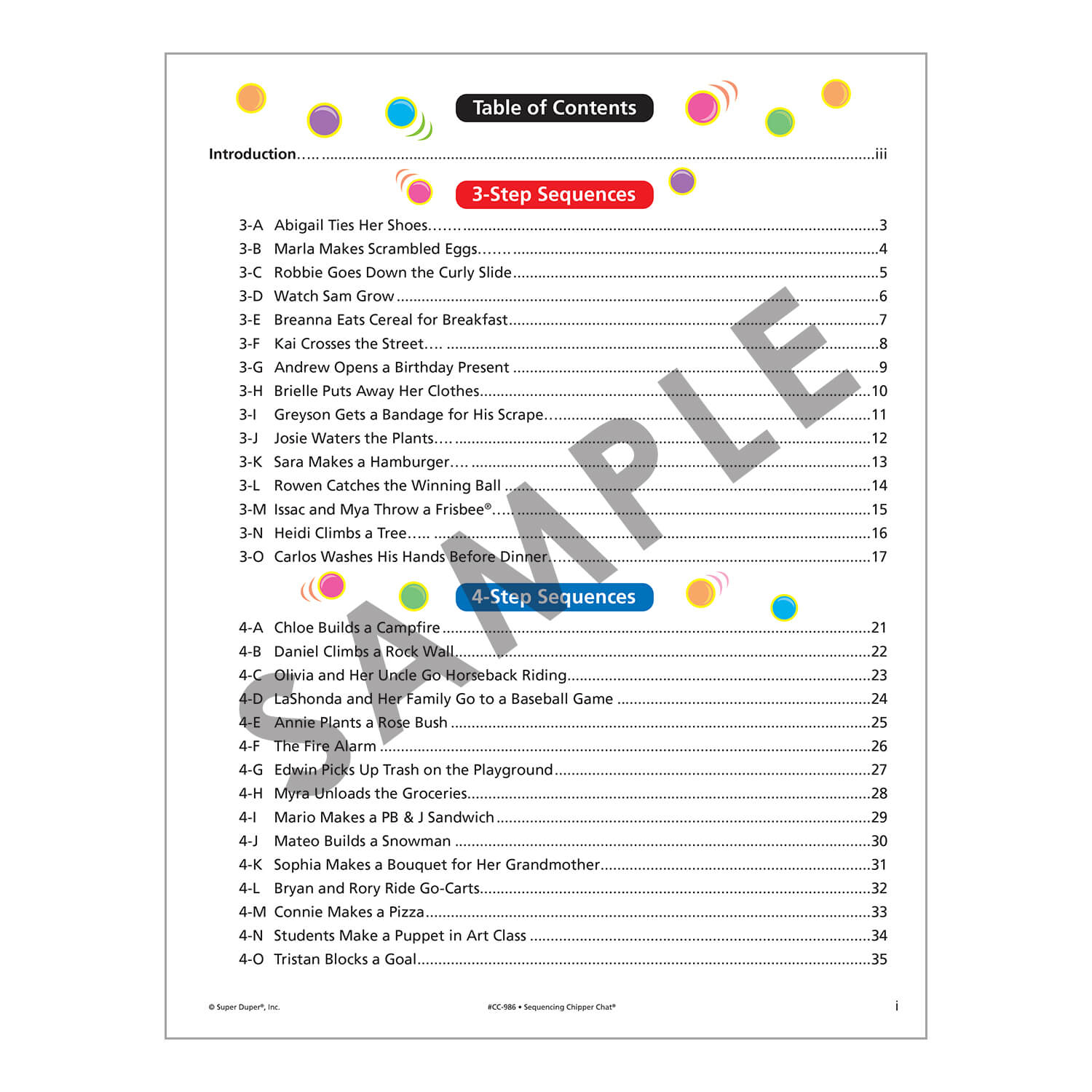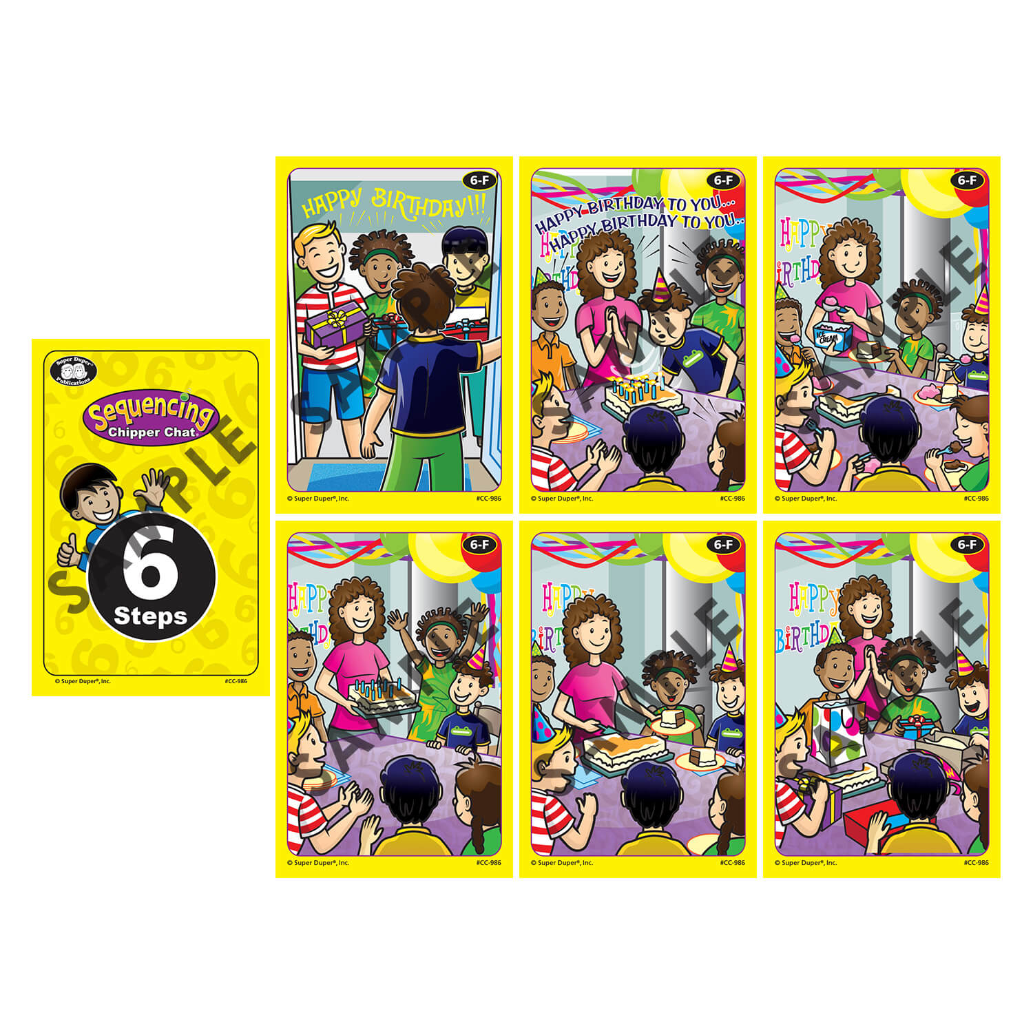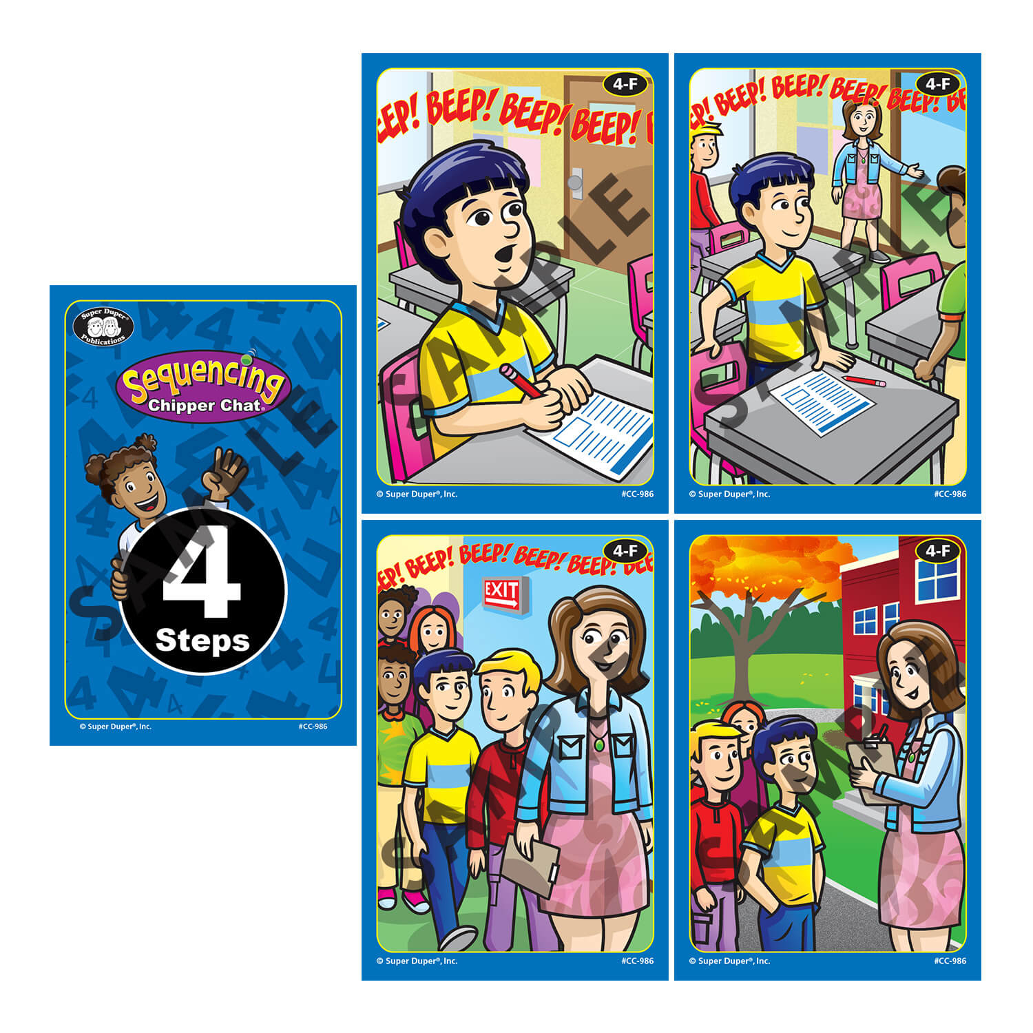 - 270 sequencing cards (15 stories each for 3-, 4-, 5-, and 6-step stories, 2.5” x 3.75”)
