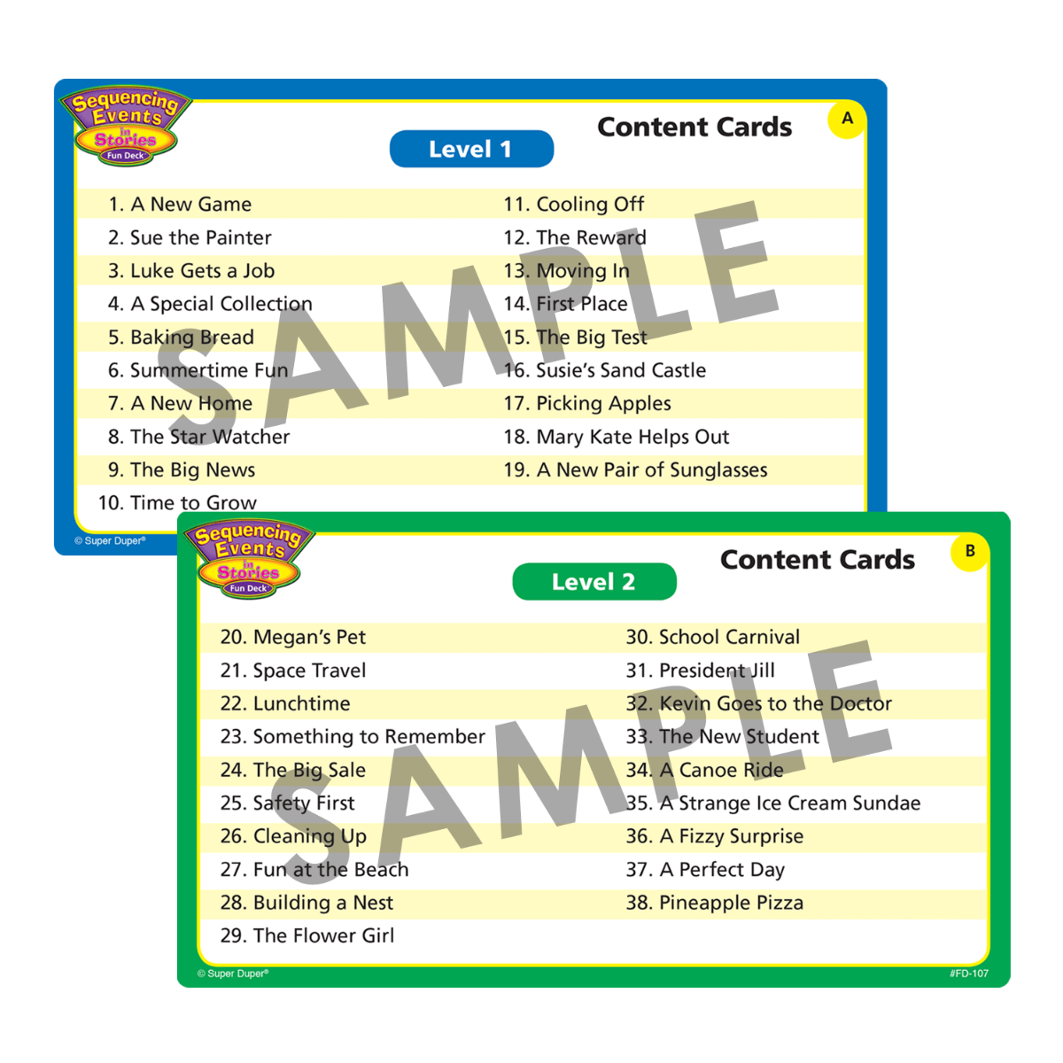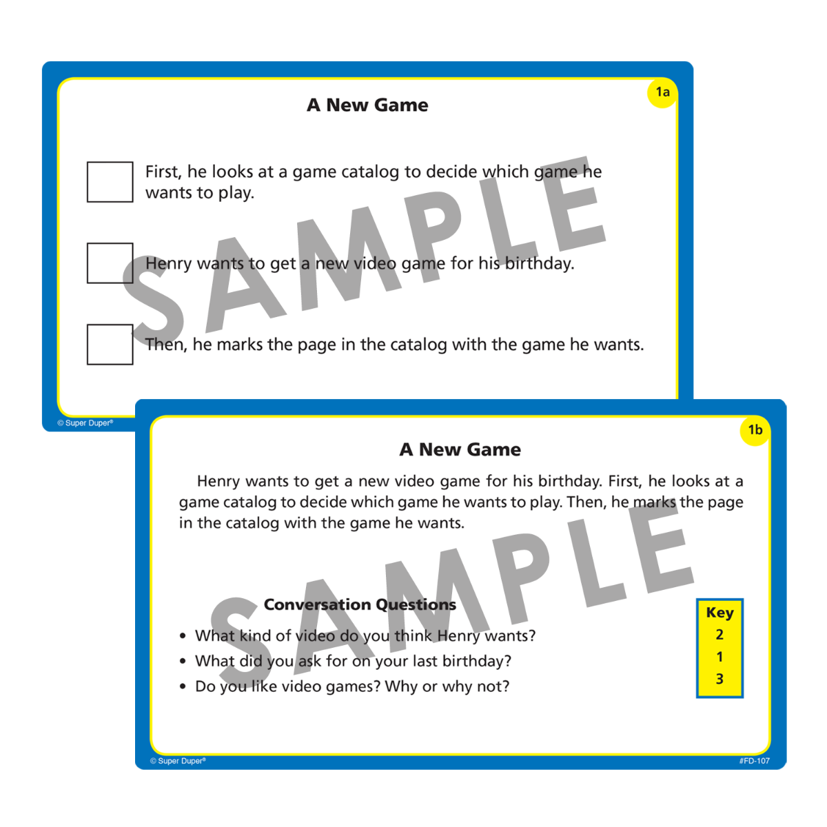 Side B presents the story sentences arranged in correct sequence, an answer key, and three conversation questions for extension. Includes four dry-erase markers—all in a sturdy storage box.