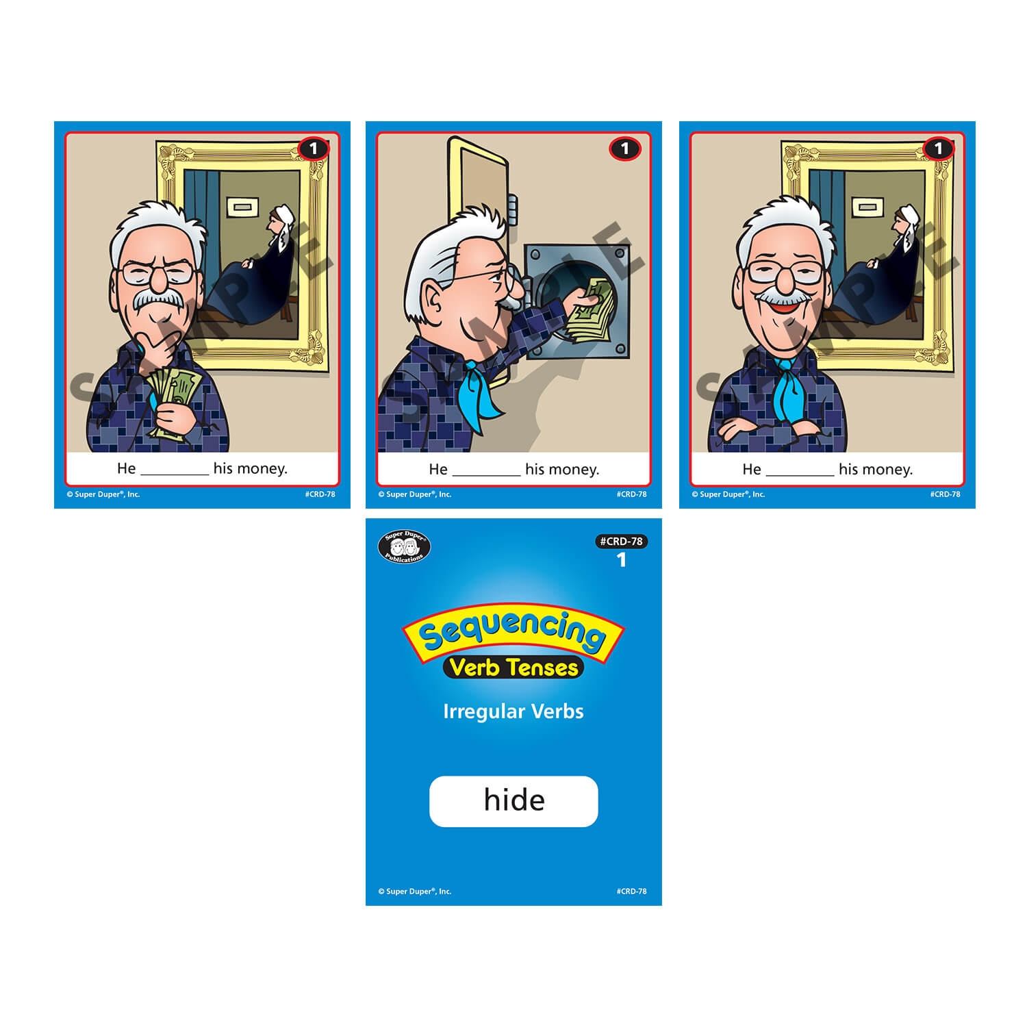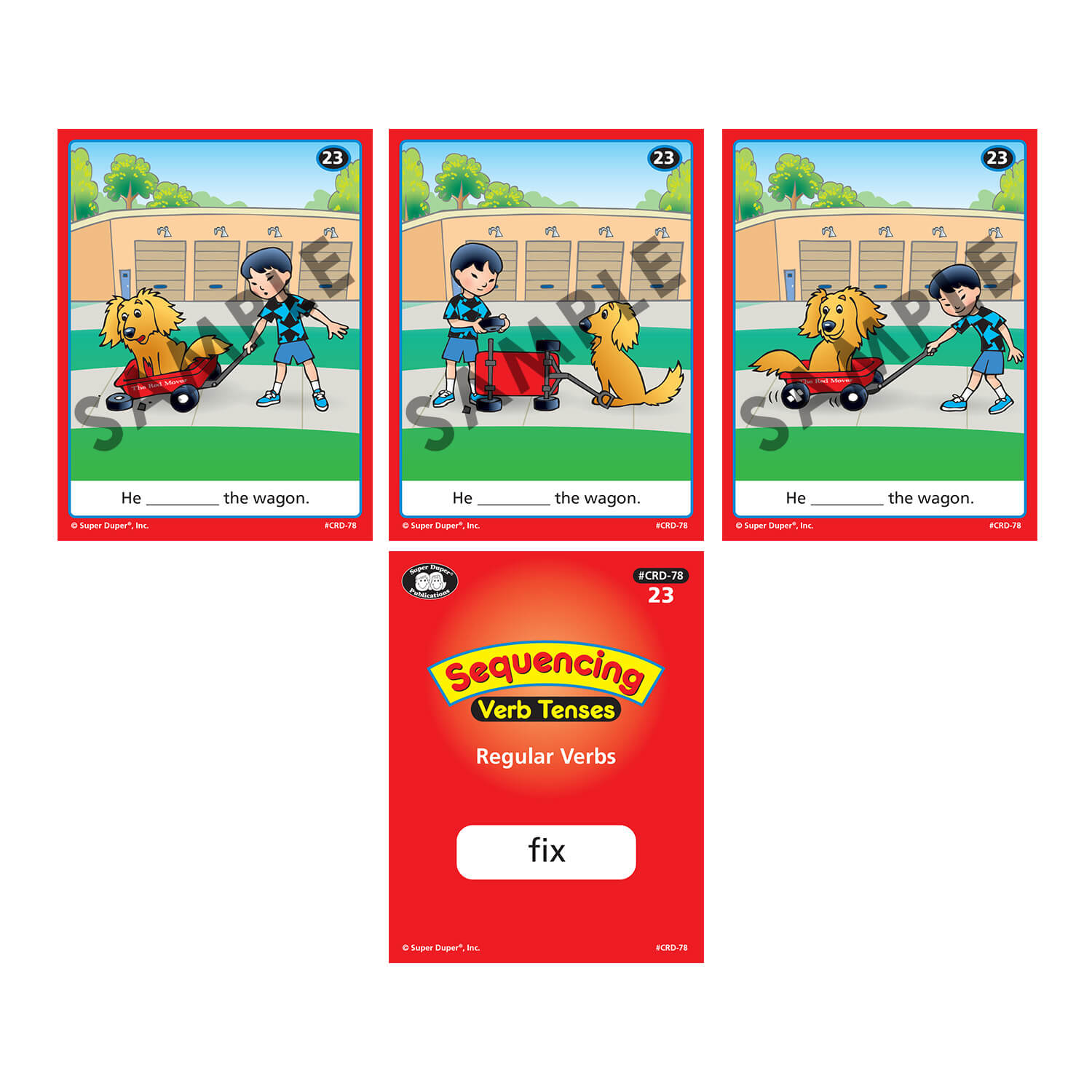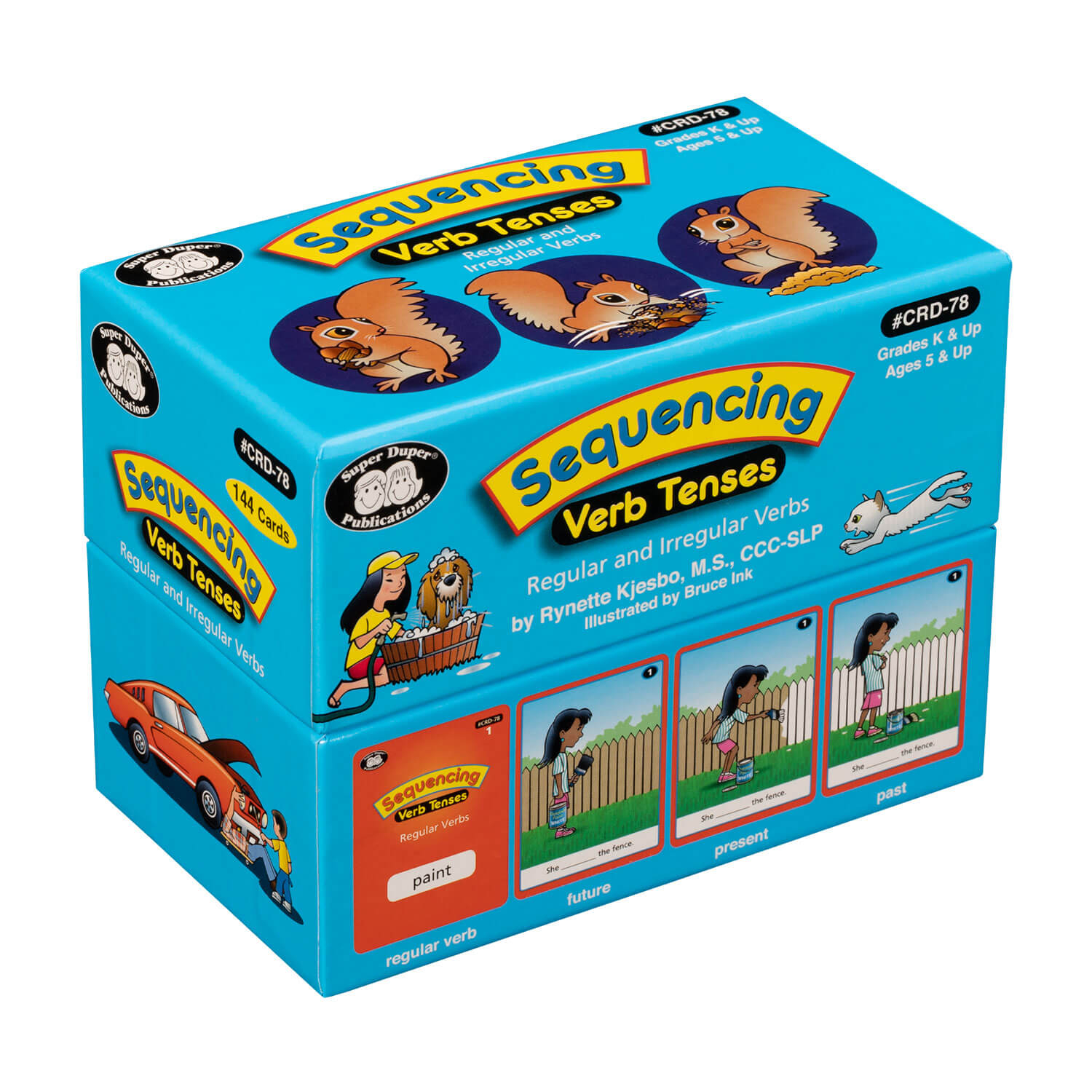 Help students identify and use the past, present, and future tenses of 48 action verbs with the Sequencing Verb Tenses card deck! This card deck contains 24 regular and 24 irregular 3-step, illustrated verb sequences. Choose an action verb to teach, and then have students put the cards in order while filling in the blanks with the correct verb tenses.