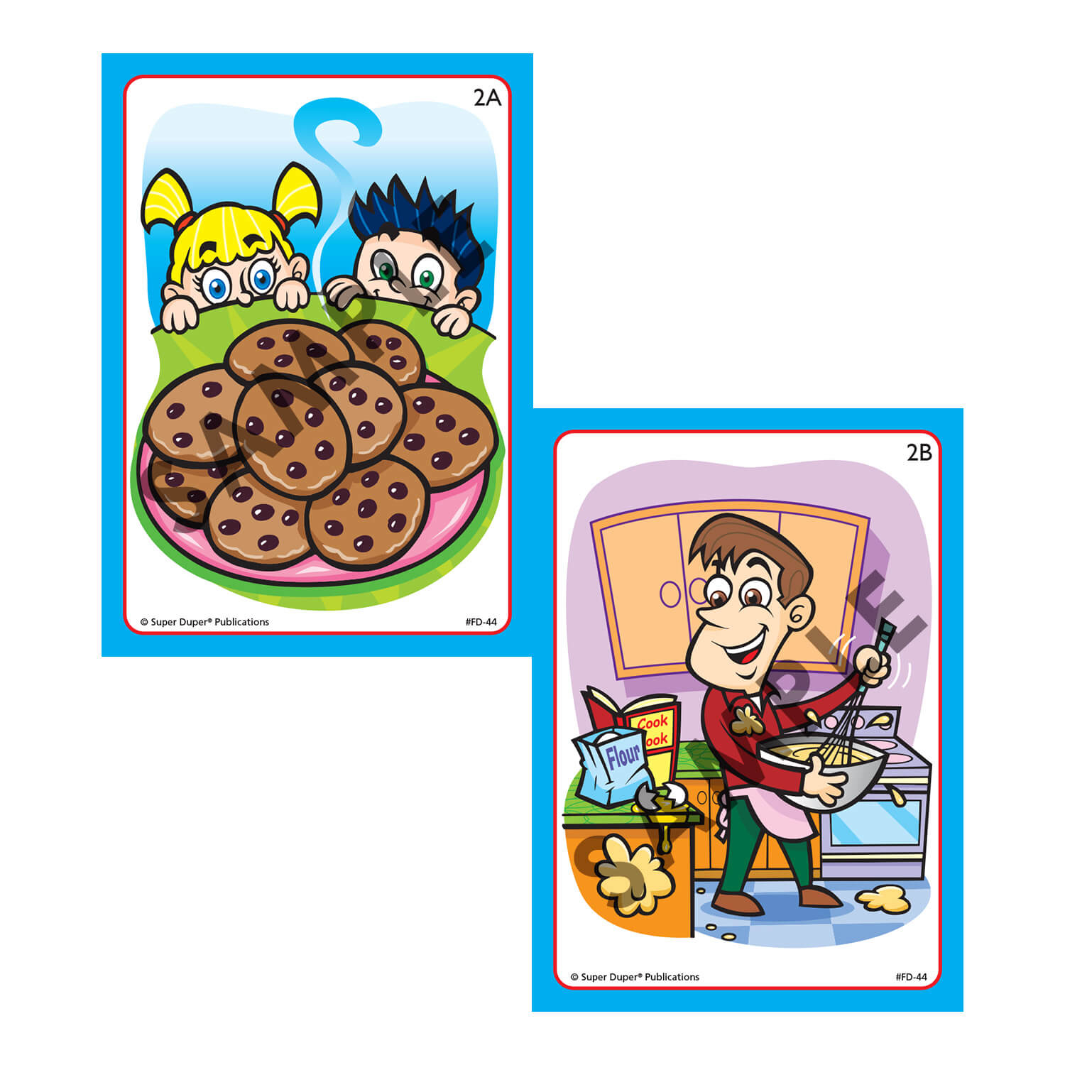 Dad has a tray of yummy cookies…. Tell me how he made them and why the kids want them. The Tell Me How! Tell Me Why! Fun Decktargets reasoning skills for your students. Card A provides an illustrated outcome situation (Mom rocking baby with bottle), while card B is the stimulus situation (Baby crying). Your students must determine how and why the outcome happened (A) by finding the causal card (B).