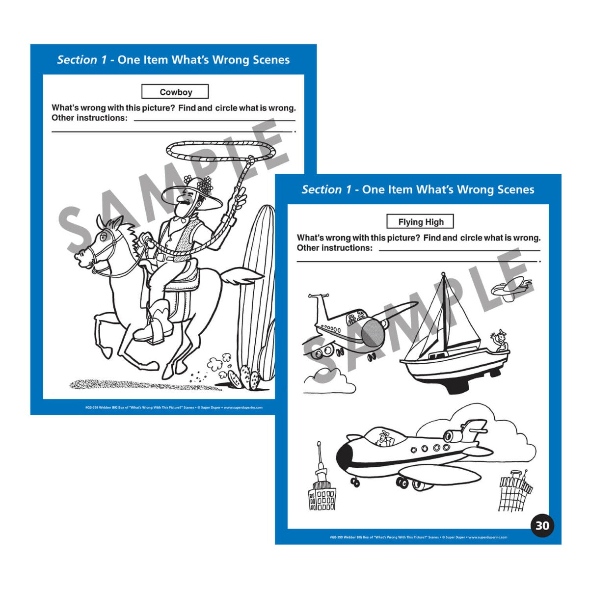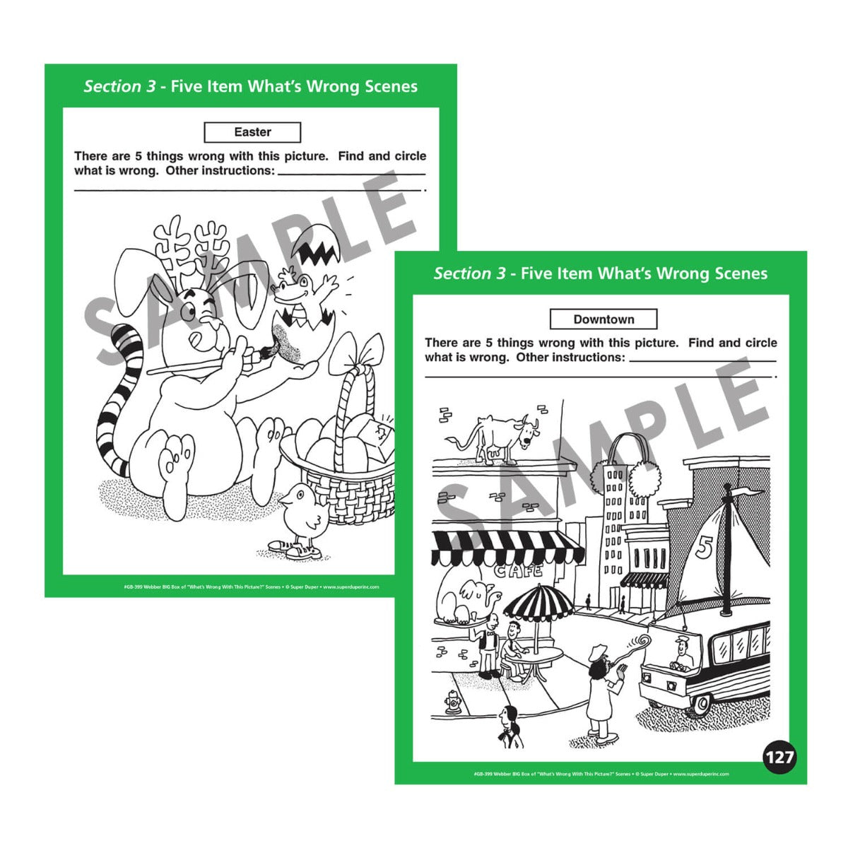 Webber BIG Box of “What’s Wrong with This Picture?” Scenes offers students an amusing way to develop receptive and expressive language skills as they practice identifying absurdities, problem solving, and storytelling. Students circle and then explain what is wrong in the picture. Wet-erase marks can be wiped off after every lesson. Your students will have lots of fun during language time talking and laughing about these silly scenes.
