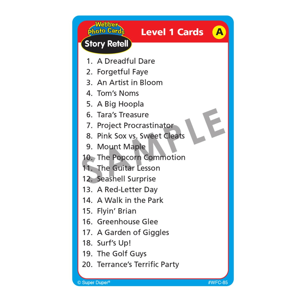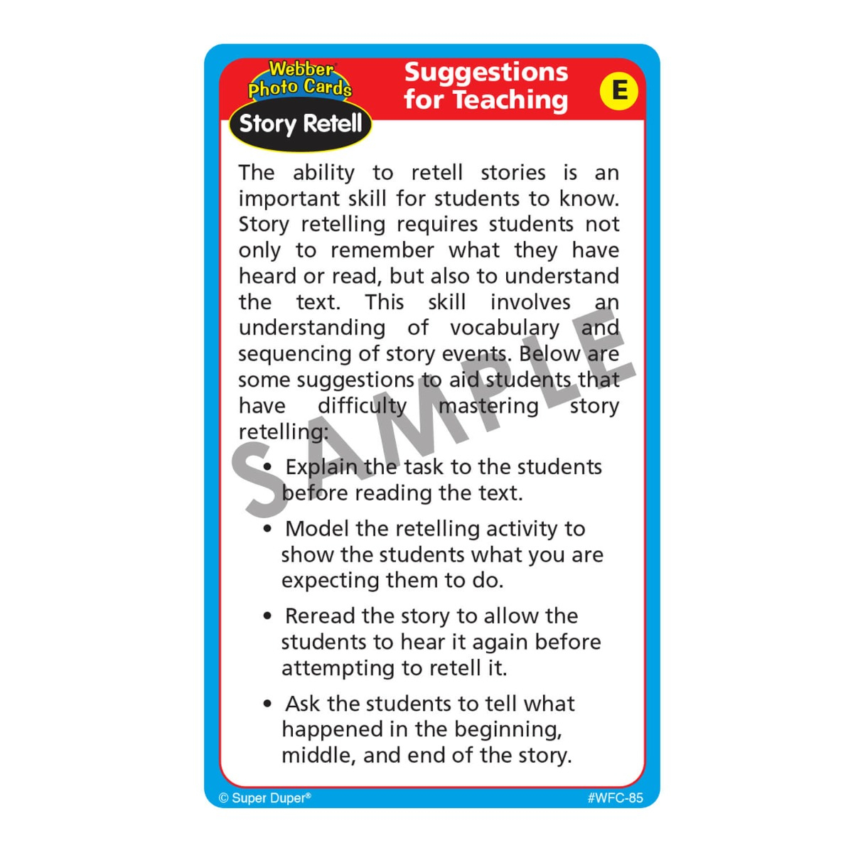 Story retelling requires students not only to remember what they hear or read, but also to comprehend it. Webber Photo Cards – Story Retell helps students learn important skills involved in understanding vocabulary and sequencing events of a story.