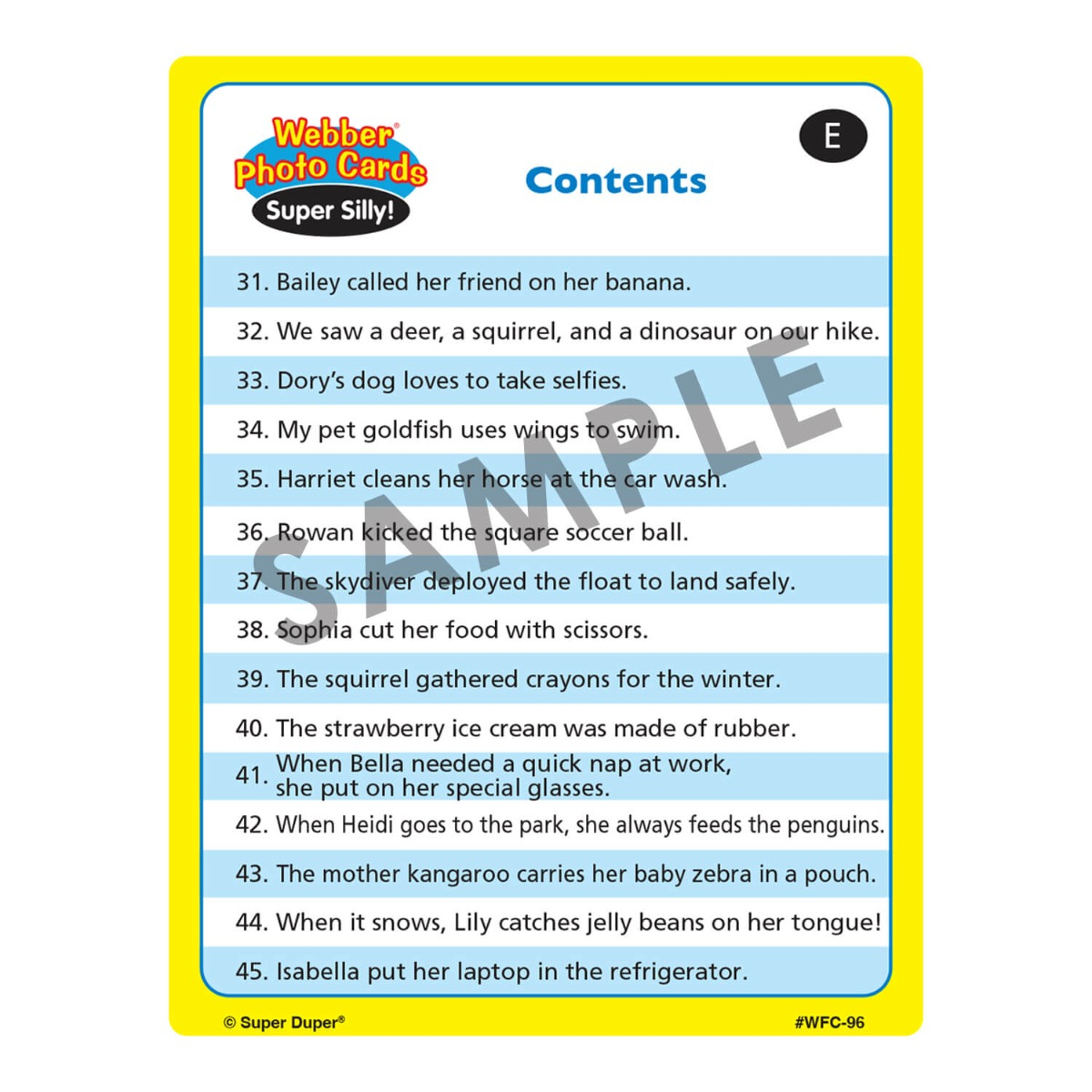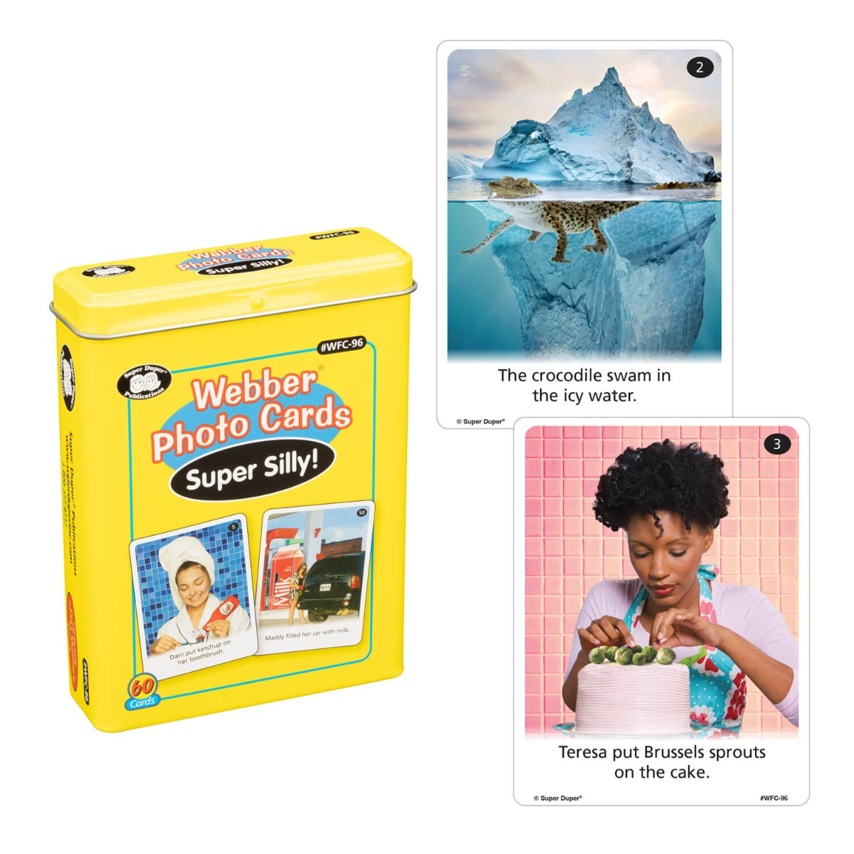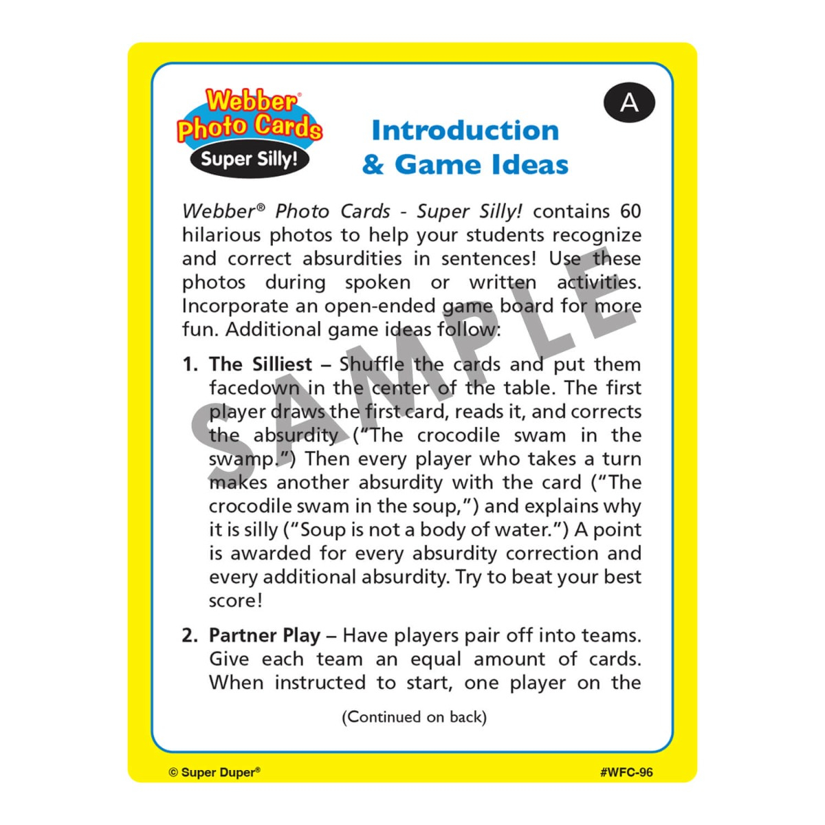 That’s silly! With Webber Photo Cards – Super Silly!, students will be excited to recognize and correct these laugh-out-loud absurdities in sentences. Absurdities are based on attributes, such as function and composition. These 60 dazzling photo cards can be used with limitless activities; an index and game ideas are included!
