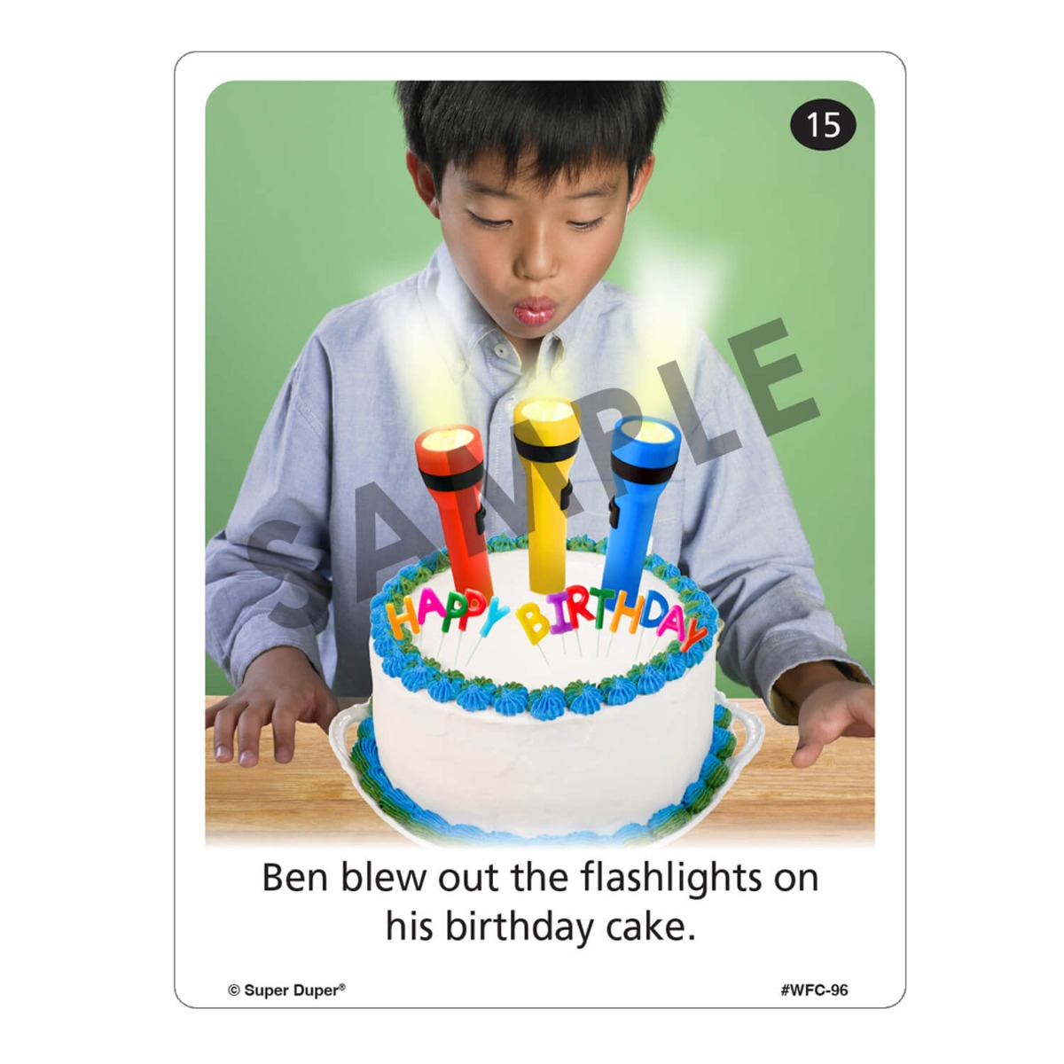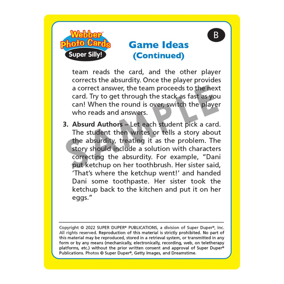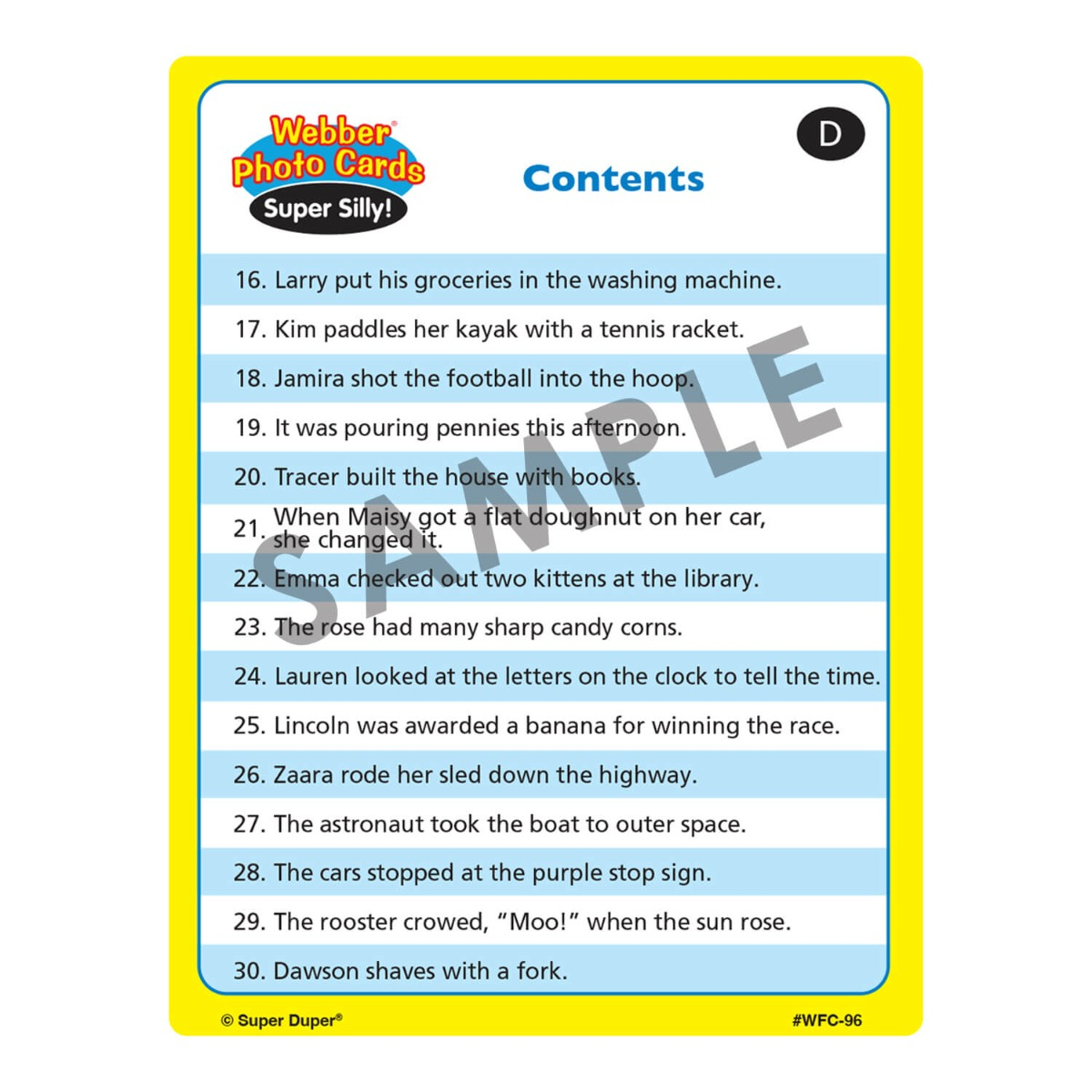 That’s silly! With Webber Photo Cards – Super Silly!, students will be excited to recognize and correct these laugh-out-loud absurdities in sentences. Absurdities are based on attributes, such as function and composition. These 60 dazzling photo cards can be used with limitless activities; an index and game ideas are included!