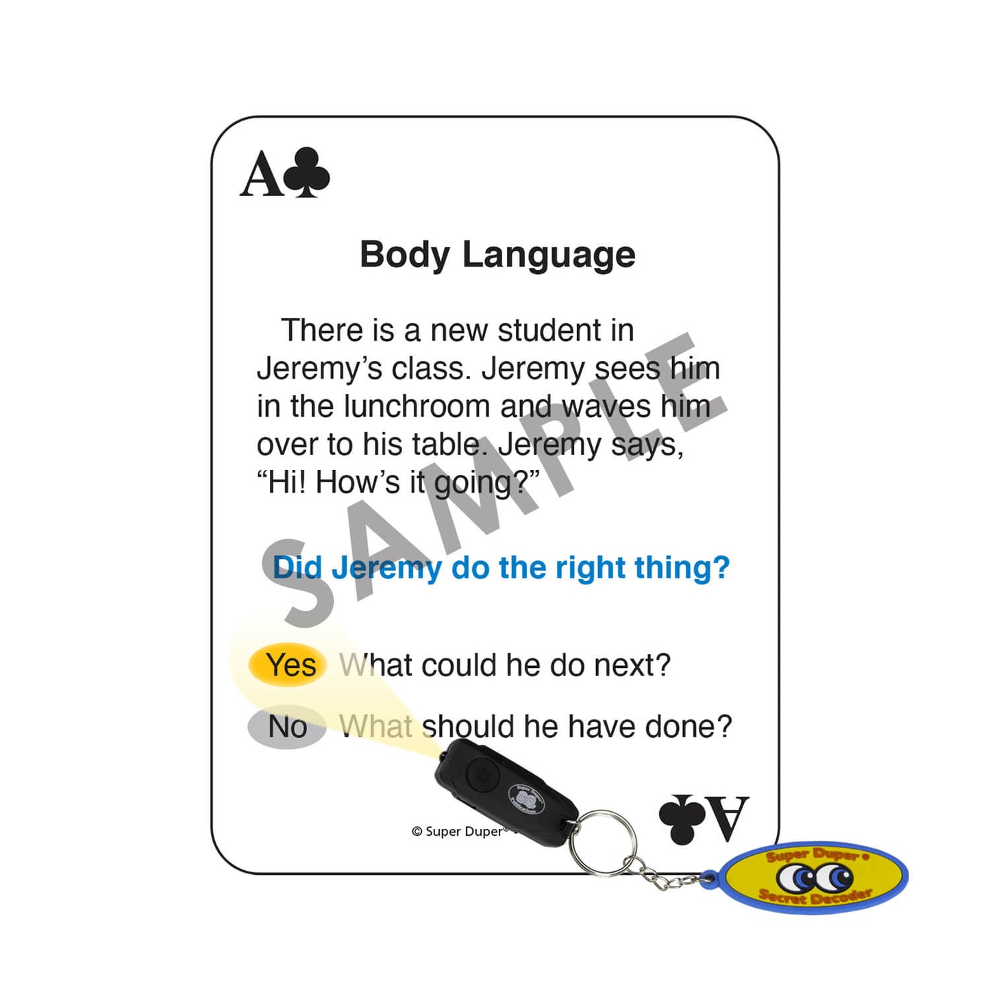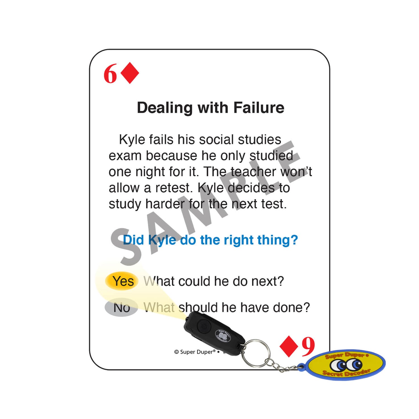 While playing fun games like Crazy Eights, Hearts, and Old Maid, students will learn how to make introductions, use proper body language, deal with anger, stay on topic, show respect, and more. Students answer the question on the card and then use the Secret Decoder to check their answers! Follow-up questions invite open-ended discussions about the situation.
