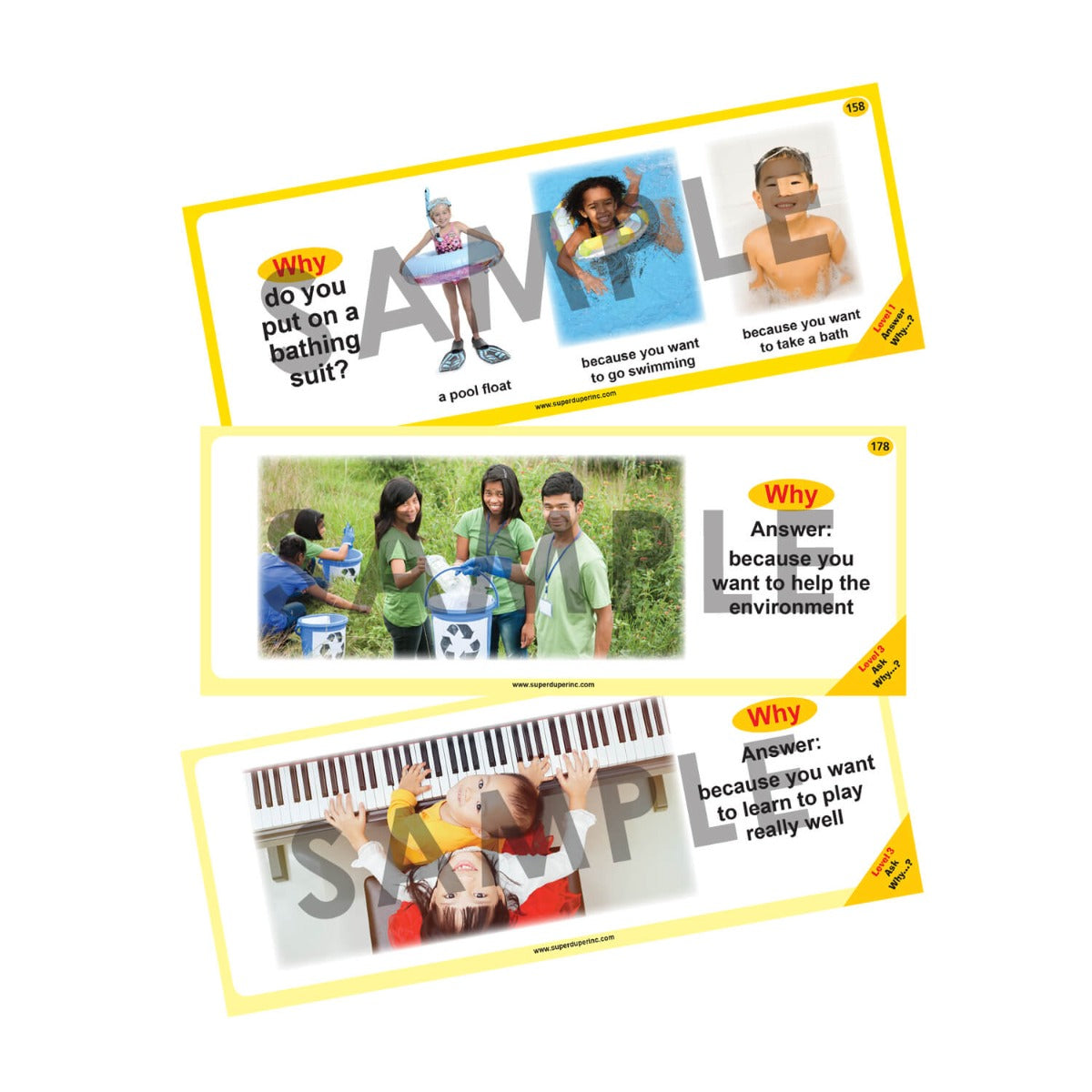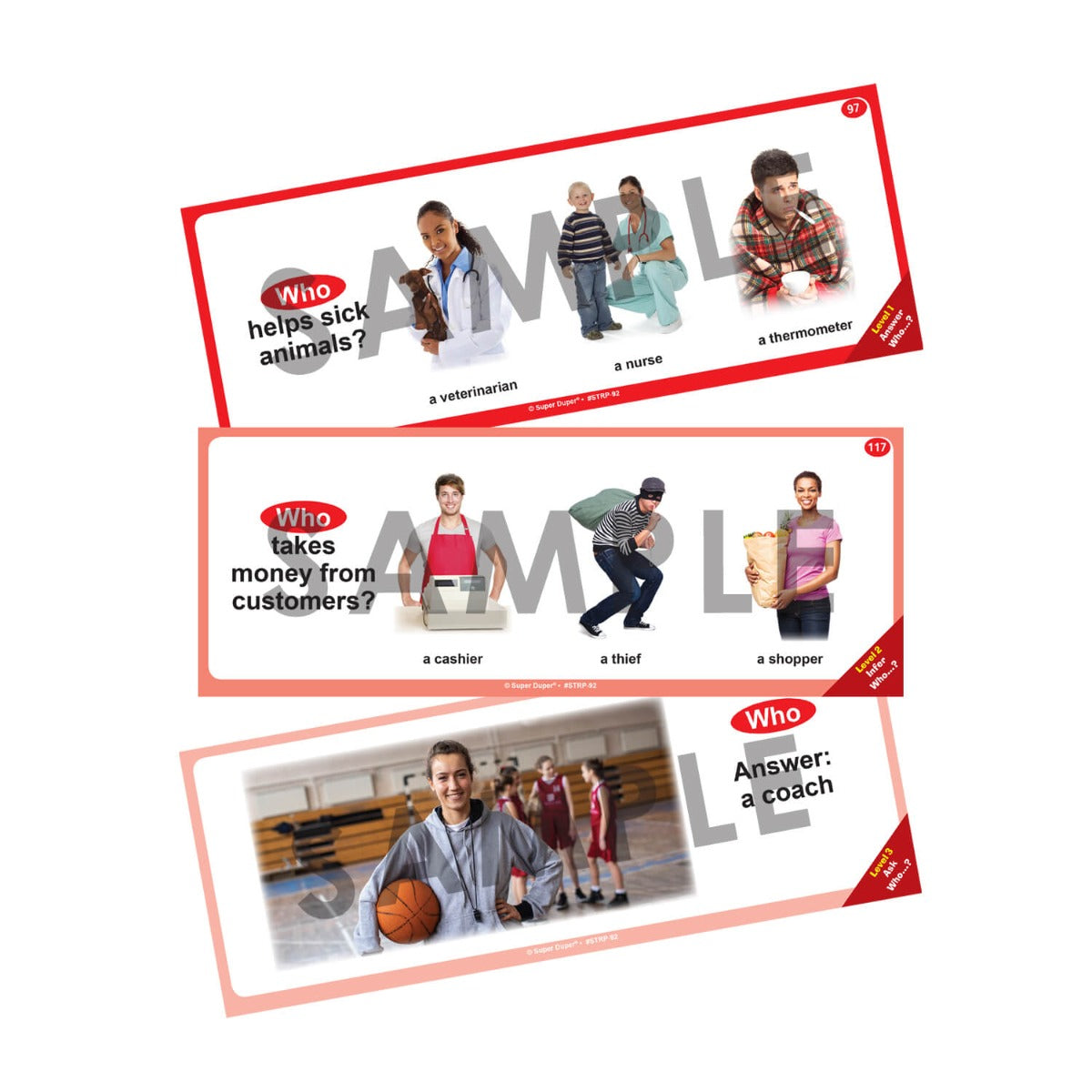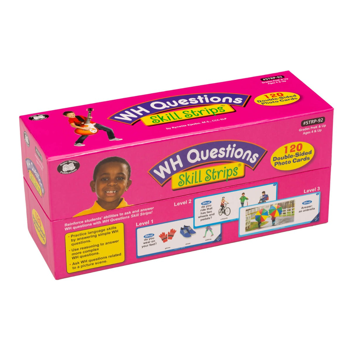 Students need to be able to ask and answer WH questions in order to participate in conversations, demonstrate knowledge, and gather information about their world. WH Questions Skill Strips contains 120 double-sided cards (arranged in developmental sequence) to reinforce students' abilities to ask and answer WH questions across three levels of difficulty: