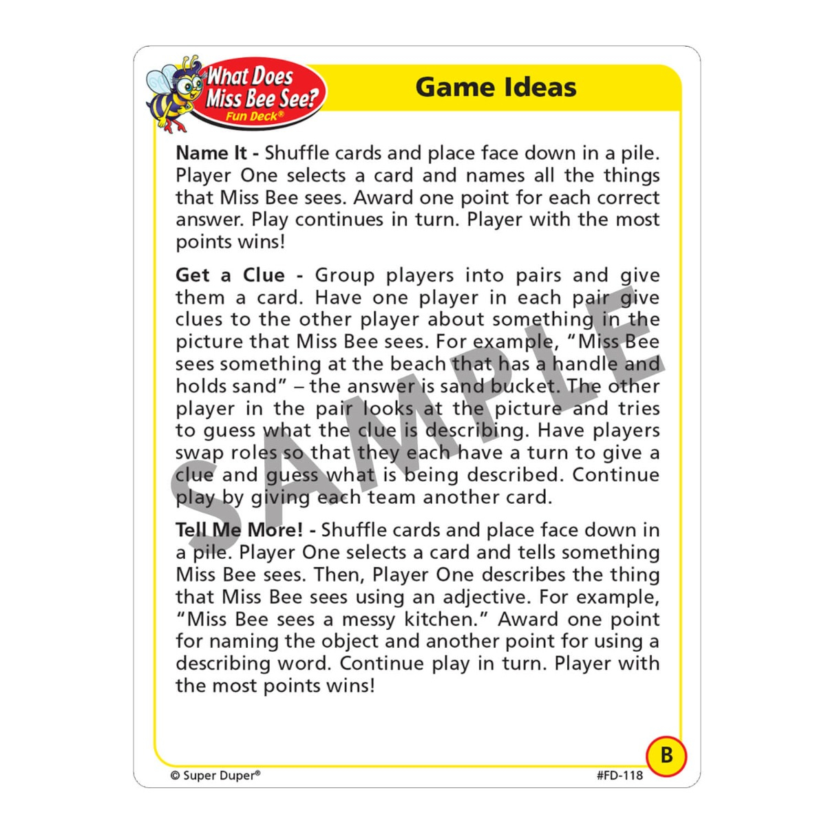 Students improve their naming, describing, inferencing, and visual skills with this engaging What Does Miss Bee See? Fun Deck.