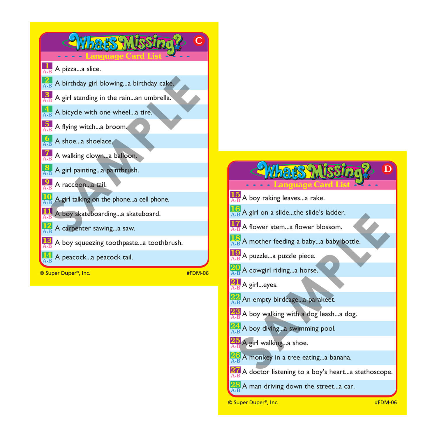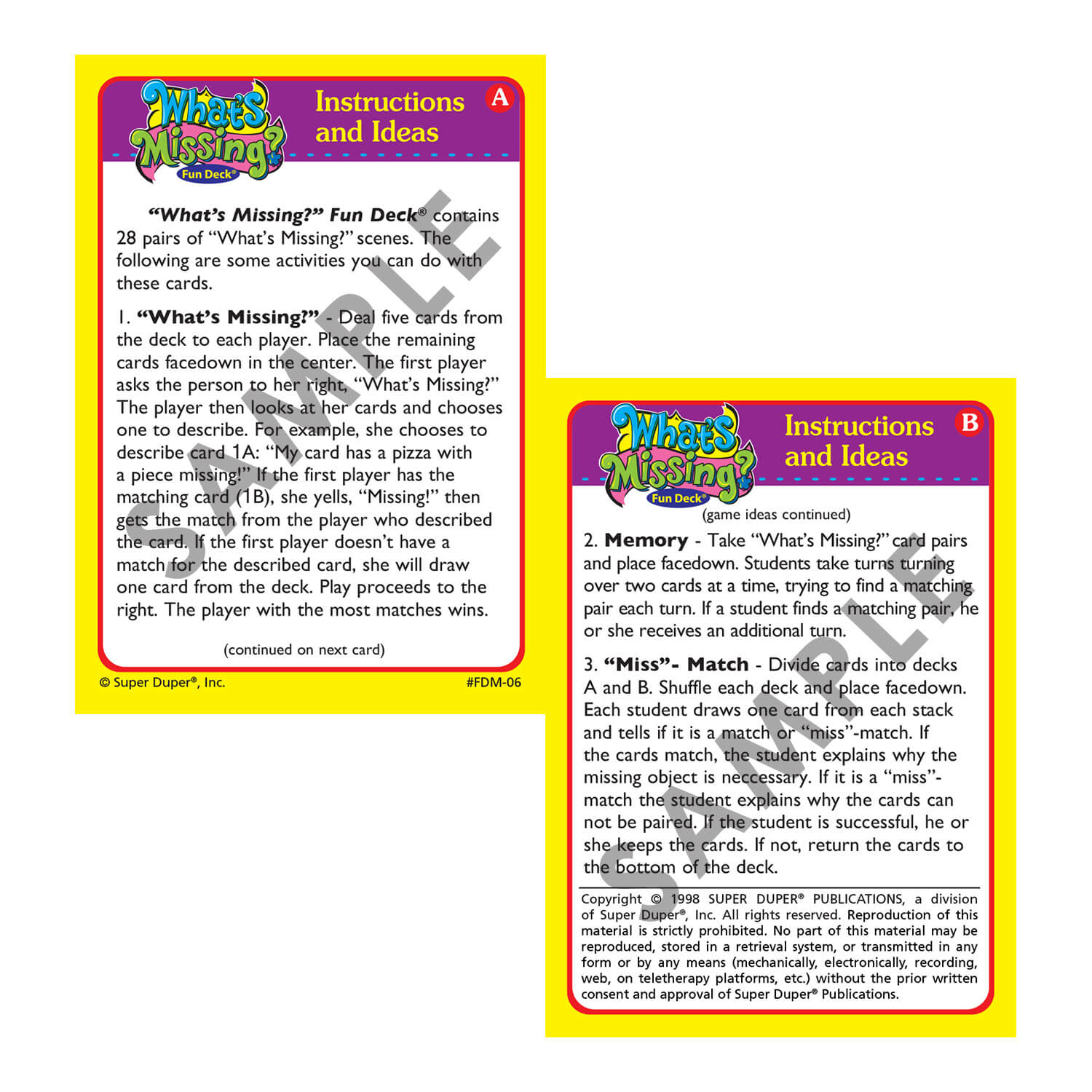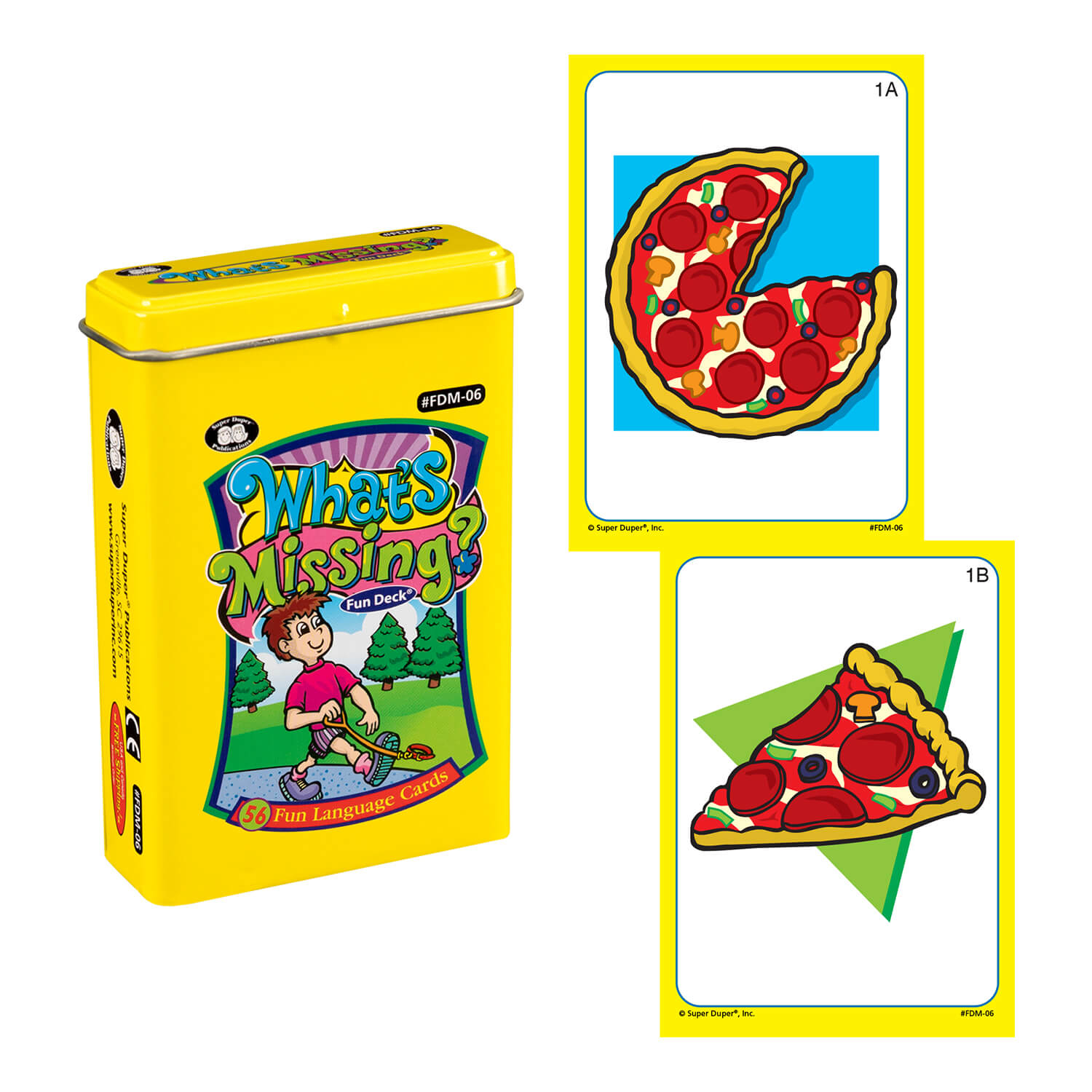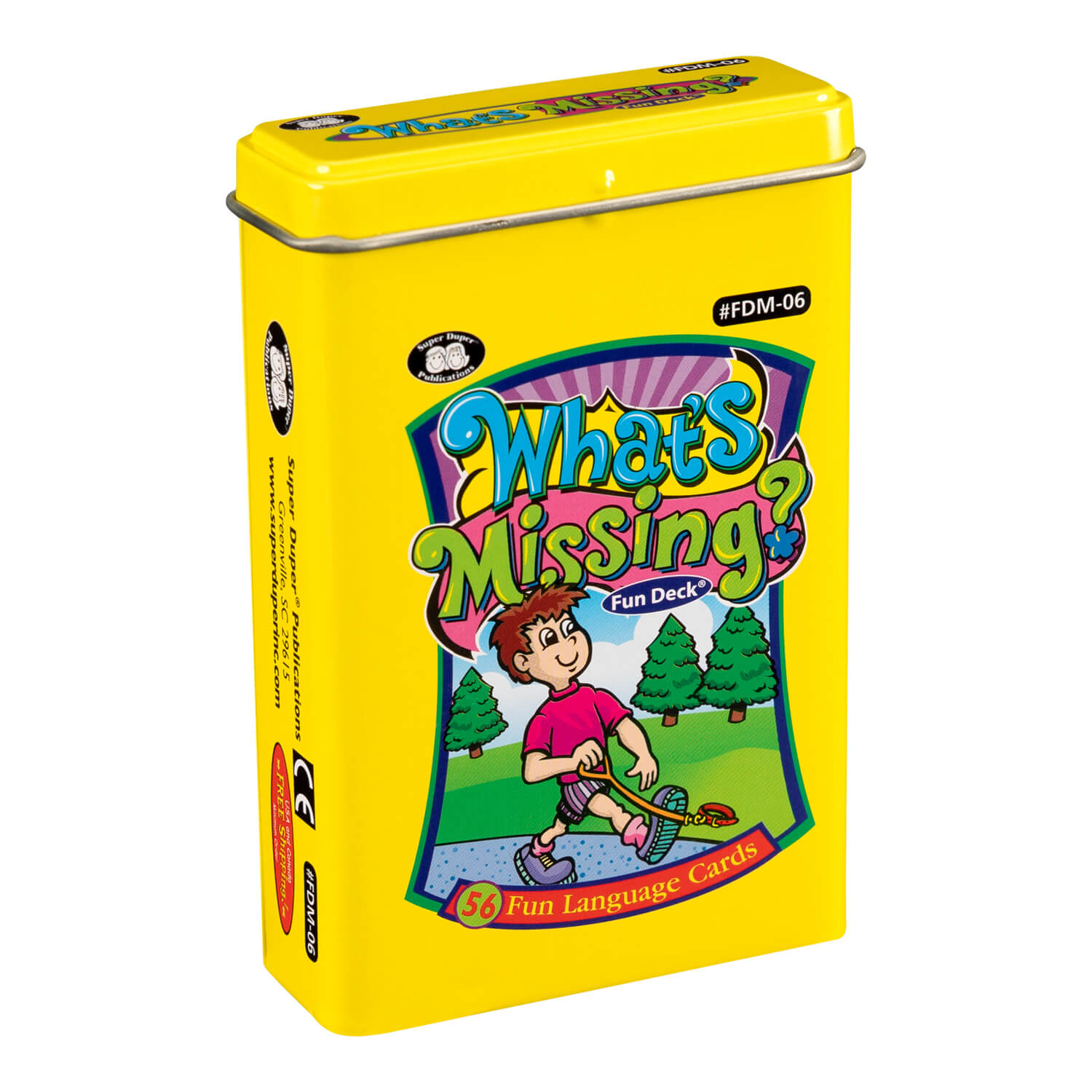 Where is her shoe? Your students will love searching for the missing items in this delightful What's Missing Fun Deck. Each set includes 56 (28 pairs) fun, colorful language cards. These cards help in development of problem solving skills and keep interest levels high.