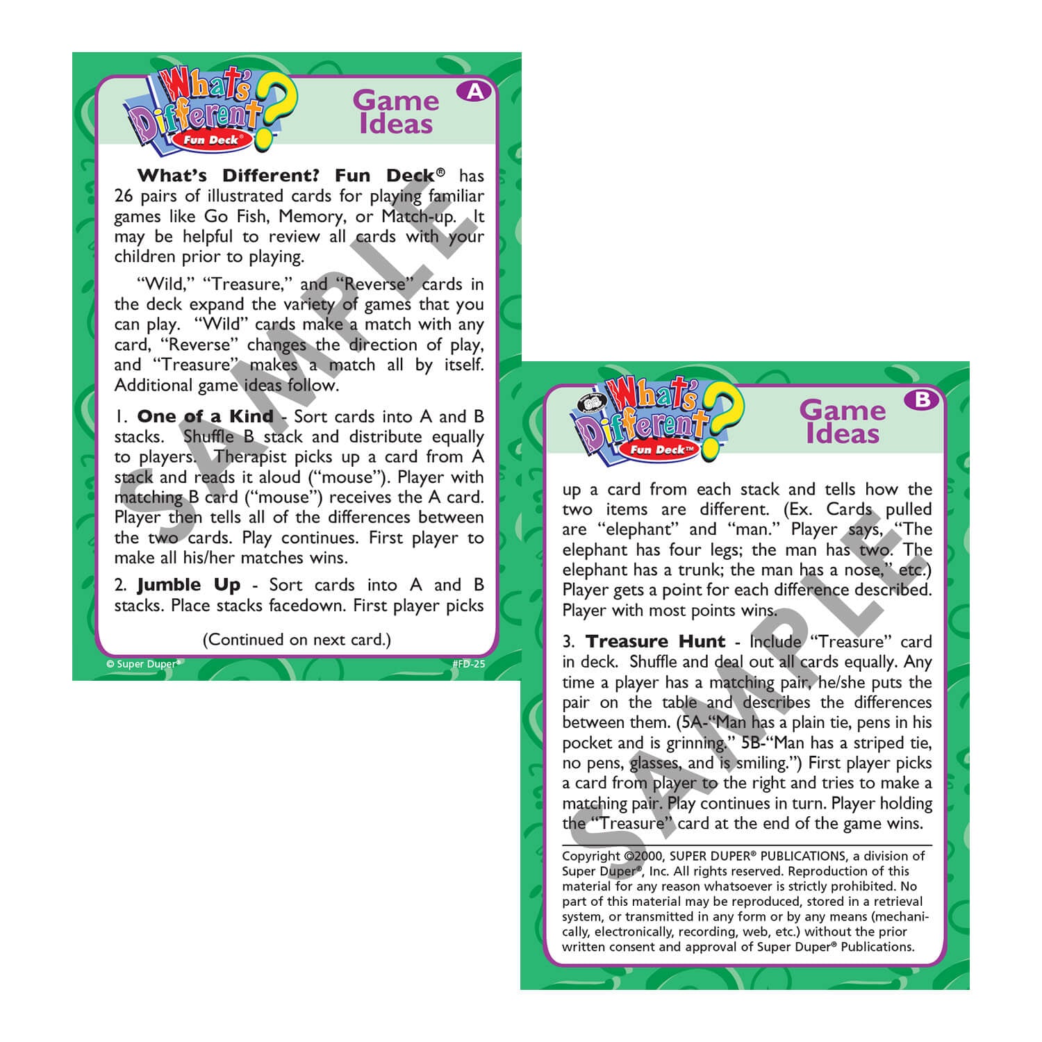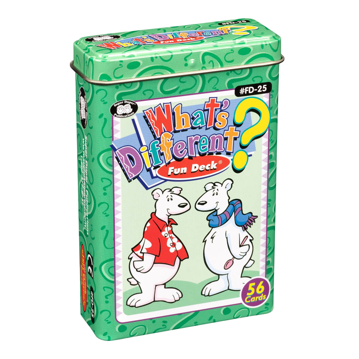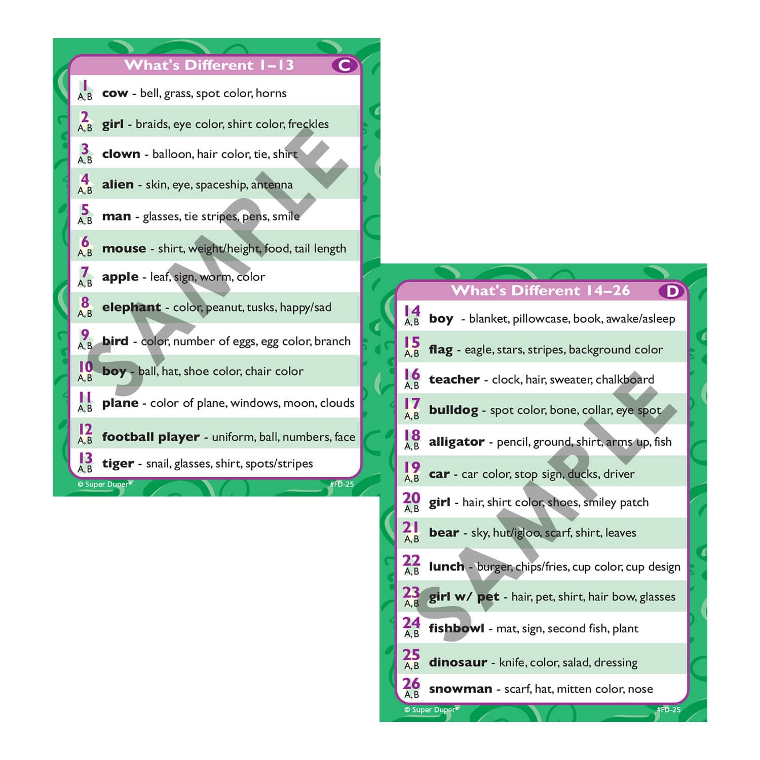 Can you see the differences? This 56-card deck has 26 match-up pairs of pictures with minimal to obvious differences, which will help your kids build visual discrimination skills. Your students will love the challenge of locating the differences between the cards.