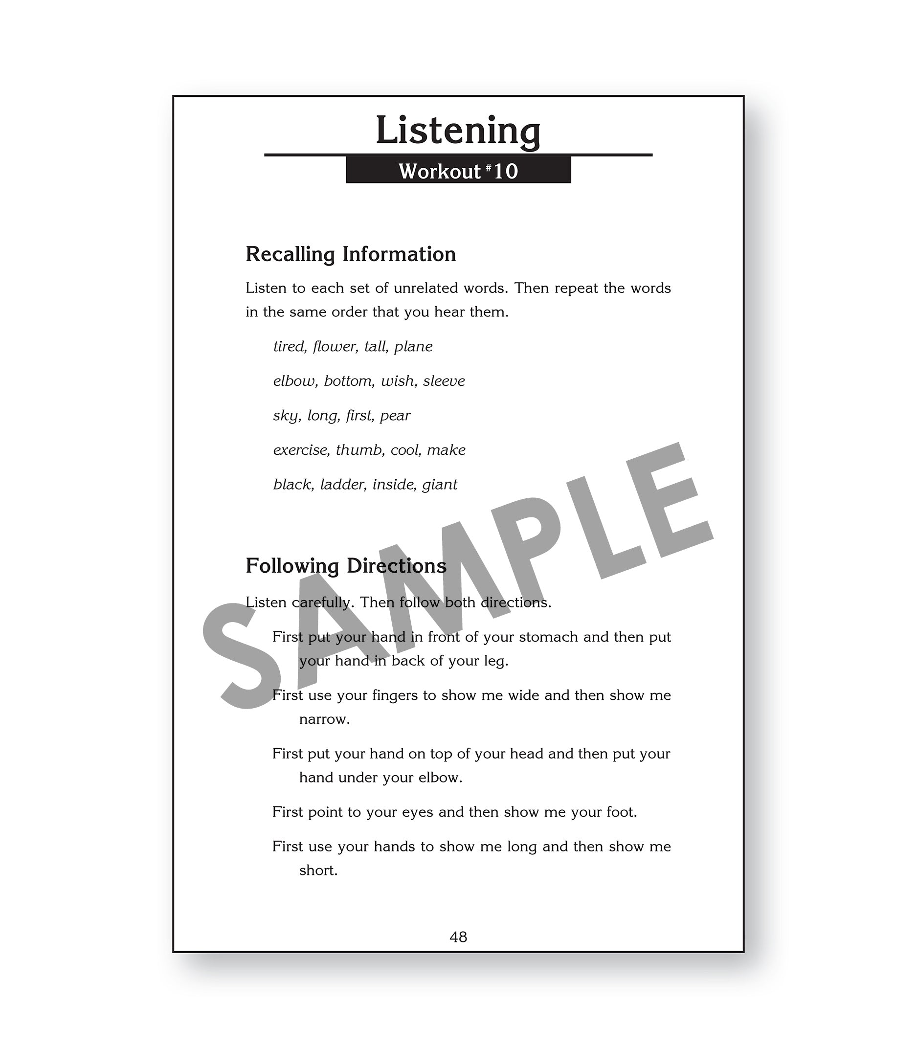 Make a workout out of listening! Working Out with Listening contains 50 quick and easy-to-use "workouts" that provide listening practice and reinforce listening skills. The three activities in this book include: Recalling information. Following directions. Listening for details and main ideas. Use these activities as "warm-ups" before lessons, "cool downs" after instruction, or as quick review exercises at school or at home. 130 pages (6" x 9").